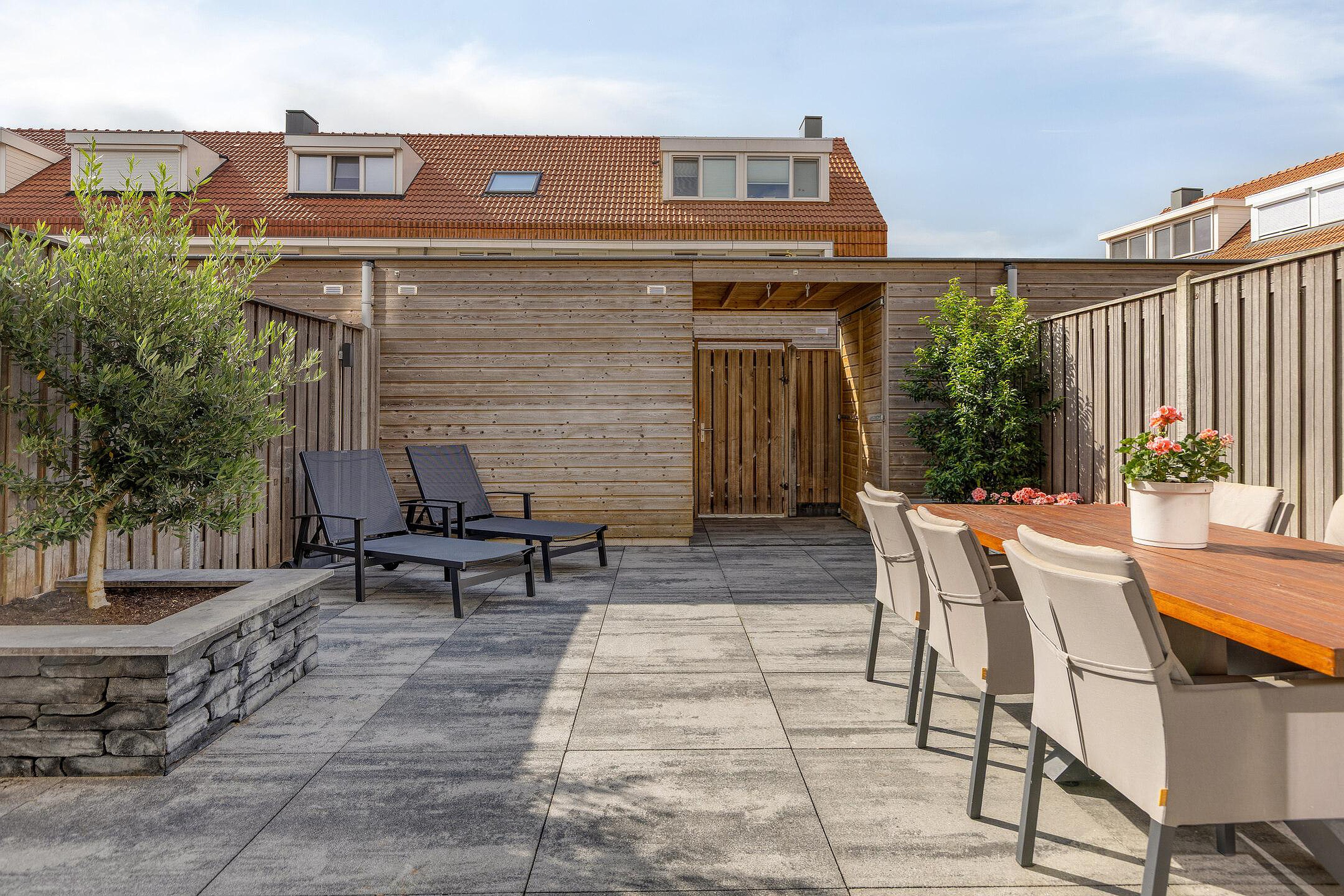 De verzorgde zonnige achtertuin is onderhoudsvrij aangelegd, voorzien van diverse plantenborders en bestraat met een groot formaat grijze tegel. De tuin beschikt over een vrijstaande houten berging met overkapping en een achterom.