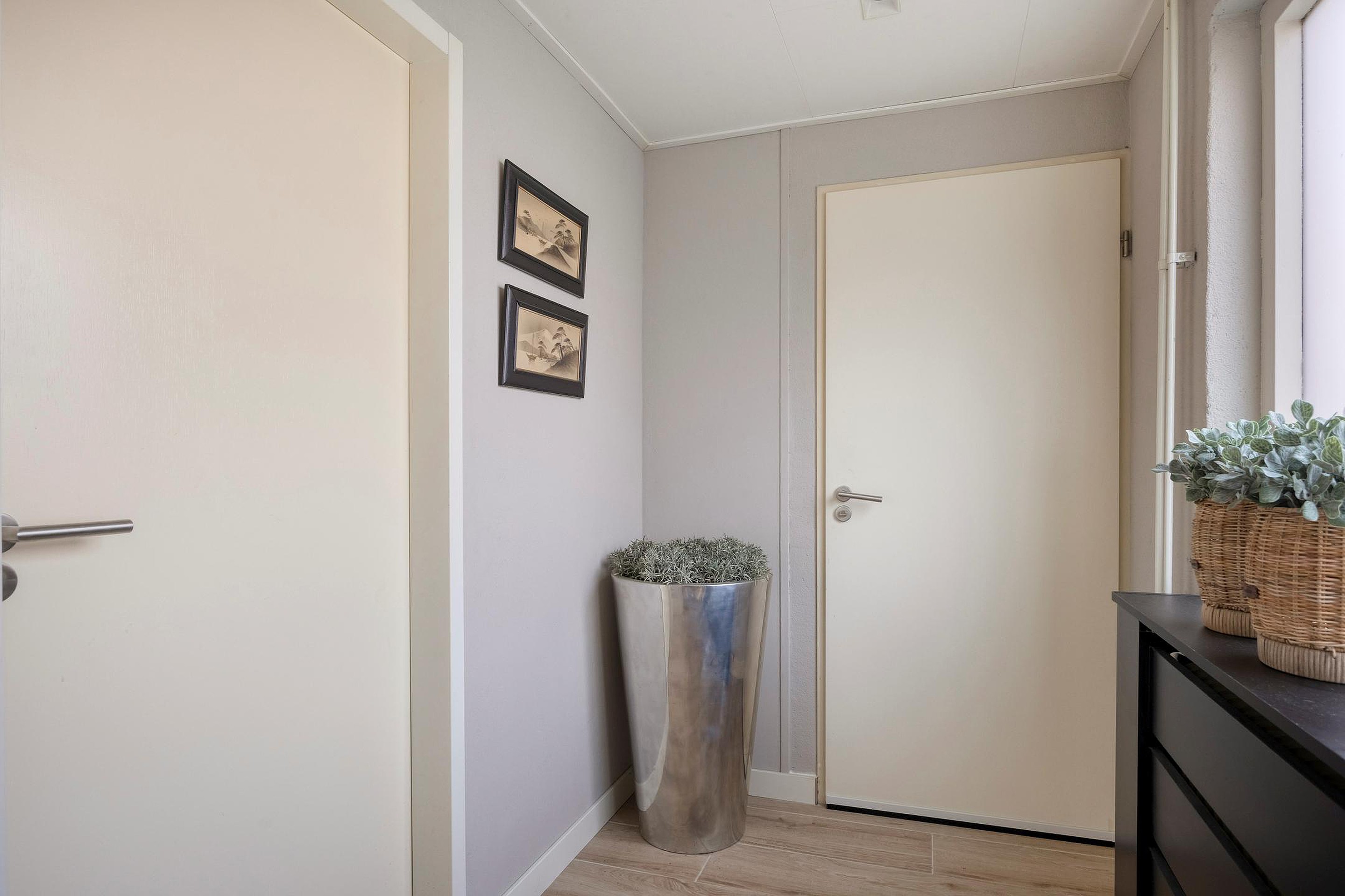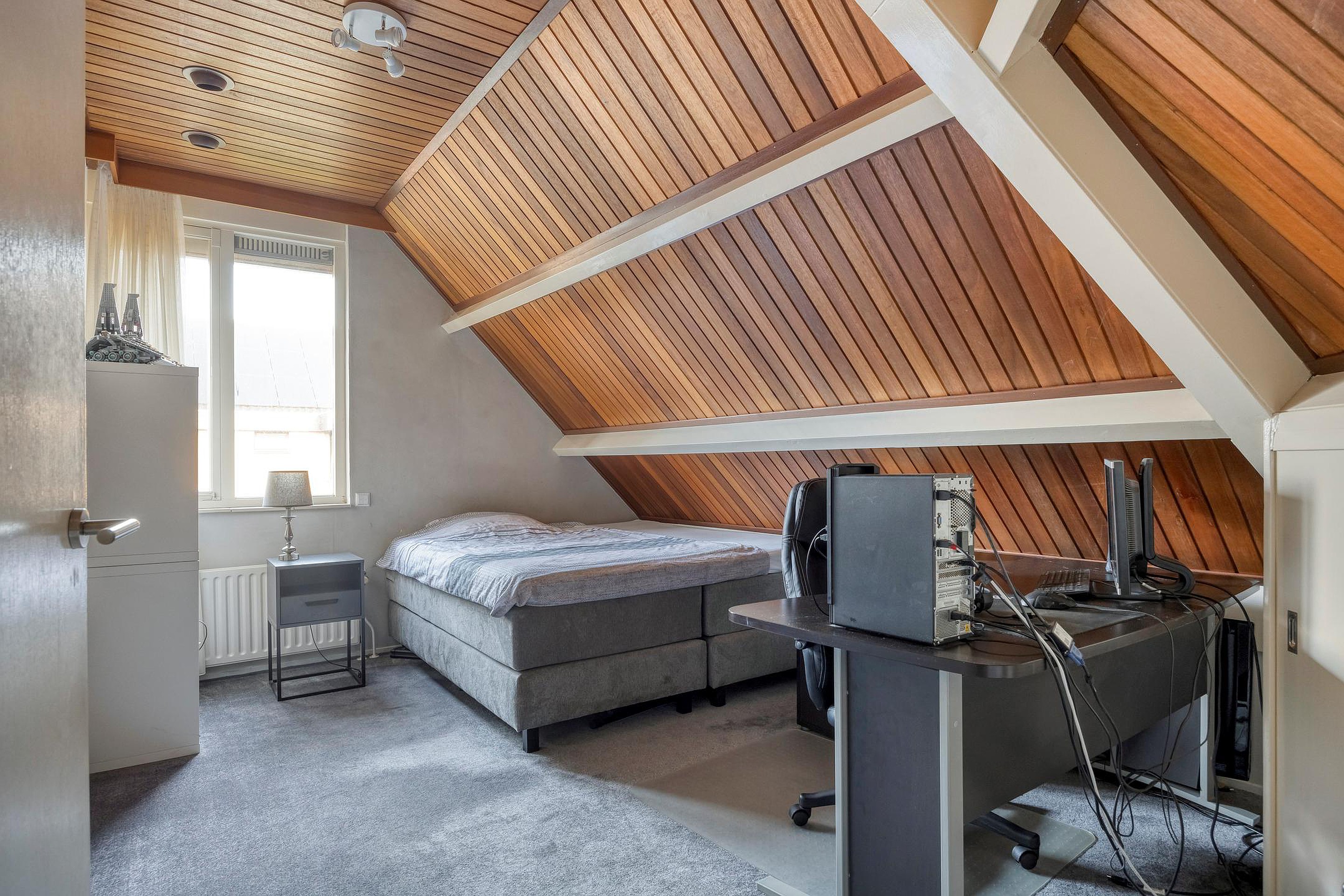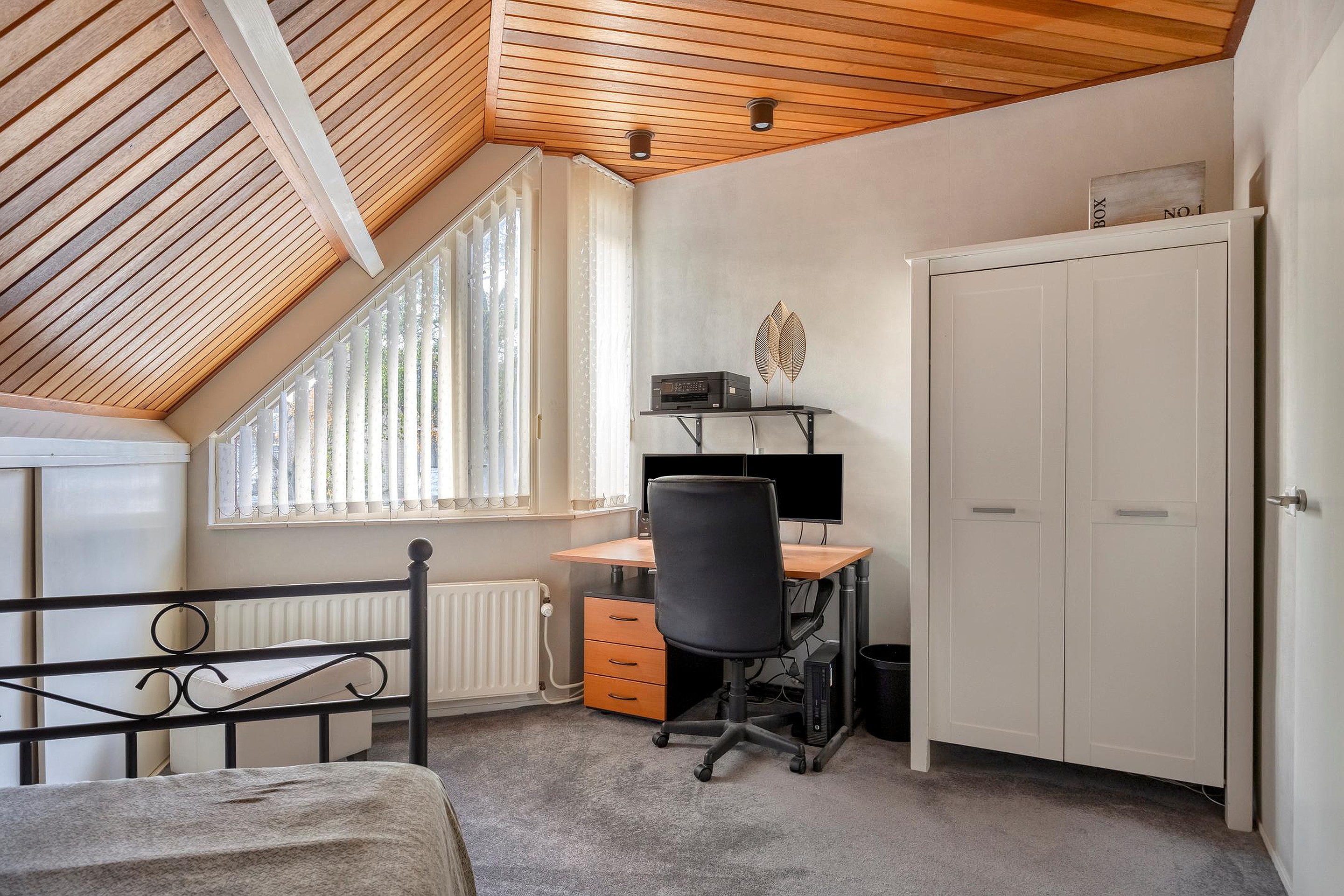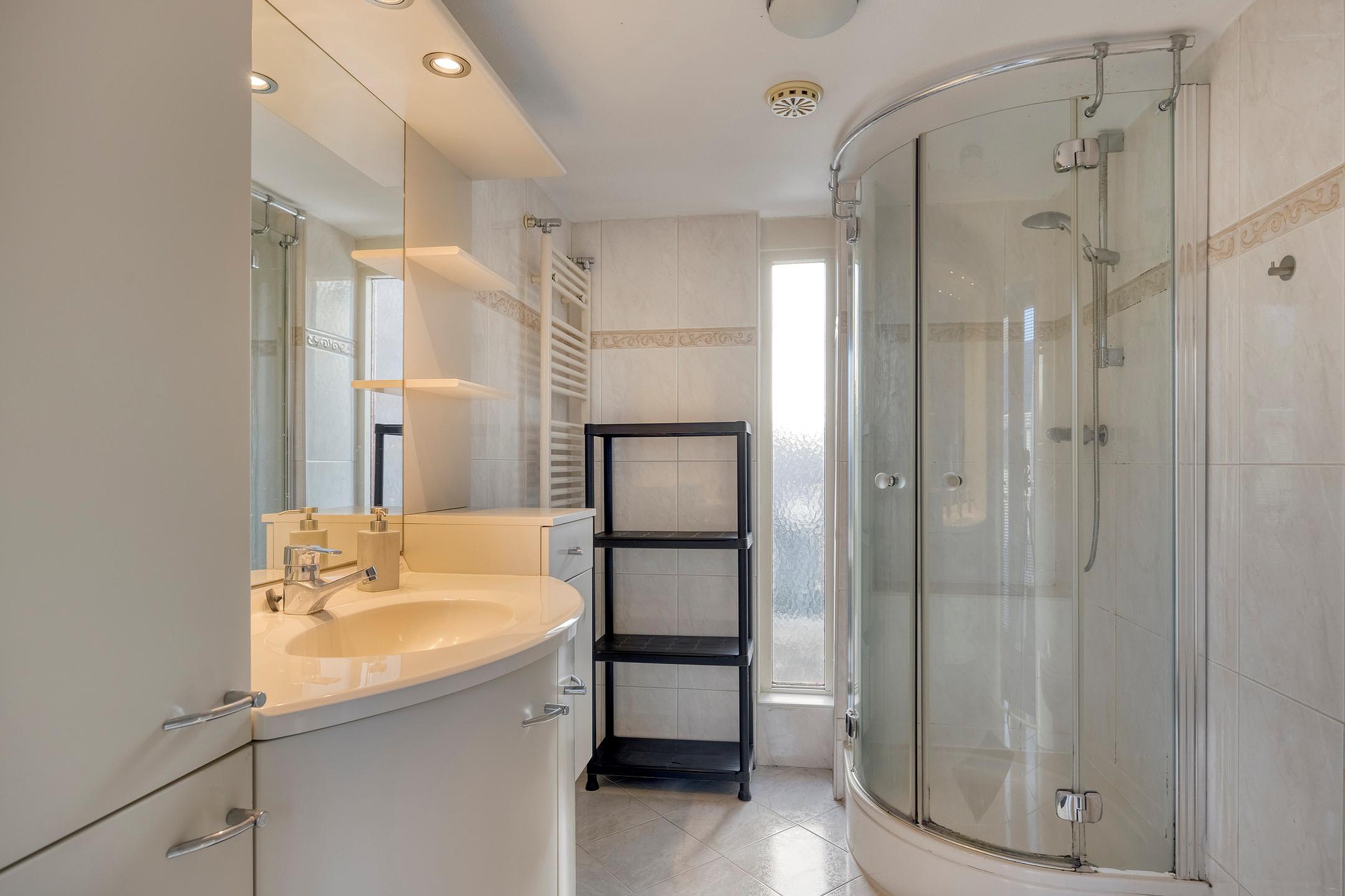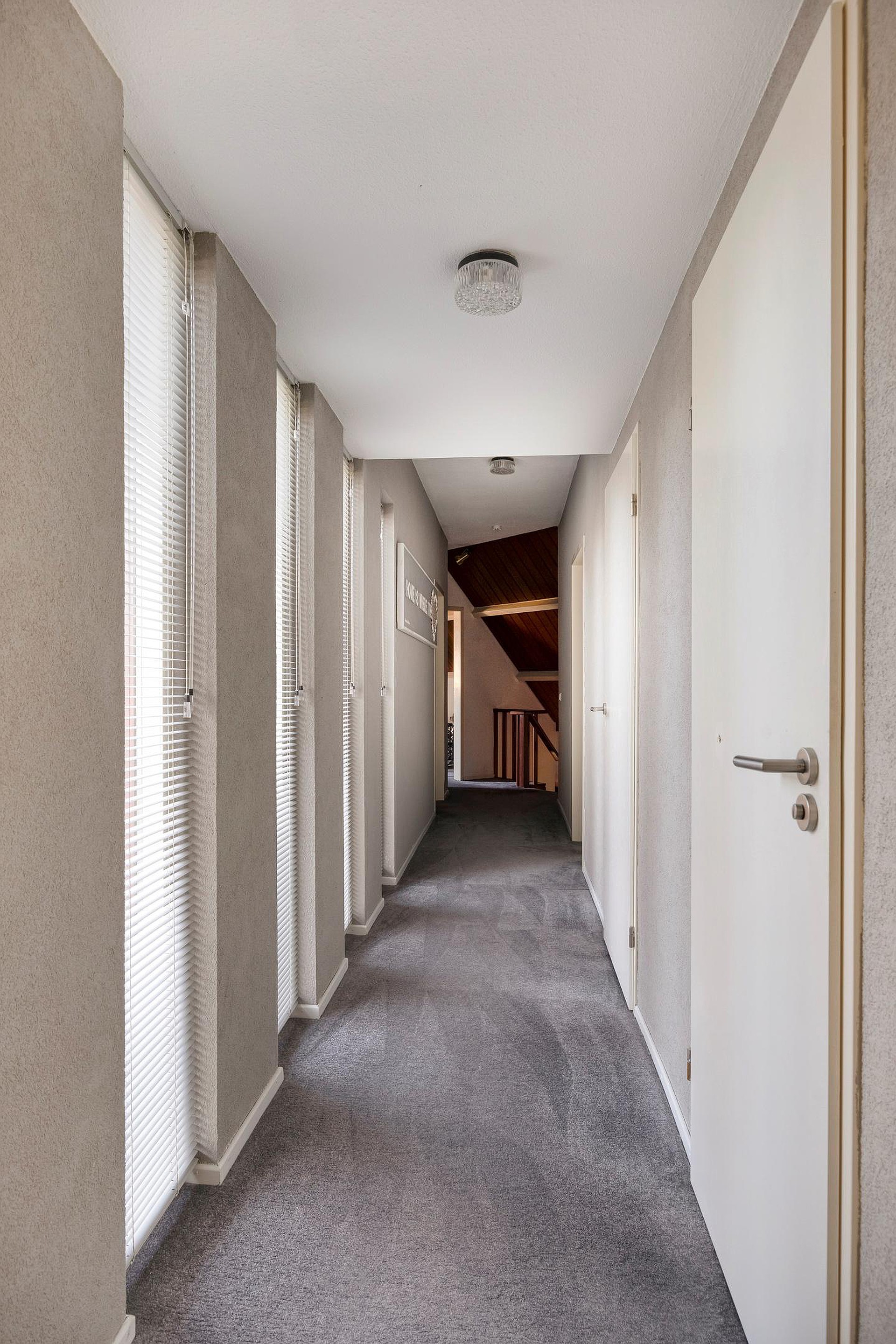 Overloop met hotelgang die toegang geeft tot alle vertrekken: 4 slaapkamers, de badkamer en de technische ruimte met opstelplaats voor de HR-combiketel. De ouderslaapkamer is voorzien van airco (2021), een vaste kastenwand, een wastafel en biedt toegang tot het balkon. De badkamer is volledig betegeld en voorzien van een douchecabine, toilet en wastafelmeubel.