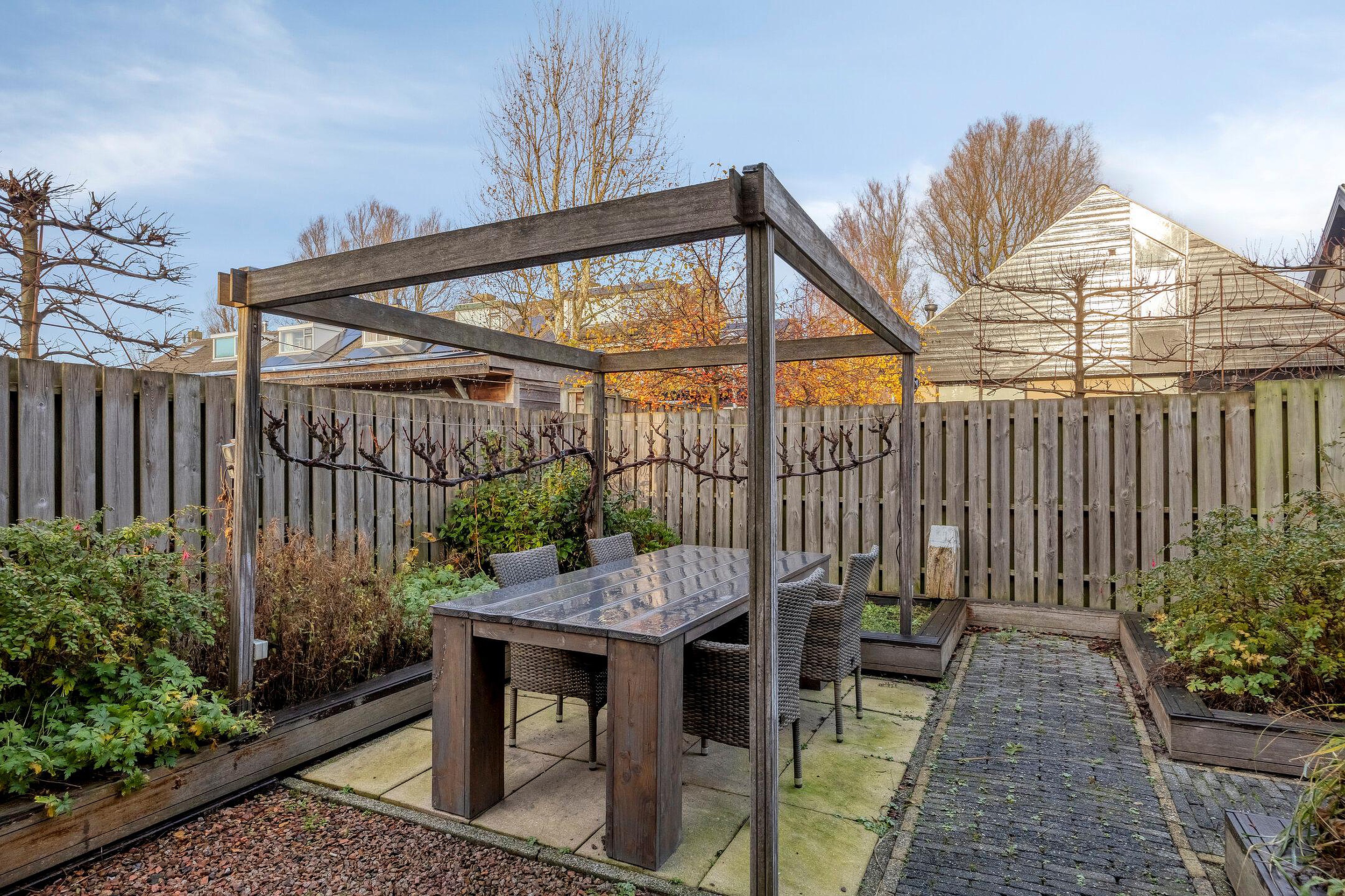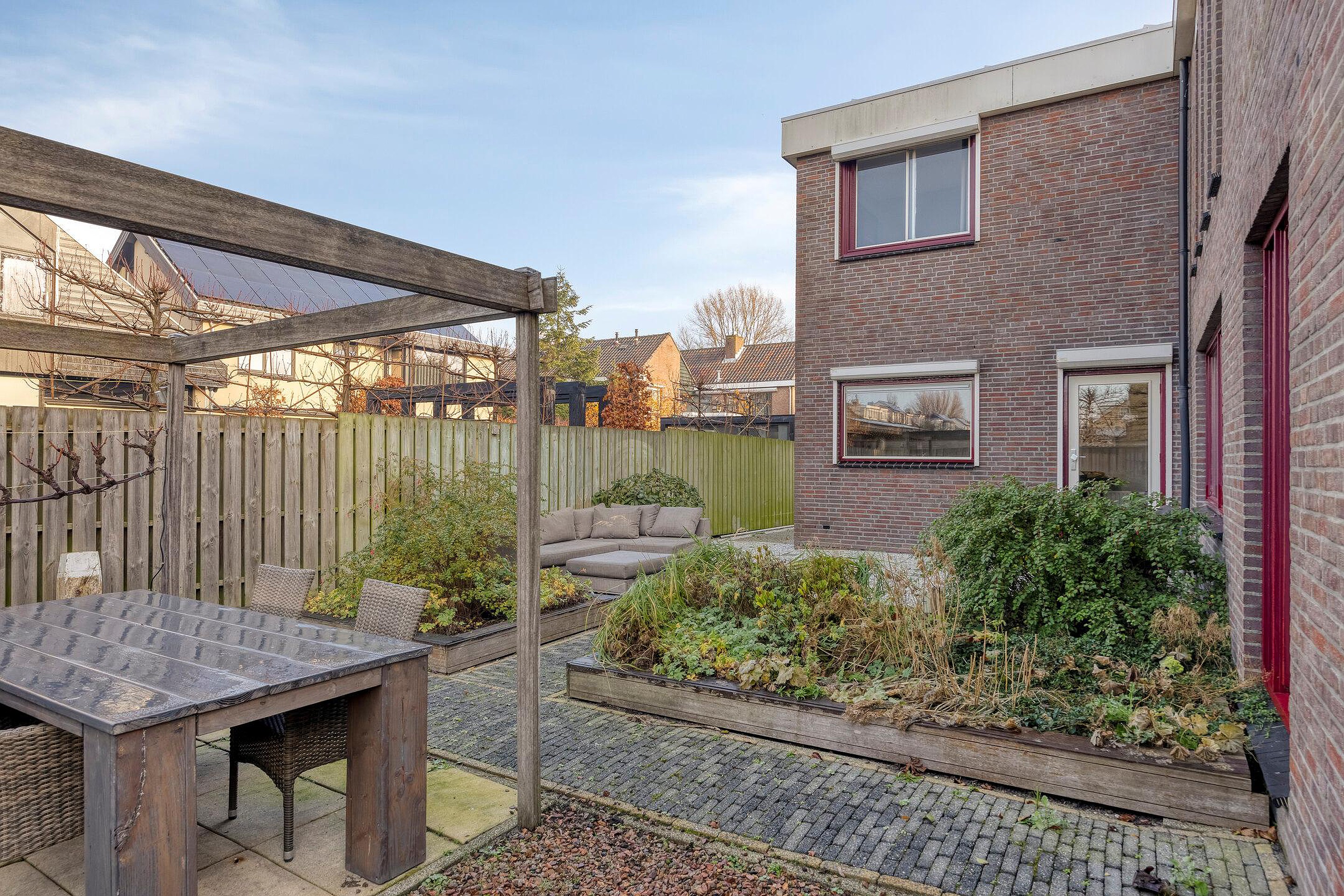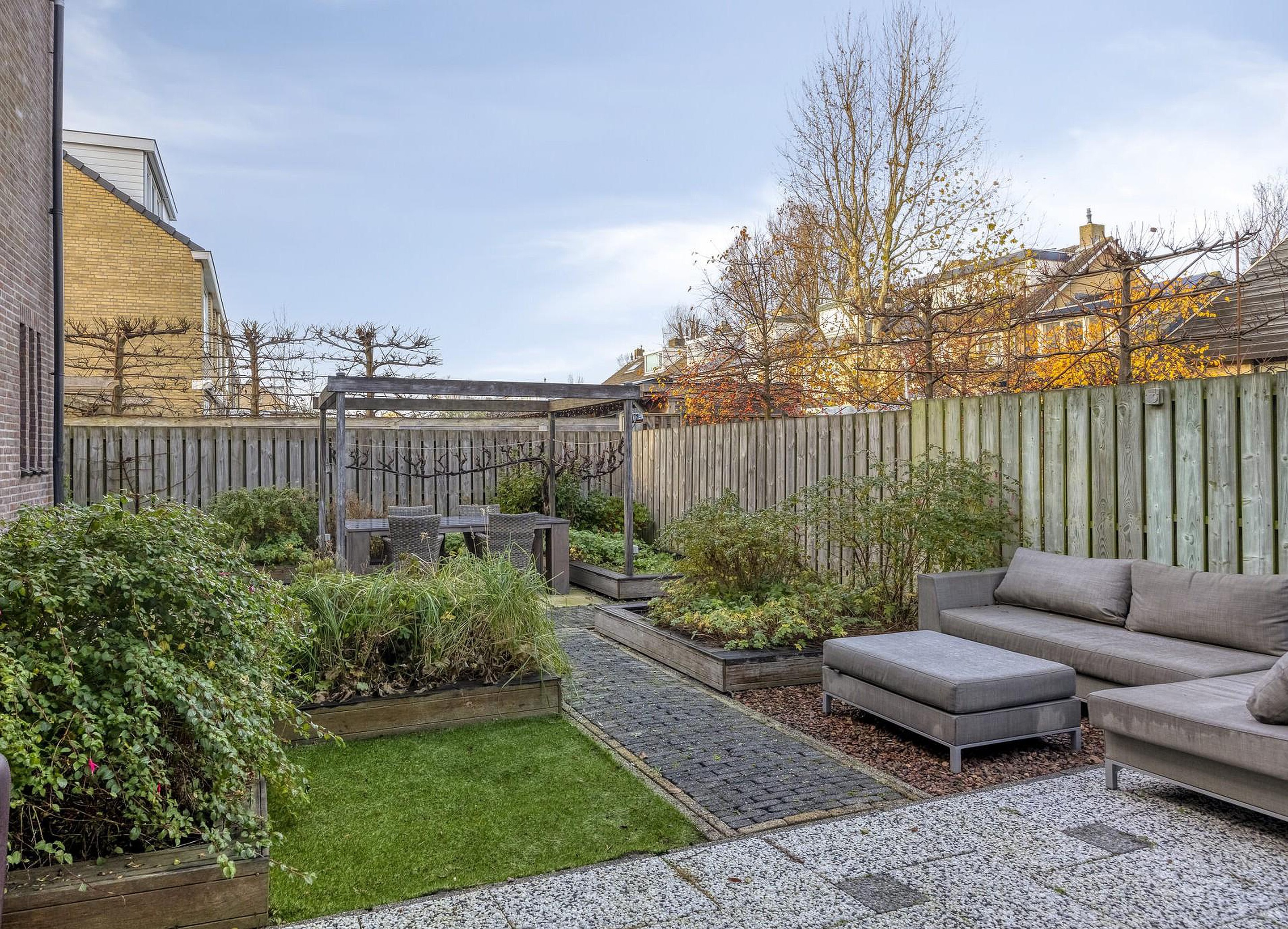 De ruime tuin ligt rondom de woning en is voorzien van groenborders en diverse terrassen.
