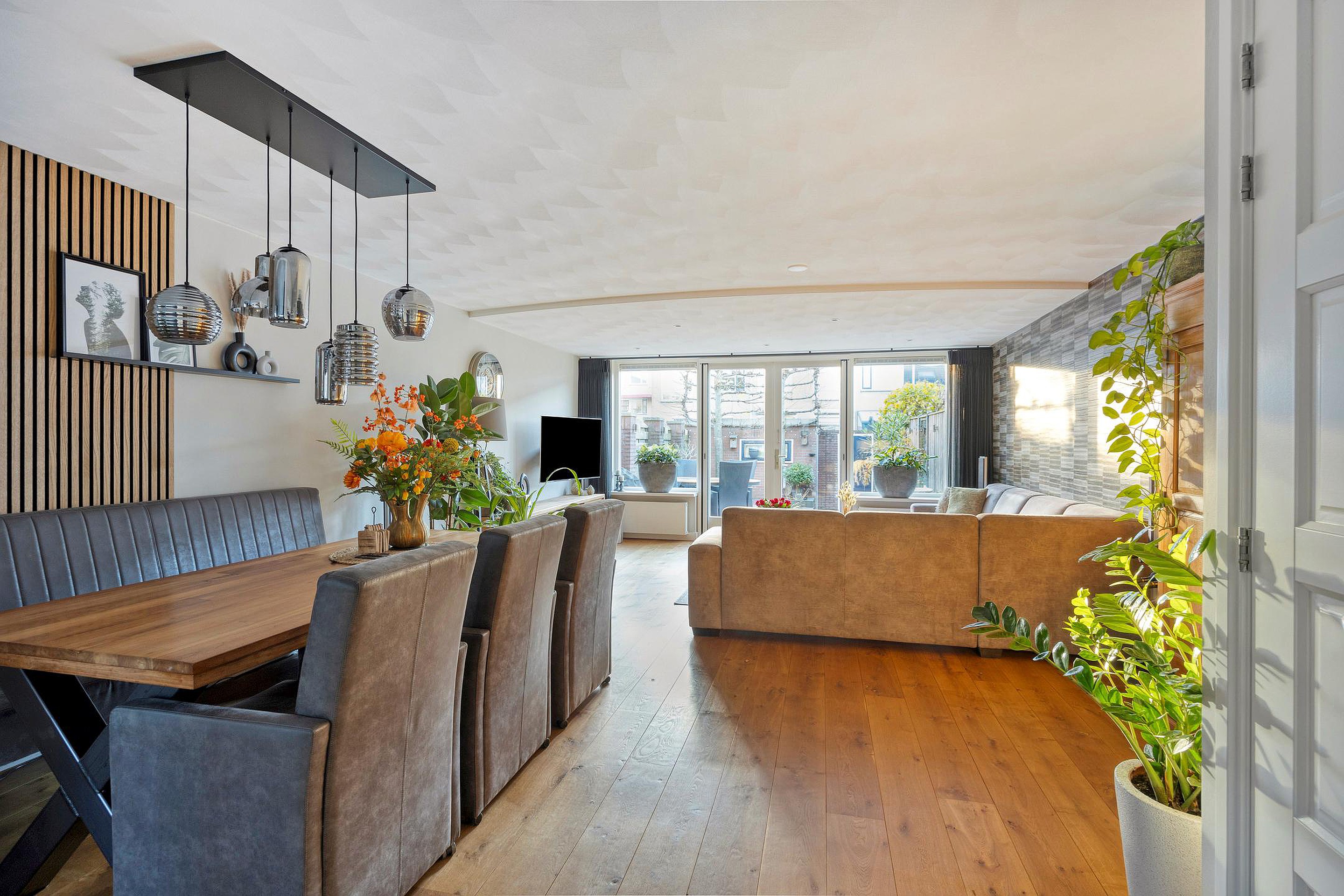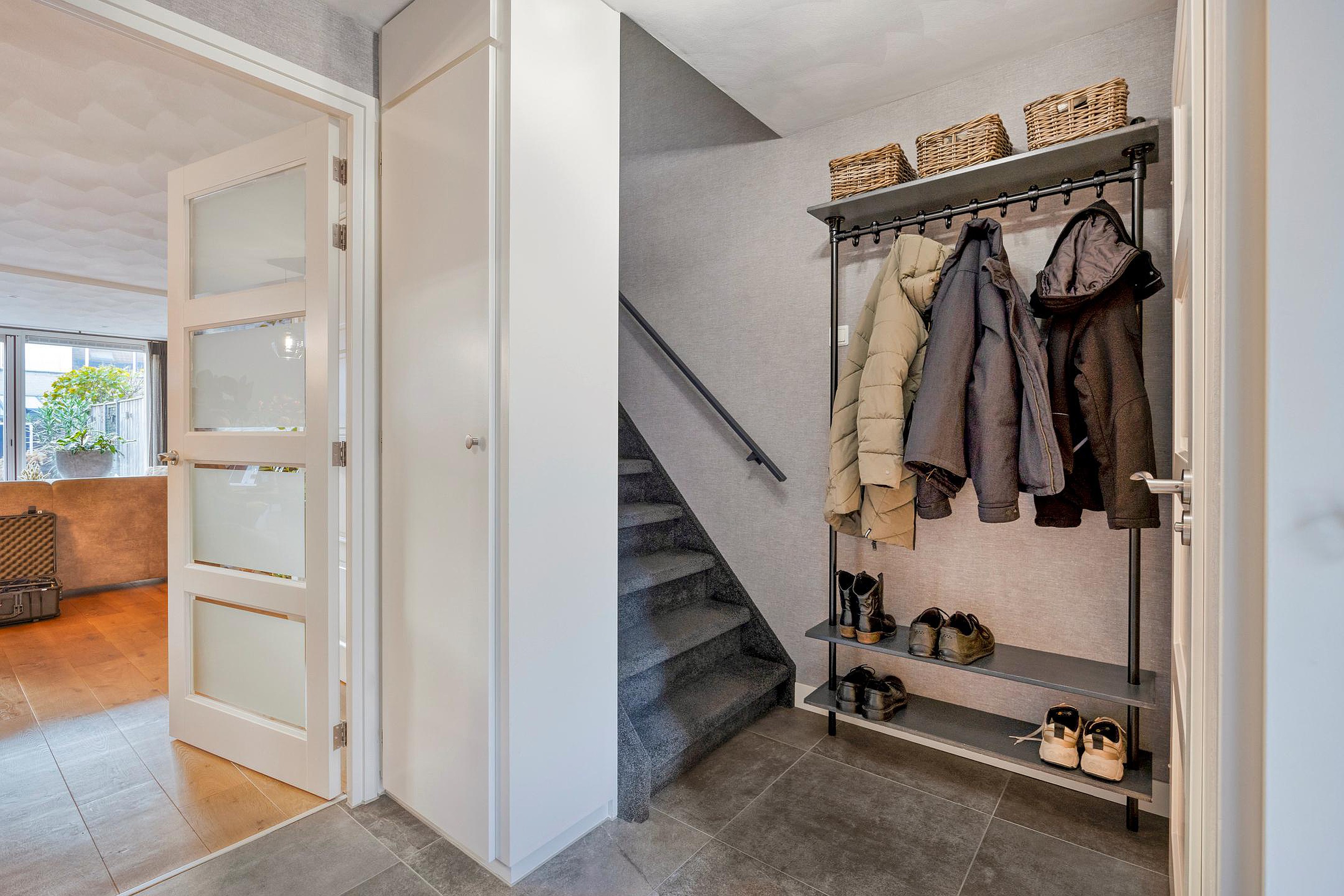De entree van de woning is bereikbaar via de leuk aangelegde voortuin. Hal met garderobe, meterkast (8 groepen en 2 a.l.s.), modern toilet met wandcloset en fonteintje (ca. 2015), trapopgang en toegang tot de woonkamer. Ruime en lichte woonkamer met open keuken (2020).