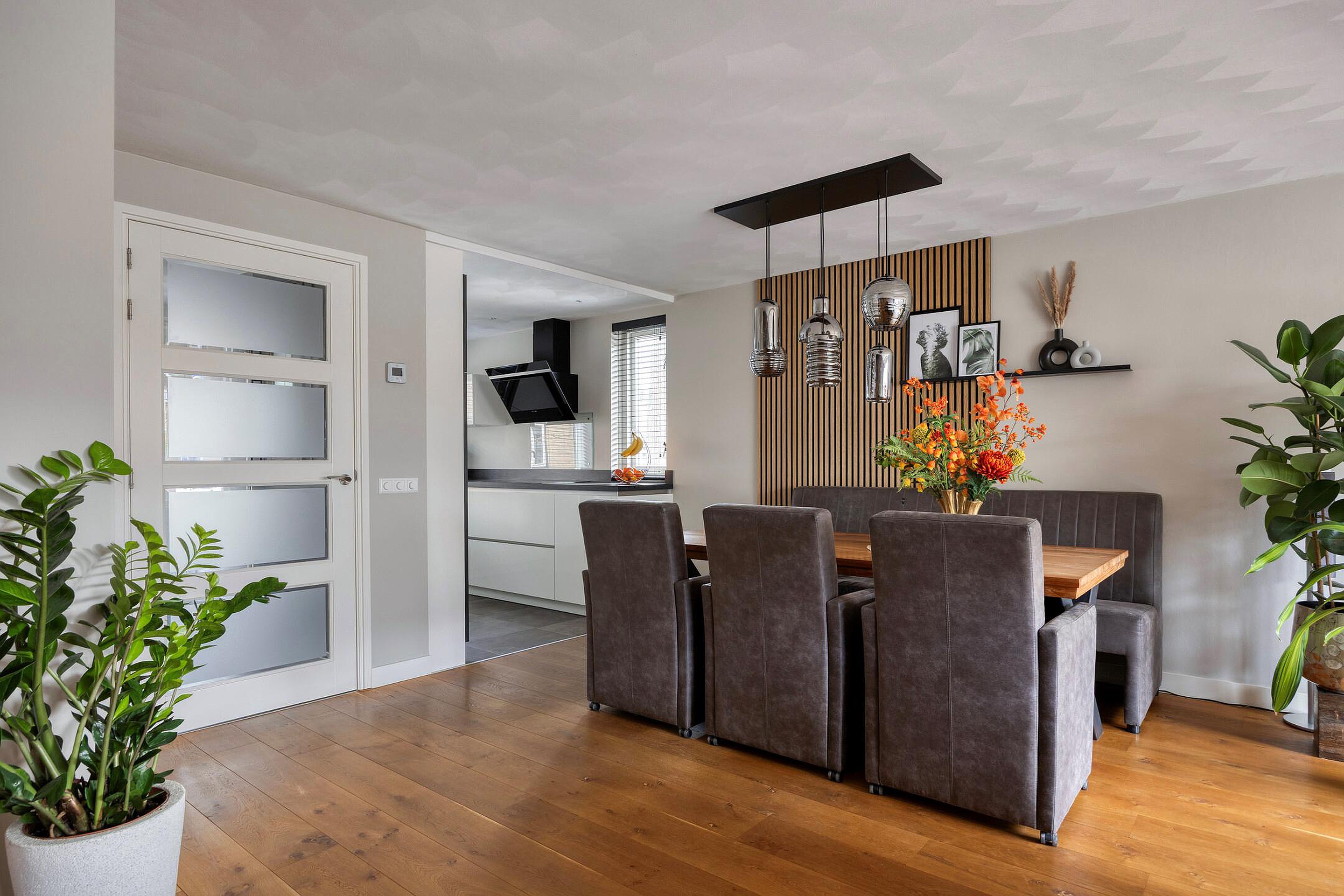 De keuken is voorzien van een Dekton aanrechtblad en diverse inbouwapparatuur, waaronder een inductie kookplaat met moderne afzuigkap, een stoom-oven, Quooker, koelkast, vriezer en een vaatwasmachine. Het keukenraam aan de zijkant geeft veel extra daglicht.