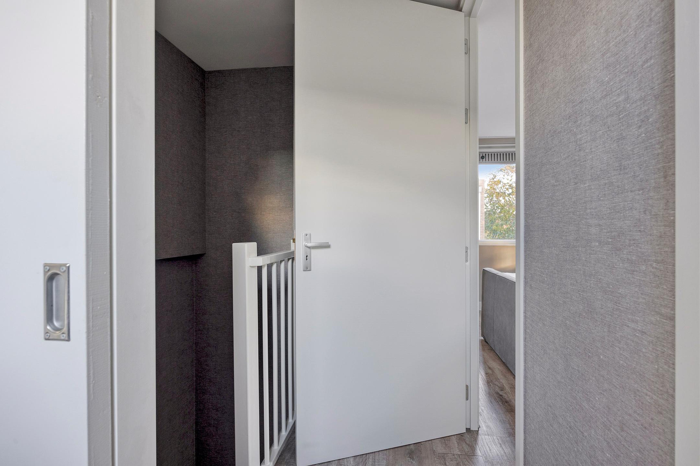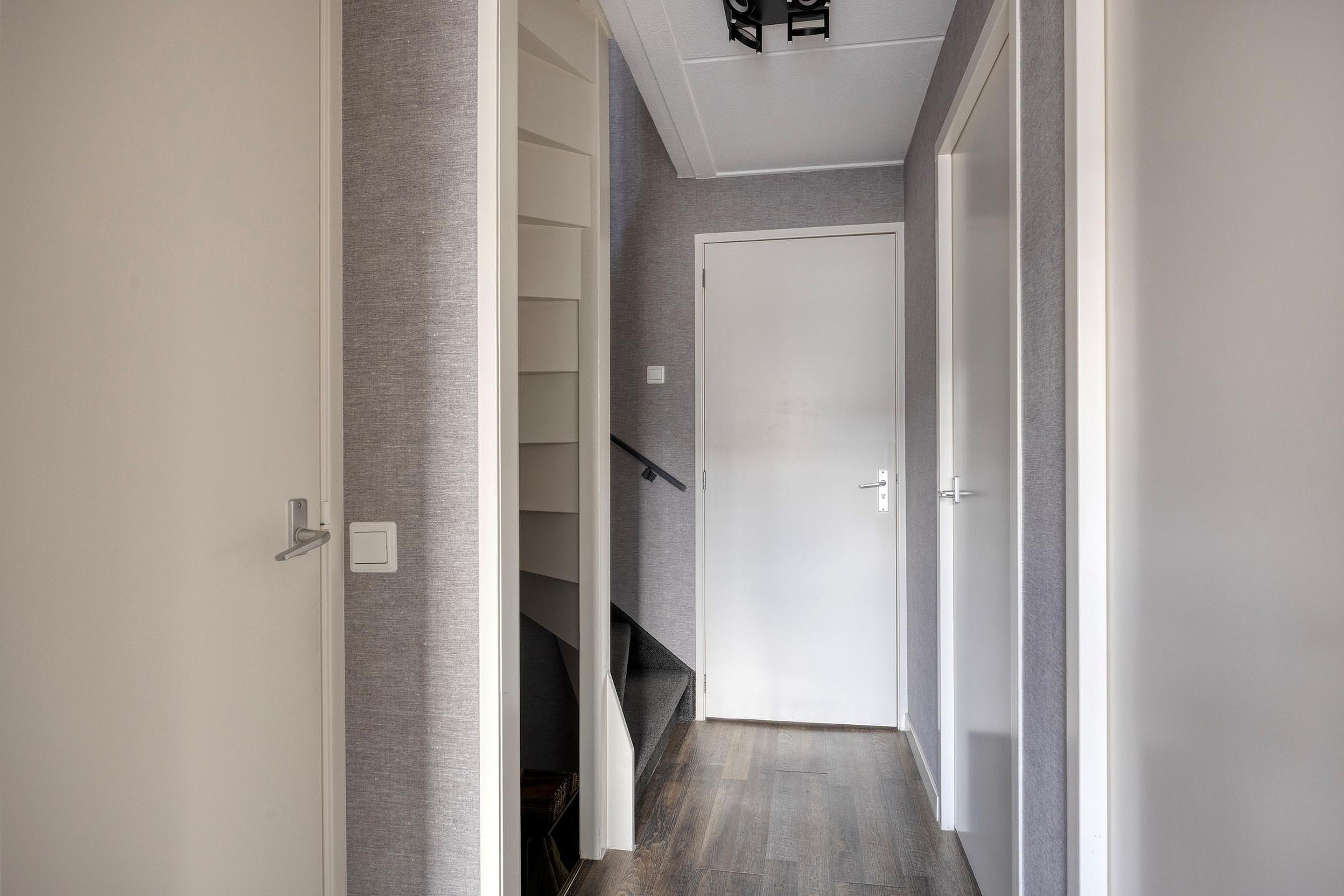 Overloop met vaste kast en trap naar 2e etage. Er zijn op deze etage drie ruime slaapkamers, waarvan twee aan de achterzijde van de woning zijn gelegen.