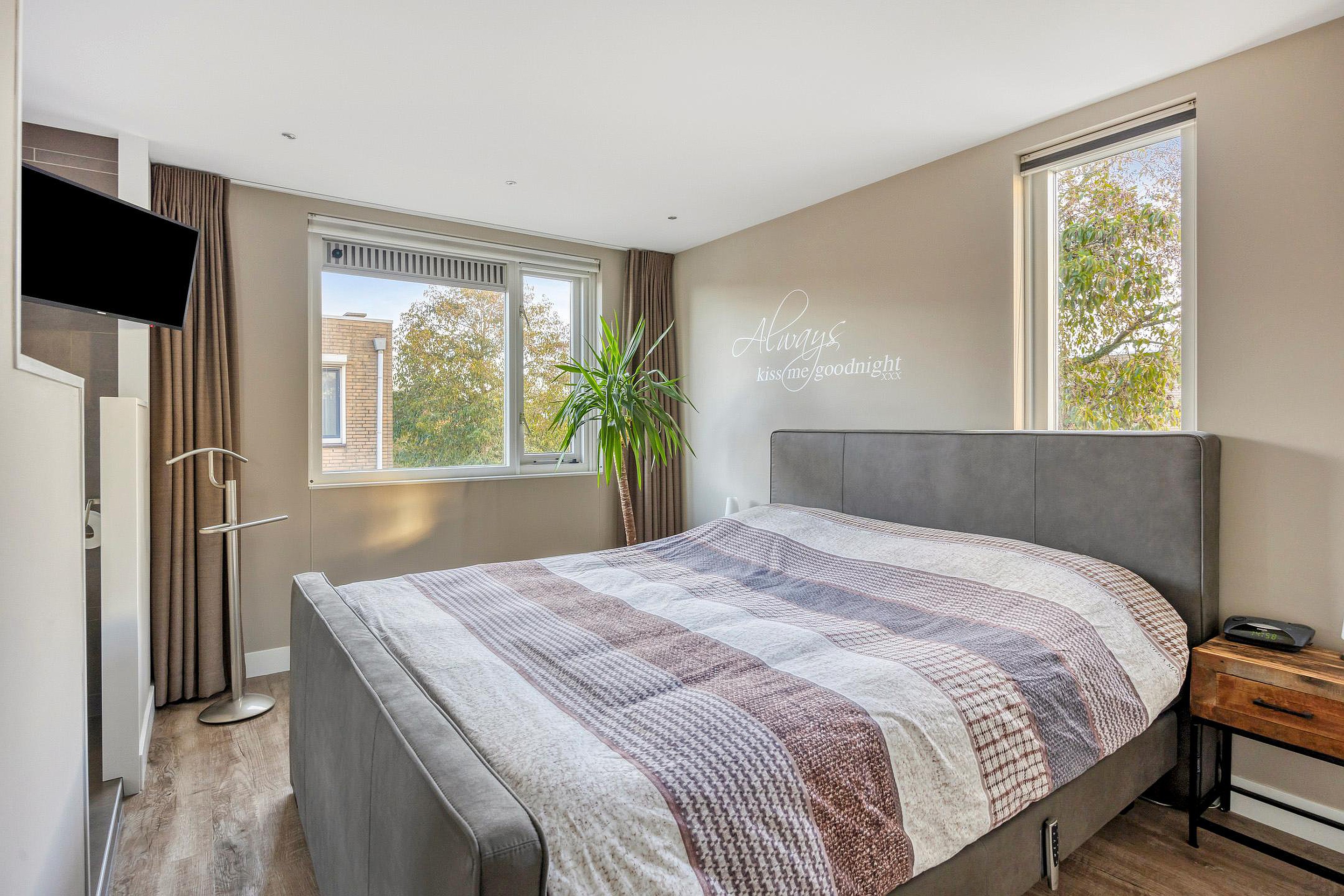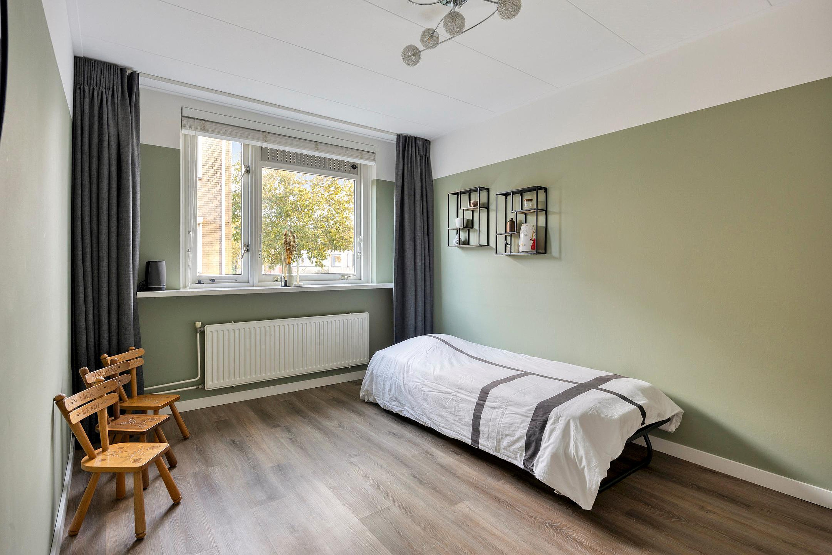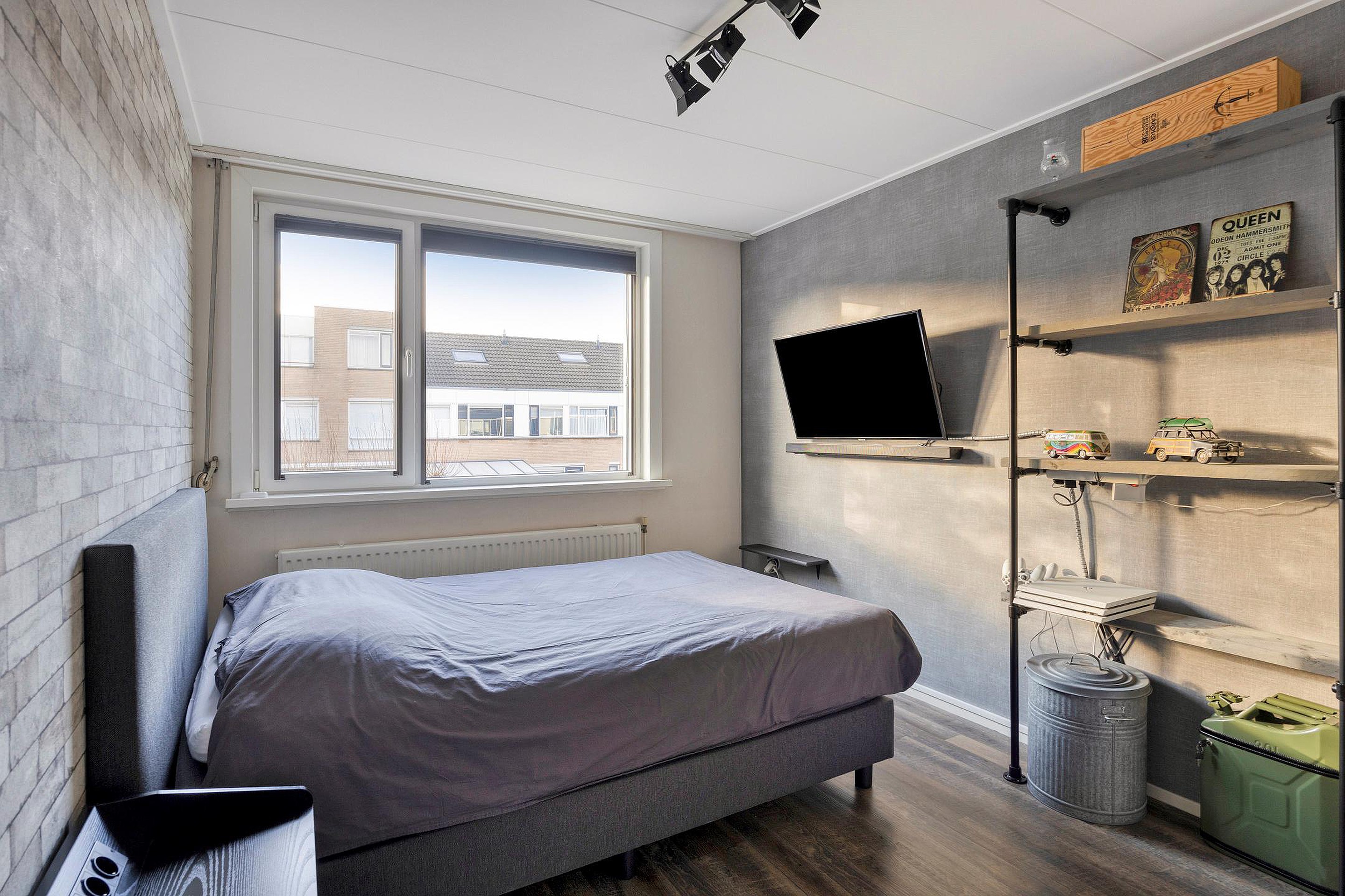 De ruime slaapkamer ligt aan de voorzijde van de woning en is voorzien van een vaste schuifdeurkast.