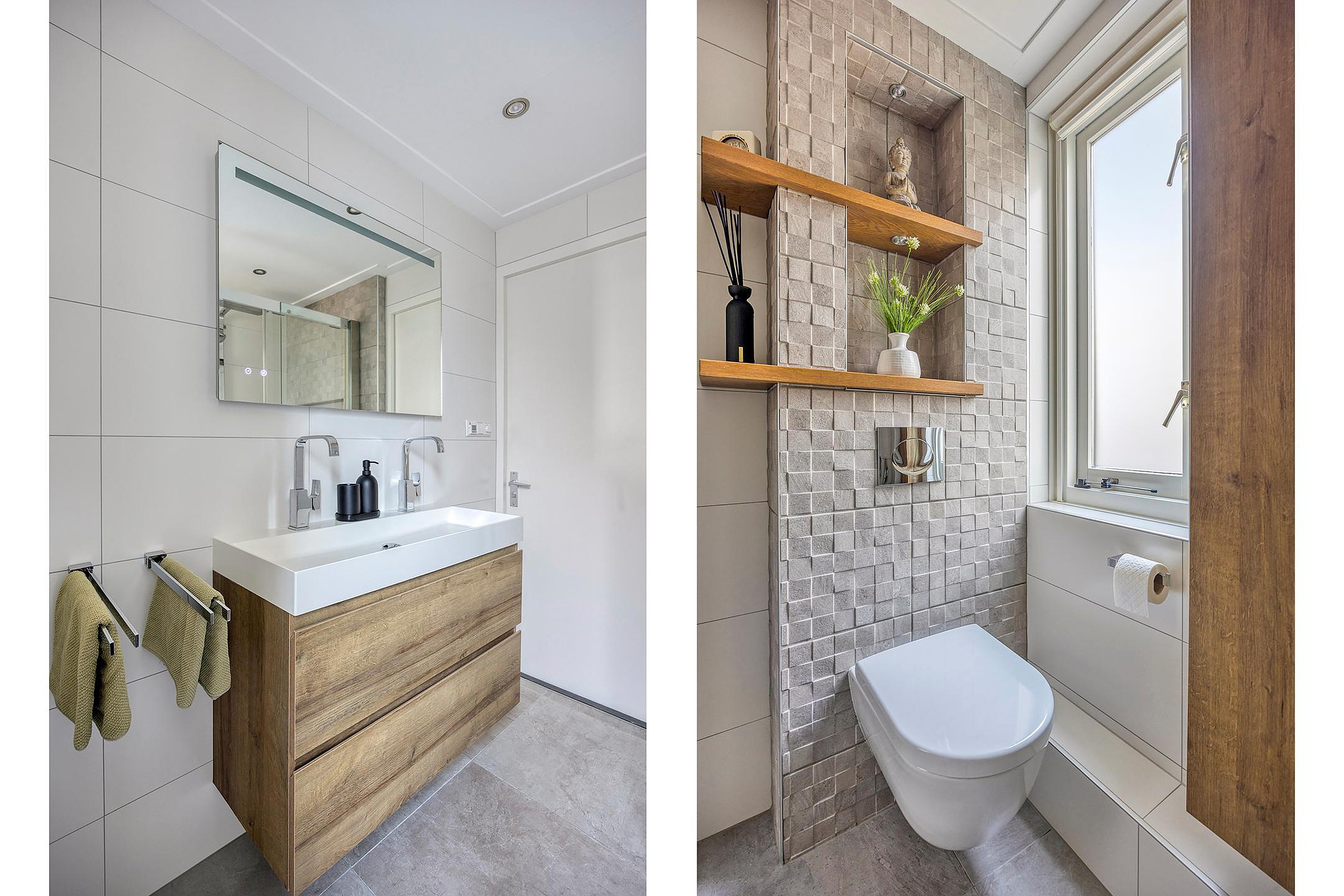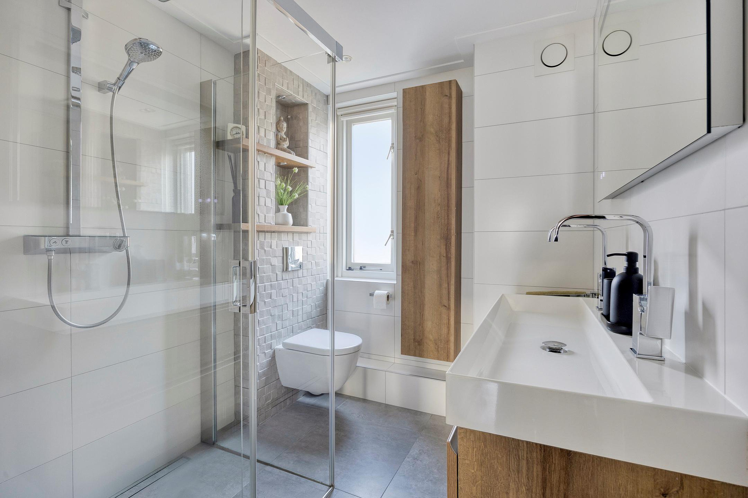 De luxe badkamer (2020) is voorzien van elektrische vloerverwarming, een inloopdouche, een breed wastafelmeubel en een wandtoilet.