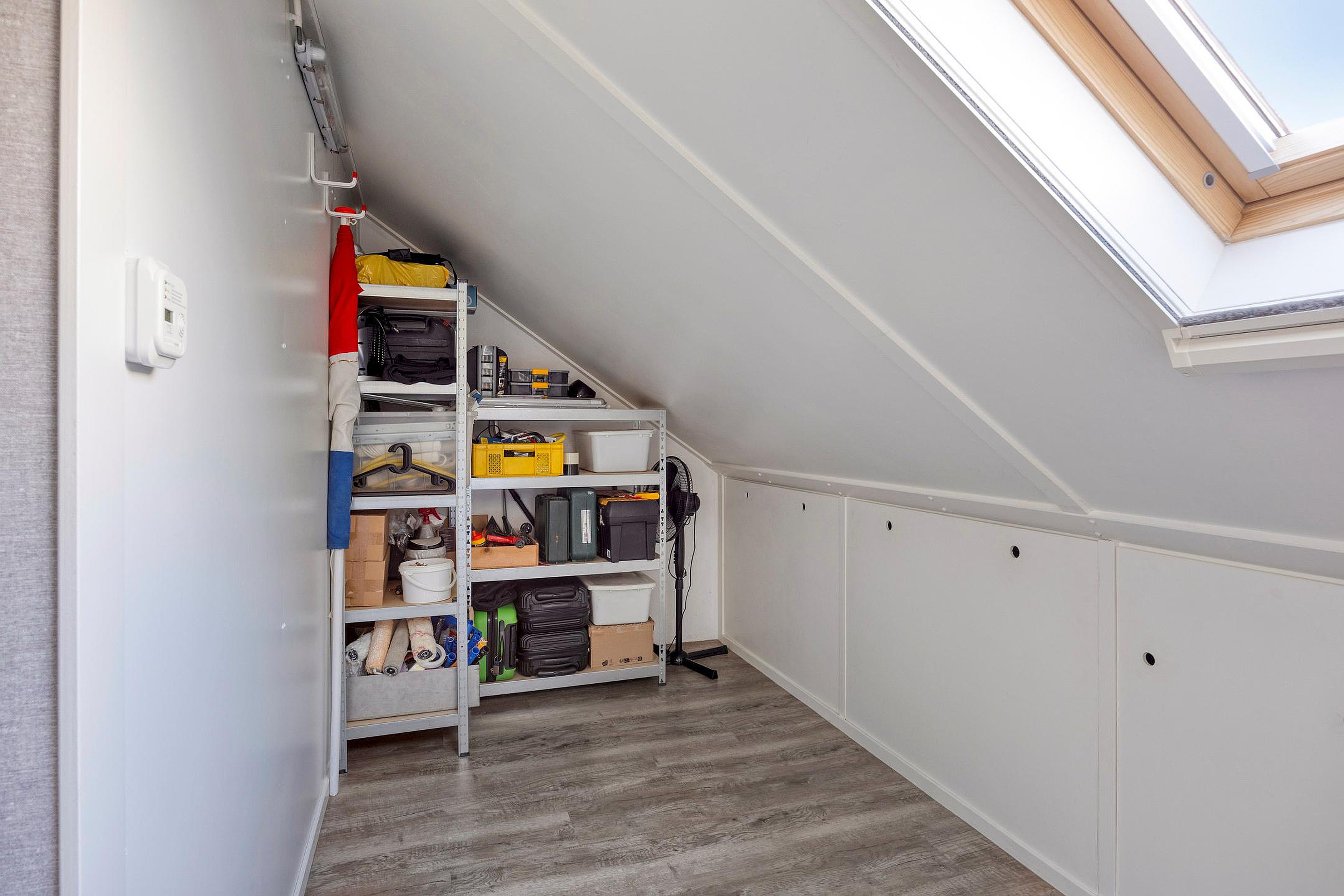 De zolderruimte met Velux dakraam heeft veel opbergruimte achter de knieschotten.