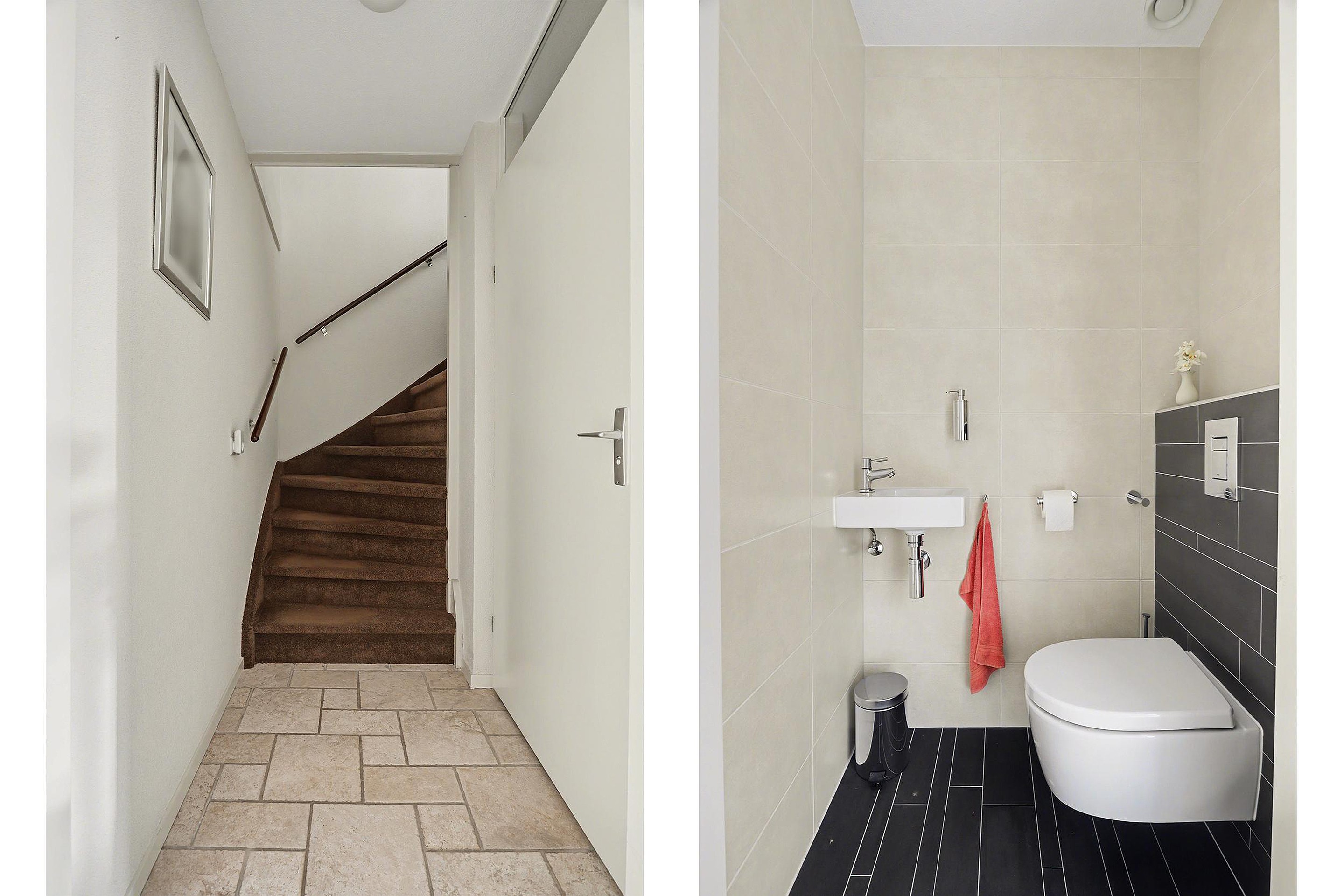 Begane grond Via de verzorgde voortuin (ca 2,9x5,8m), met op de begane grond aan de voorgevel een elektrische screen, bereik je de entree van de woning. De entree met meterkast biedt toegang tot de lichte L-vormige woonkamer (ca. 4,2x3,6 en 6,4x2,7), voorzien van vloerverwarming met plavuizen en een schuifpui naar de achtertuin. Aan de achterzijde bevindt zich de moderne halfopen keuken (ca. 2,4x2,4m), uitgerust met div. inbouwapparatuur. De verzorgde achtertuin (ca. 10,5x7,7m) heeft een houten berging (ca. 3,2x2,6m) en achterom. In de woonkamer bevindt zich een hal die toegang geeft tot het moderne betegelde toilet met fontein en de trap naar de 1e verdieping.