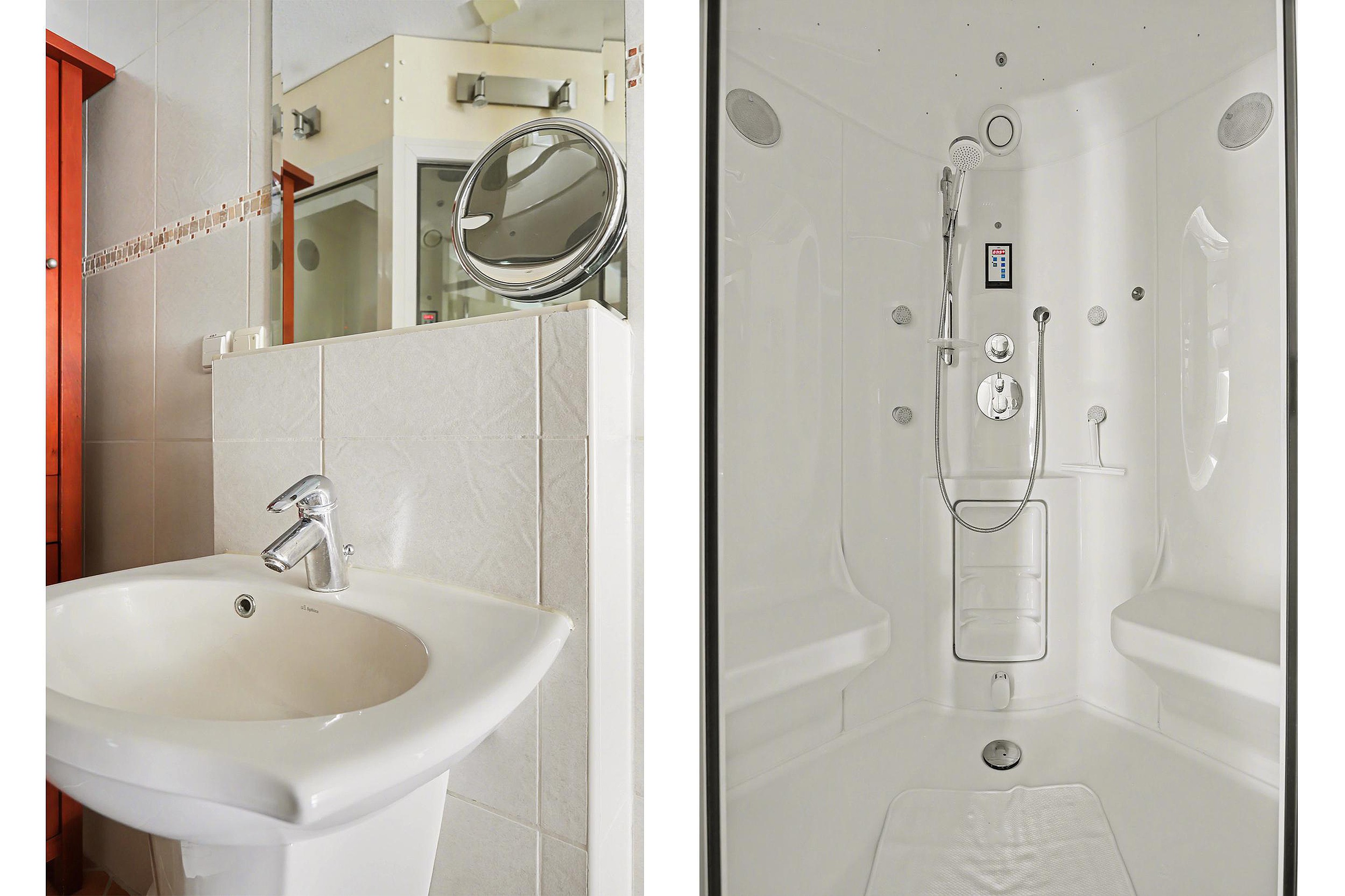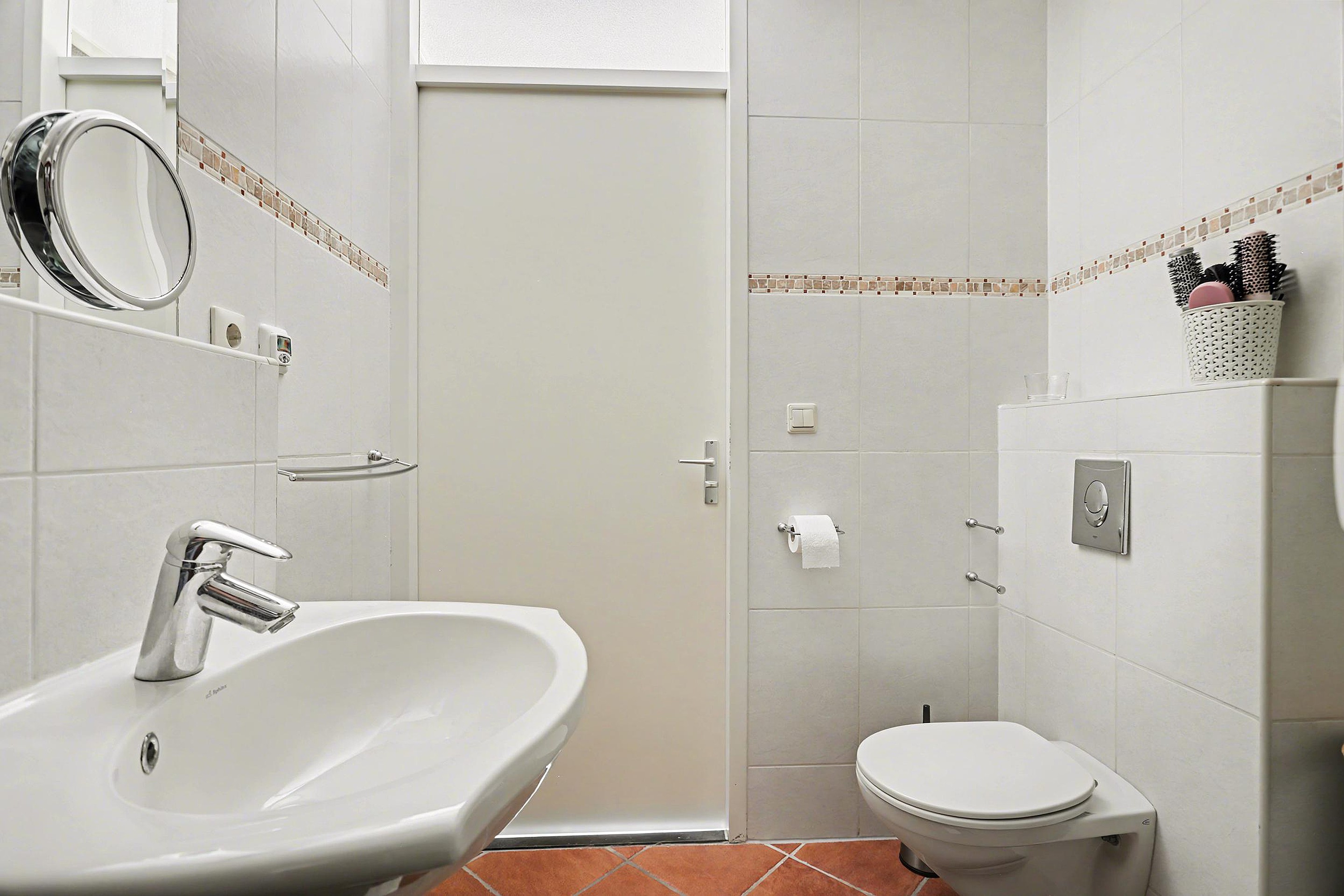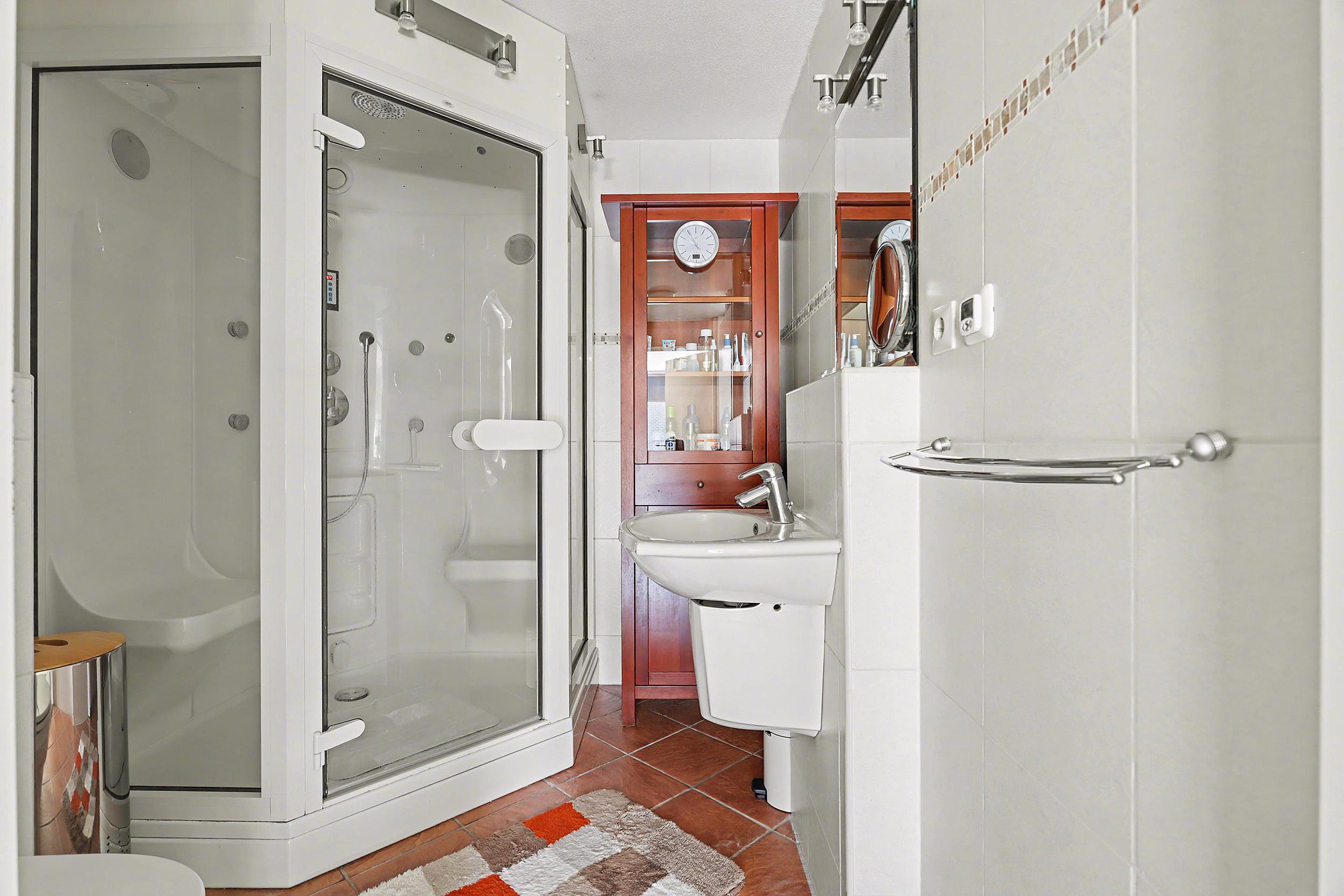 Eerste verdieping De overloop geeft toegang tot een slaapkamer (ca. 5,4x2,9m) aan de voorzijde, een 2e slaapkamer (ca. 4,3x2,1m) aan de voorzijde en een 3e slaapkamer (ca. 3,5x2,9m) aan de achterzijde. Verder op deze verdieping een moderne betegelde badkamer (ca. 2,5x2,1m) met stoomcabine, 2e vrij hangend toilet en wastafel.