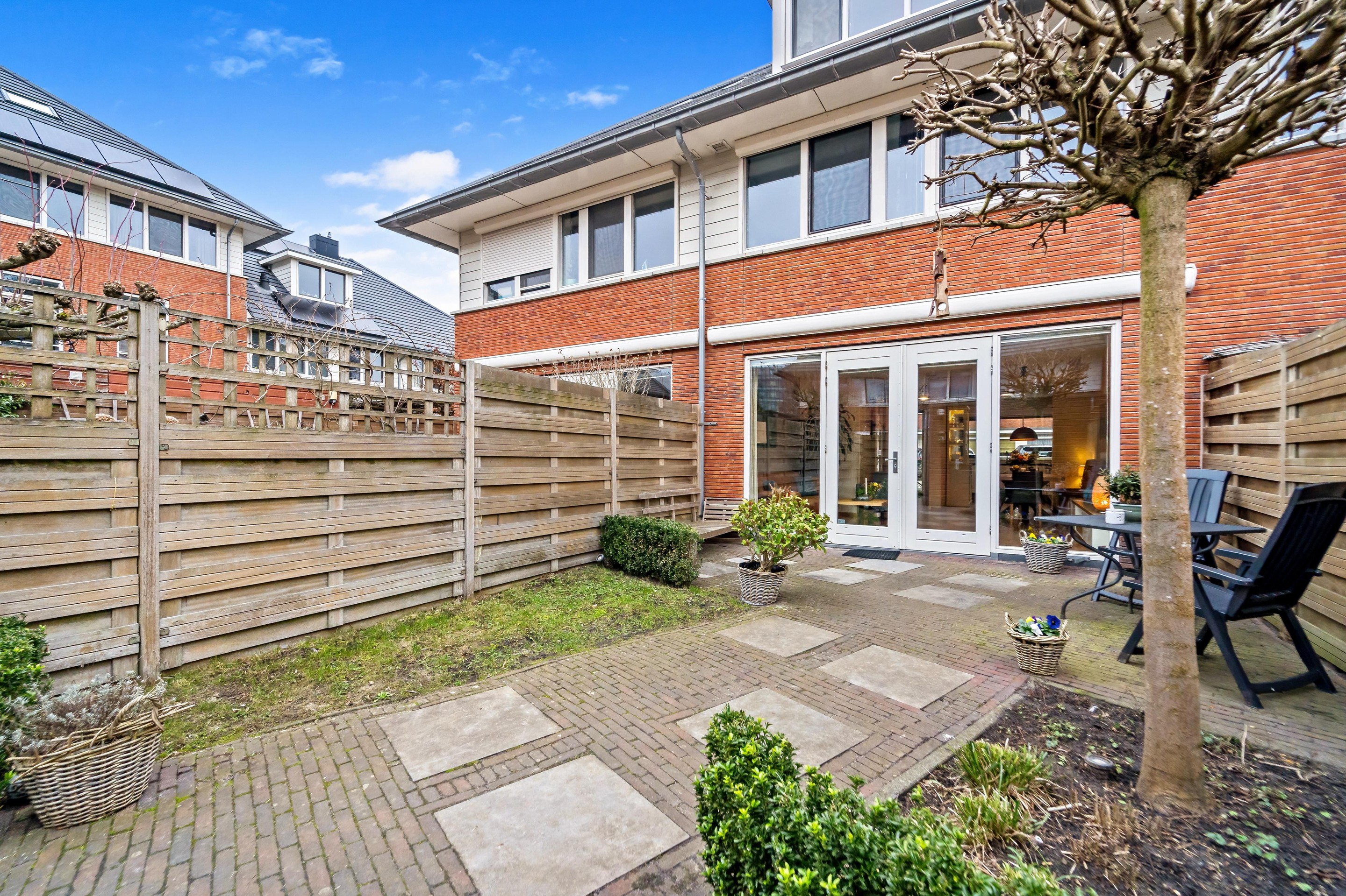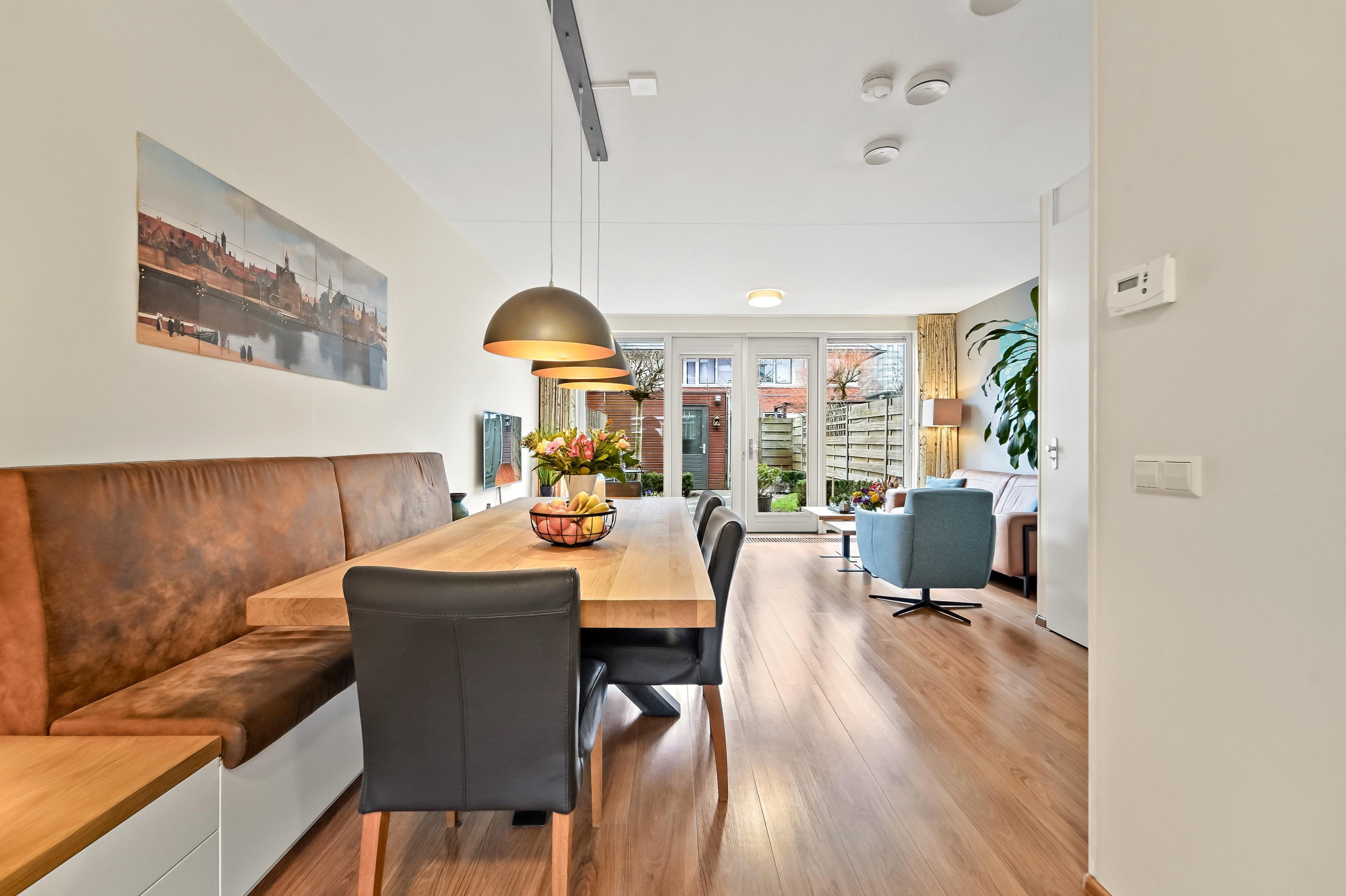 Entree, hal met meterkast, garderoberuime, toiletruimte met fonteintje en trap naar 1e verdieping. De woning beschikt over een lichte, tuingerichte woonkamer met dubbele deuren naar de zonnige achtertuin. De fraai aangelegde achtertuin biedt volop ruimte om te ontspannen, te spelen of gezellig buiten te eten, mede dankzij de zonnige zuidwest ligging. Achterin de tuin bevindt zich een praktische fietsenberging. De tuin is aan de achterzijde ontsloten via een brede poort. Aan de voorzijde van de woning bevindt zich de moderne keuken. Deze keuken is in 2025 gerenoveerd en is voorzien van diverse moderne inbouwapparatuur, waaronder een koel-vriescombinatie, 4 pits gaskookplaat, combi oven/magnetron, vaatwasser en afzuigkap. Een fijne ruimte met een moderne, frisse uitstraling, helemaal klaar voor vele jaren kookplezier. De gehele begane grond is voorzien van een laminaatvloer.