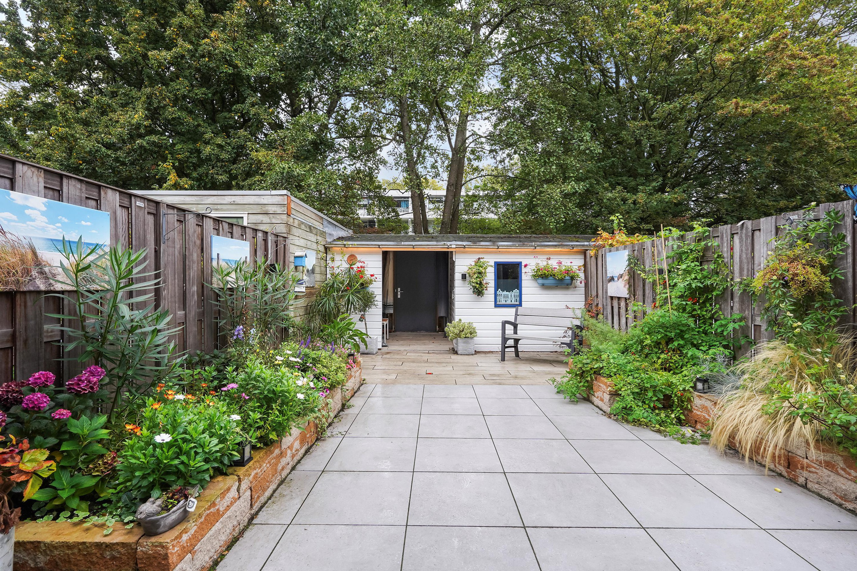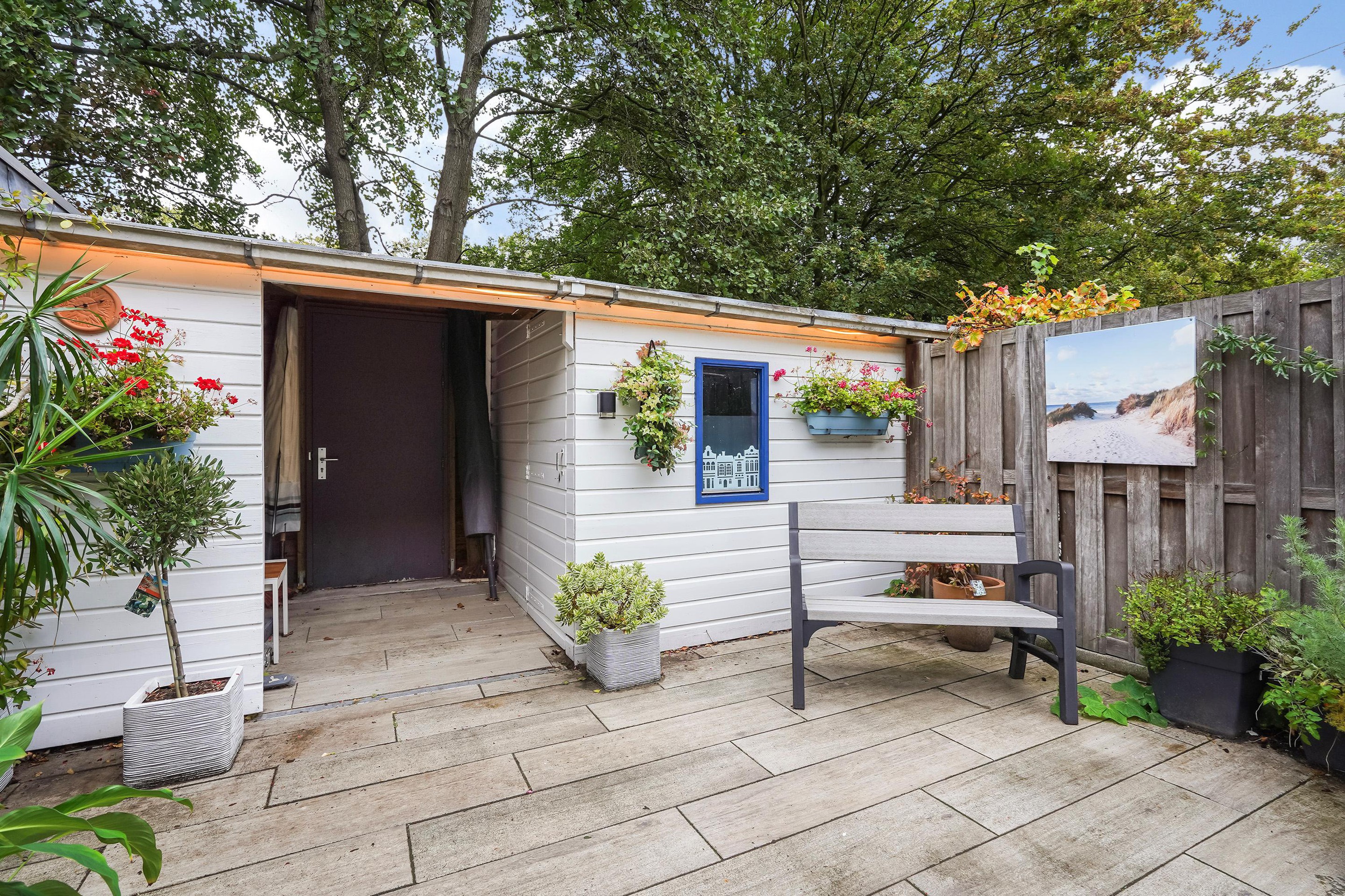 De diepe achtertuin biedt volop mogelijkheden om te genieten van het buitenleven. Achterin vindt u een houten berging met overkapping en een praktische achterom.