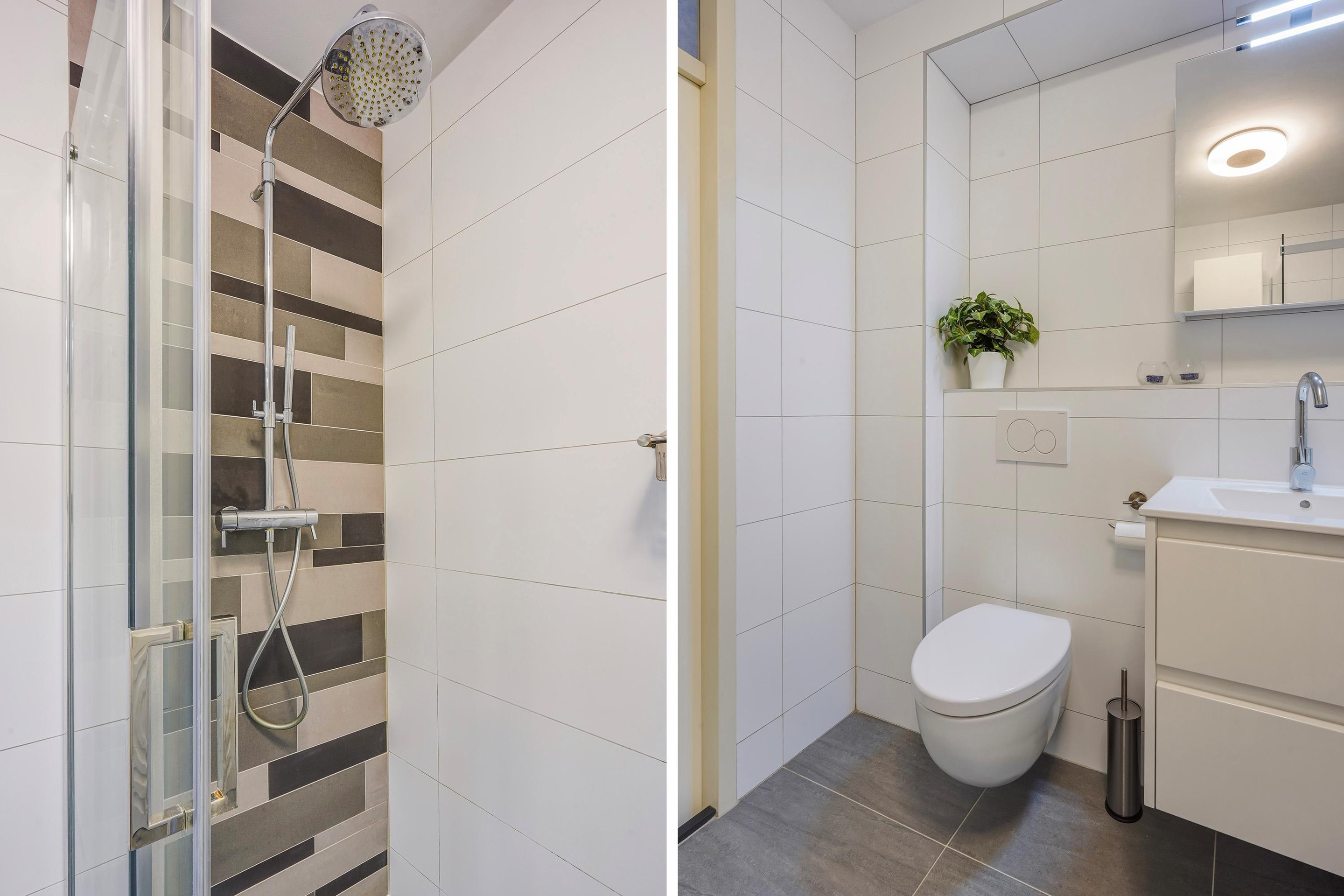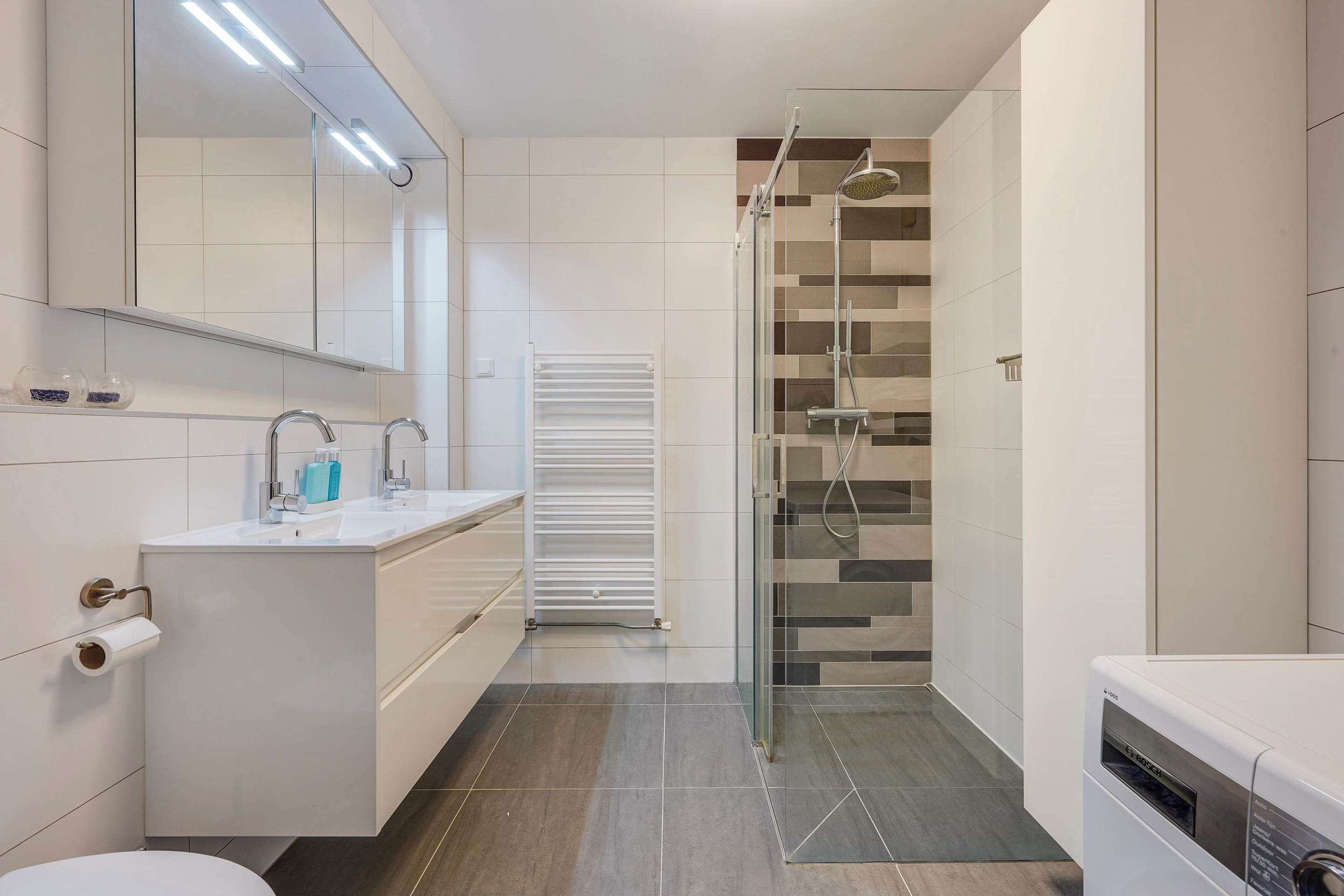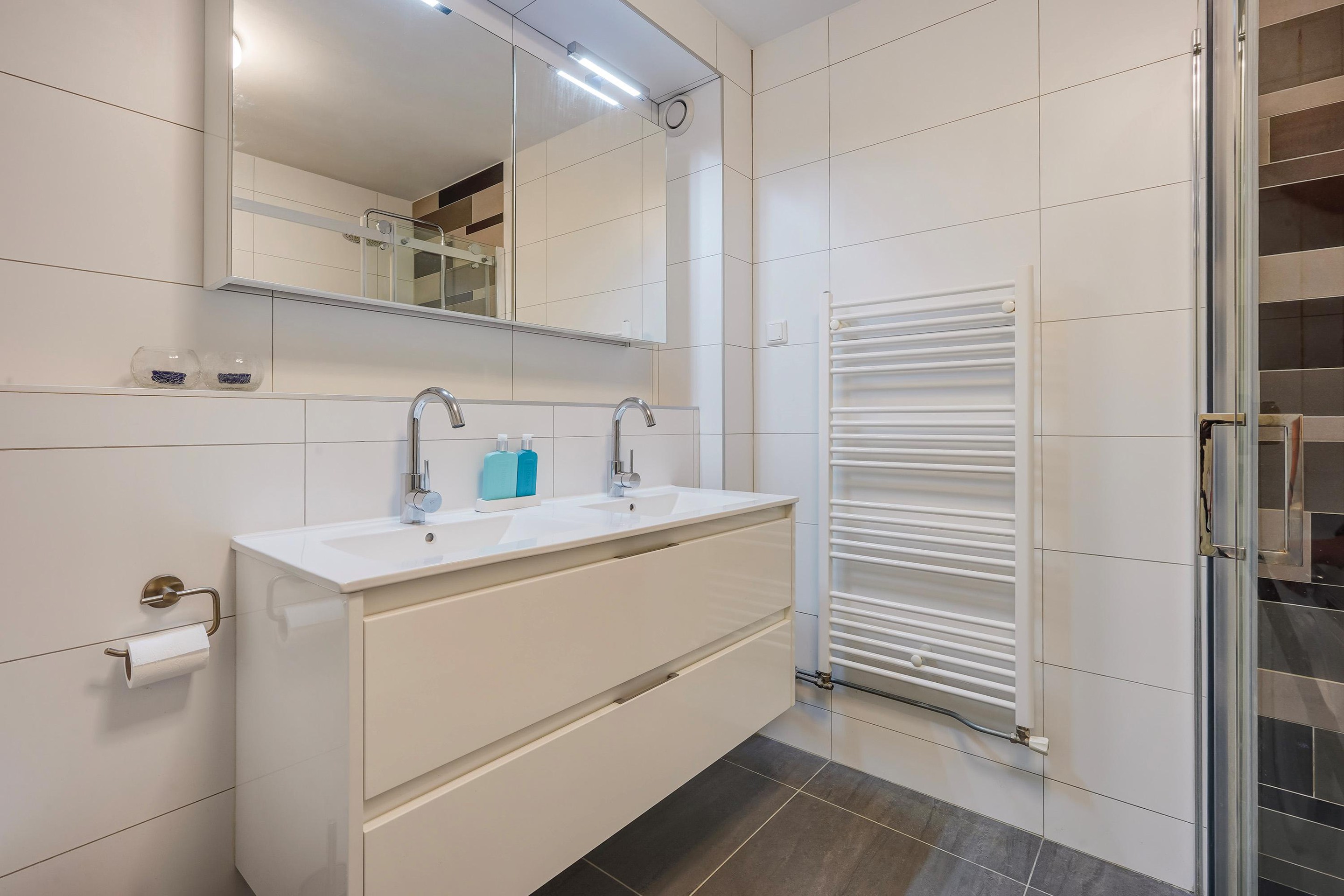 Overloop met toegang tot twee ruime slaapkamers (voor- en achterzijde). De badkamer is stijlvol ingericht en voorzien van een inloopdouche, dubbele wastafel en tweede toilet.