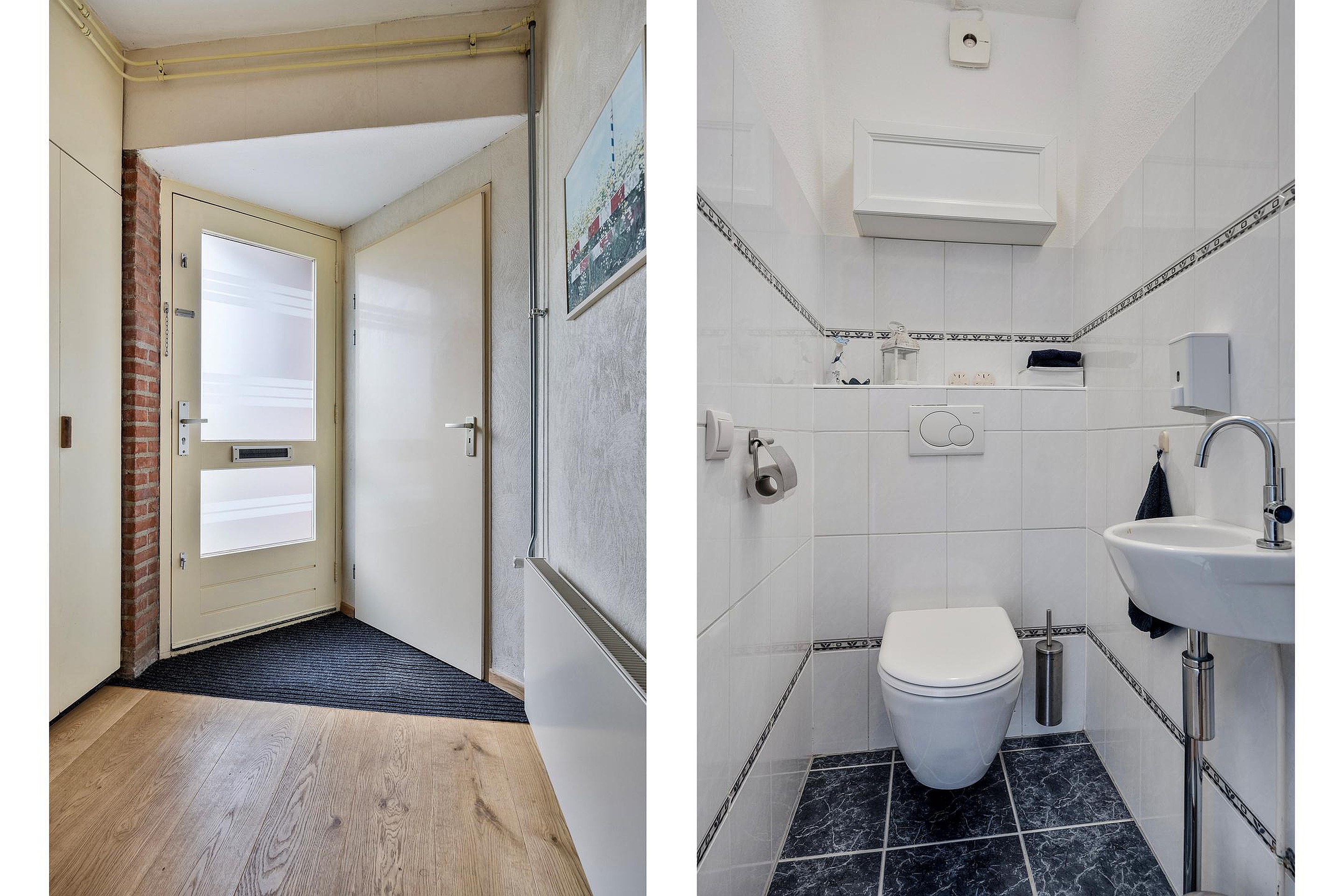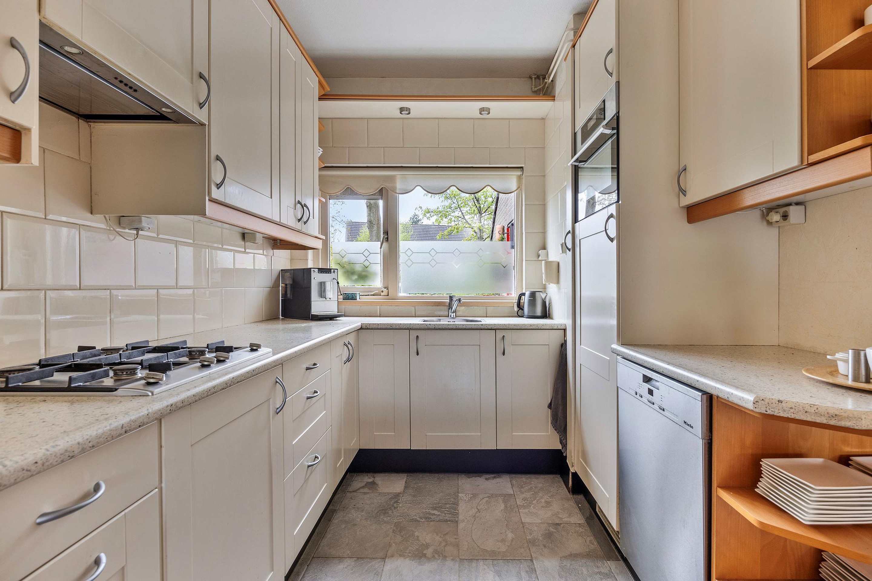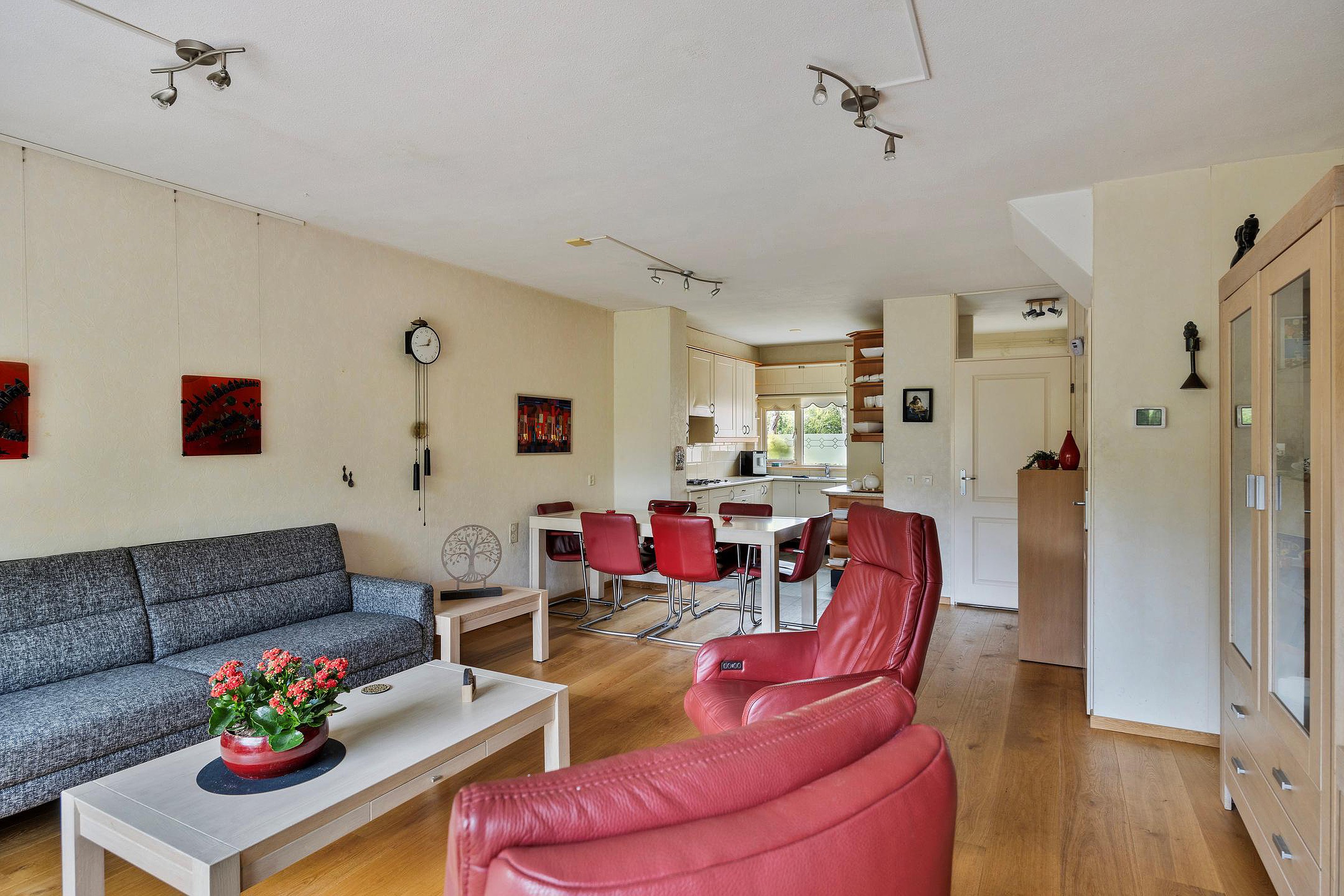 Entree, hal met meterkast (6 groepen + a.l.s.), deur naar de garage en toilet met wandtoilet en fonteintje. De tuingerichte woonkamer is voor een groot deel voorzien van vloerverwarming (2021) en heeft een trapkast. Via een loopdeur bereikt u de fraai aangelegde tuin met diverse terrassen, een bergkast en achterom. De open keuken (2002) is gelegen aan de voorzijde van de woning en is voorzien van diverse inbouw-apparatuur (4-pits gaskooplaat, afzuigkap, combioven, close-in-boiler, vaatwasser en koelkast). De ruime garage is voorzien van een bergzolder.