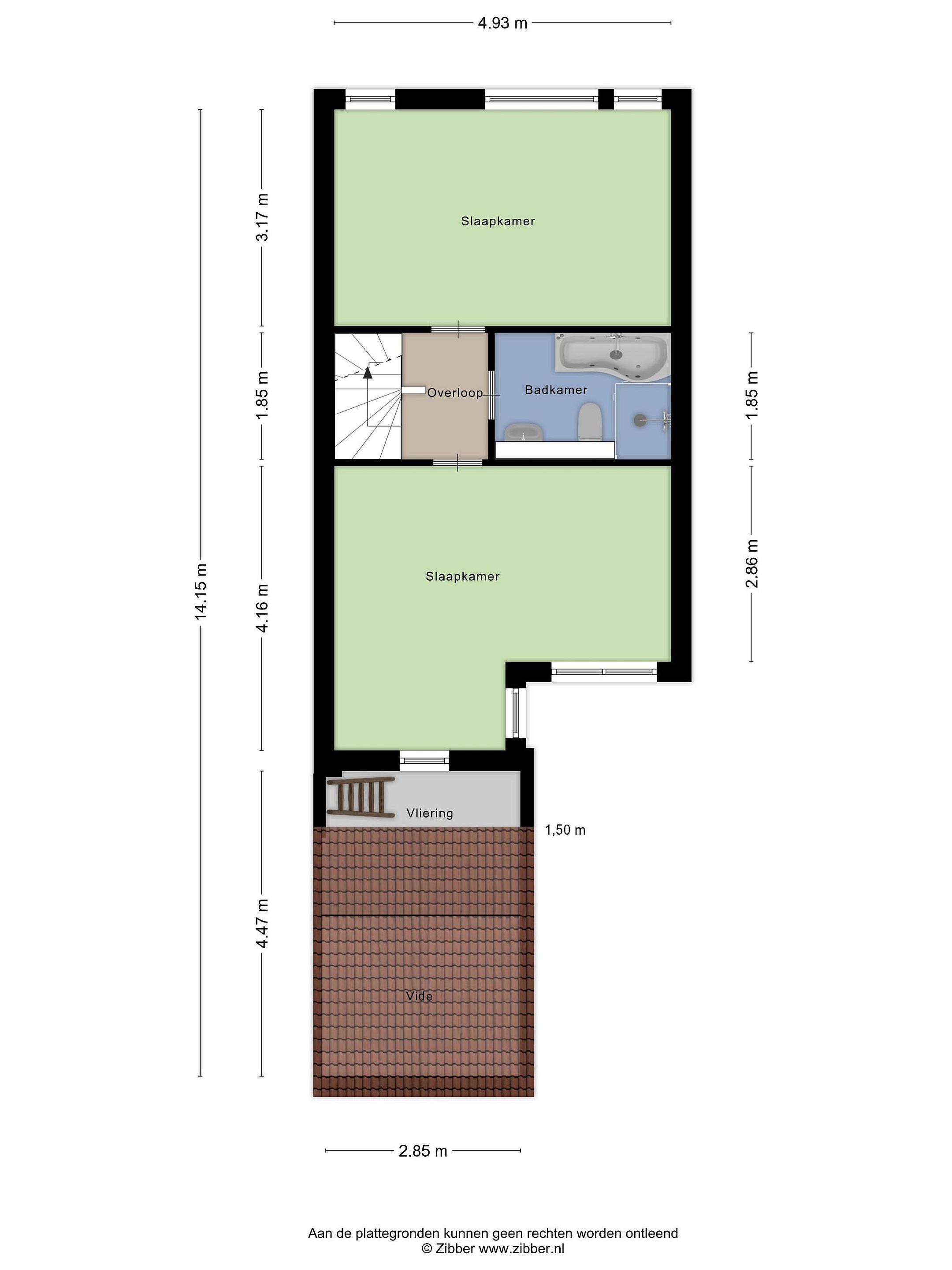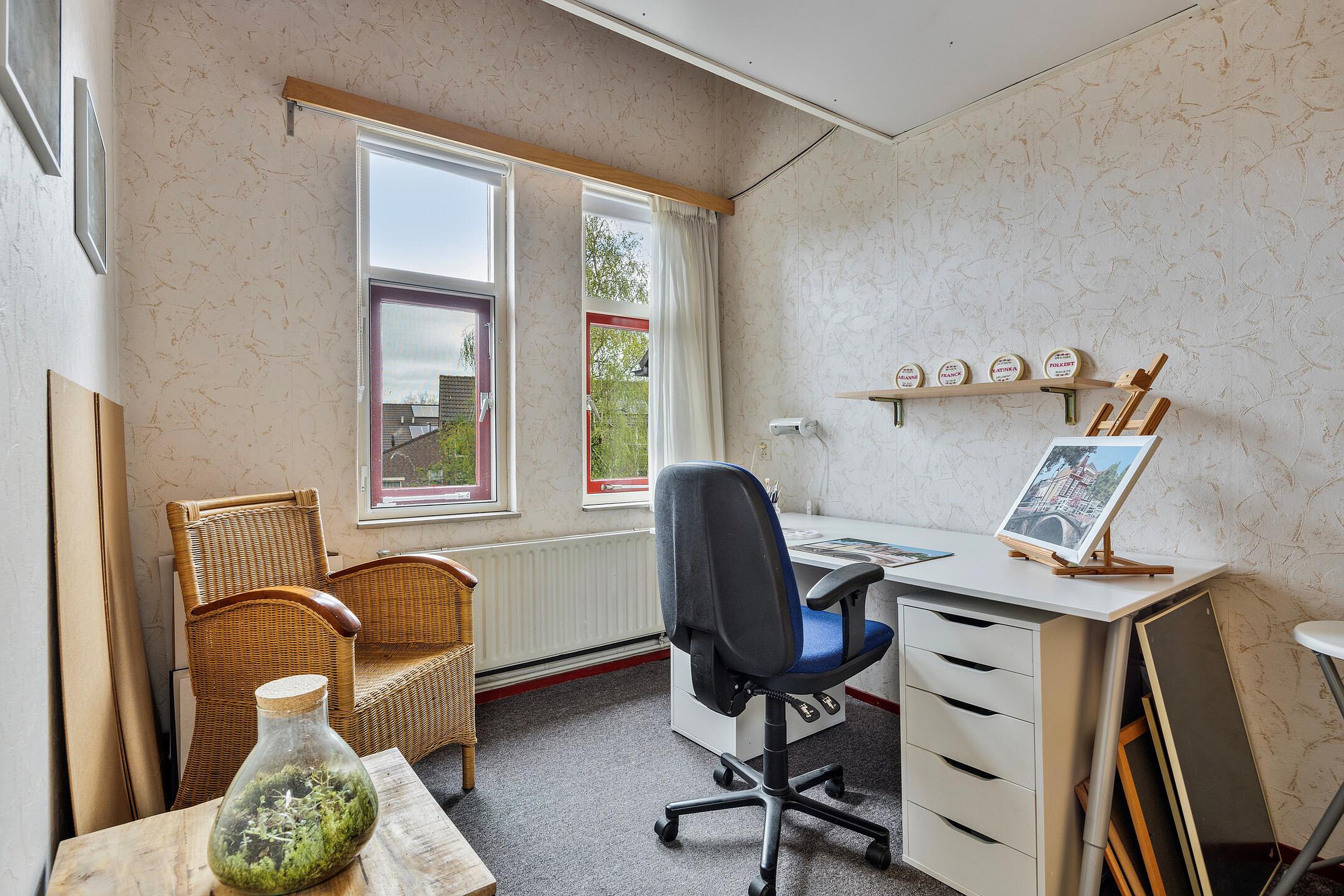 De overloop geeft toegang tot twee ruime slaapkamers en de badkamer. Eén slaapkamer is gelegen aan de achterzijde van de woning. De slaapkamer aan de voorzijde van de woning heeft een vide met bovenin een raam. De badkamer is geheel betegeld en voorzien van een ligbad, douchecabine, wandtoilet en een wastafelmeubel (2002).