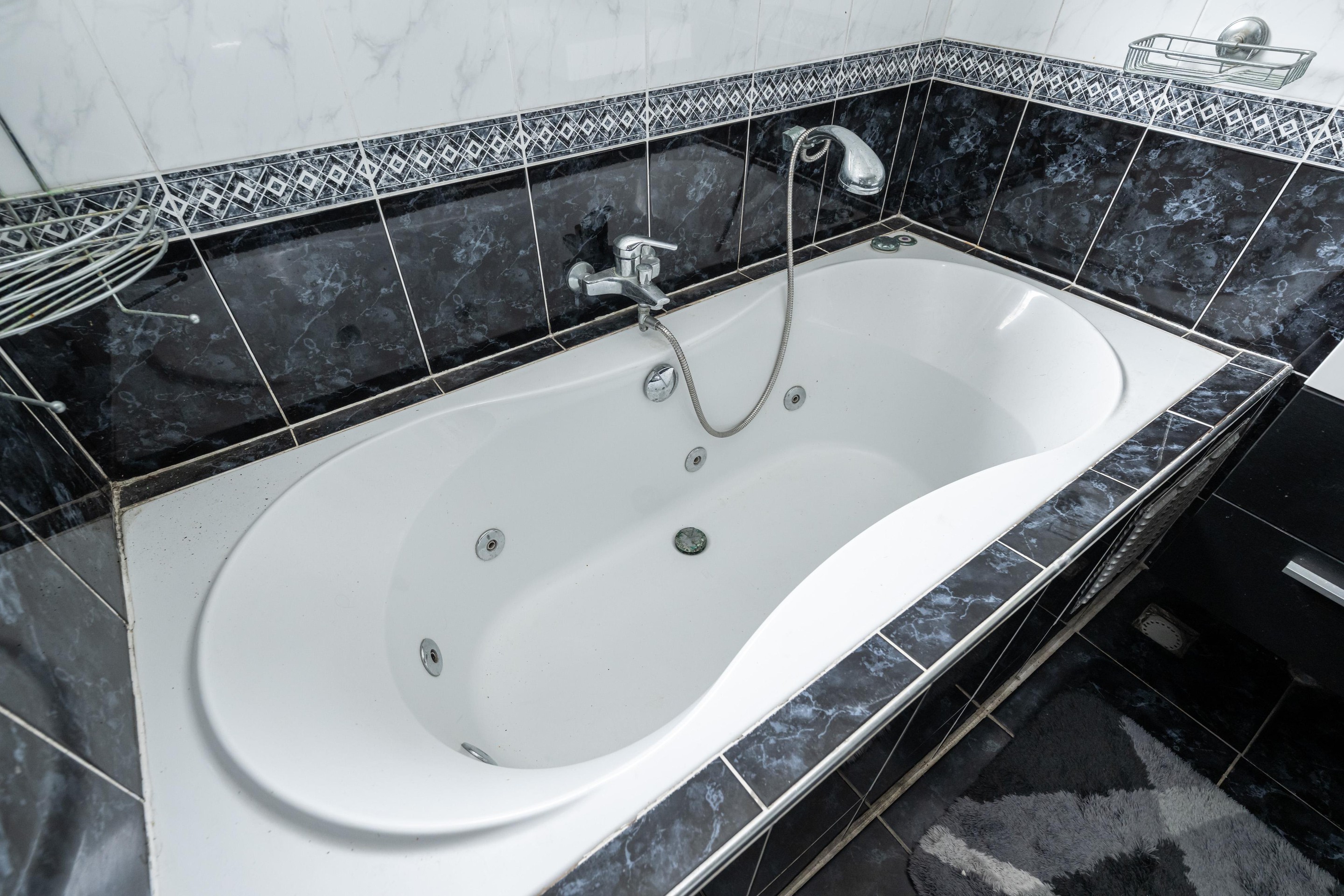 Plavuizenvloer, ligbad, wastafel met meubel, handdoekenradiator, geheel betegeld, zwevend toilet, douche cabine en elektrische afzuiging.
