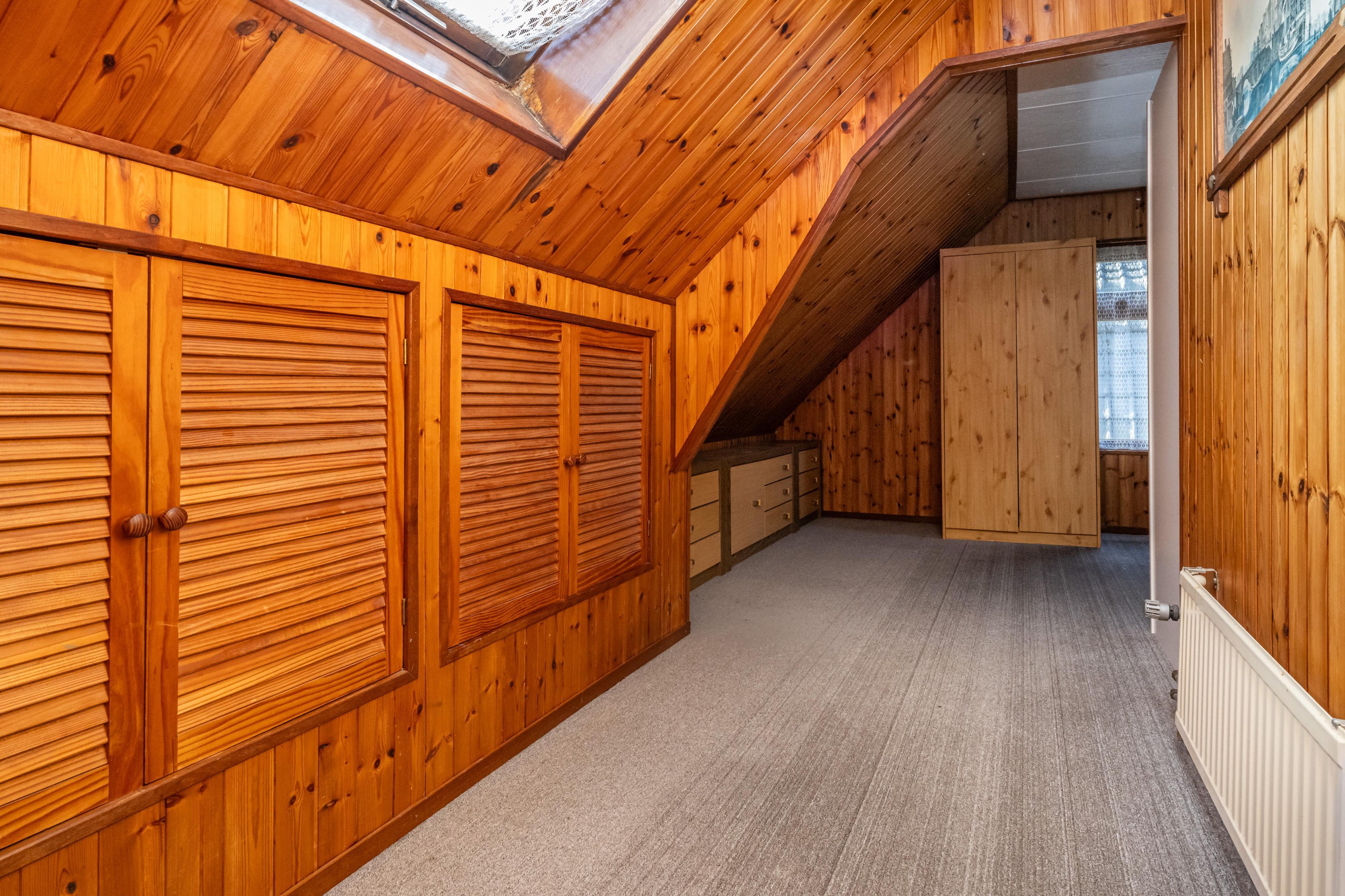 Vloerbedekking, bergkast, dakraam en een radiator.