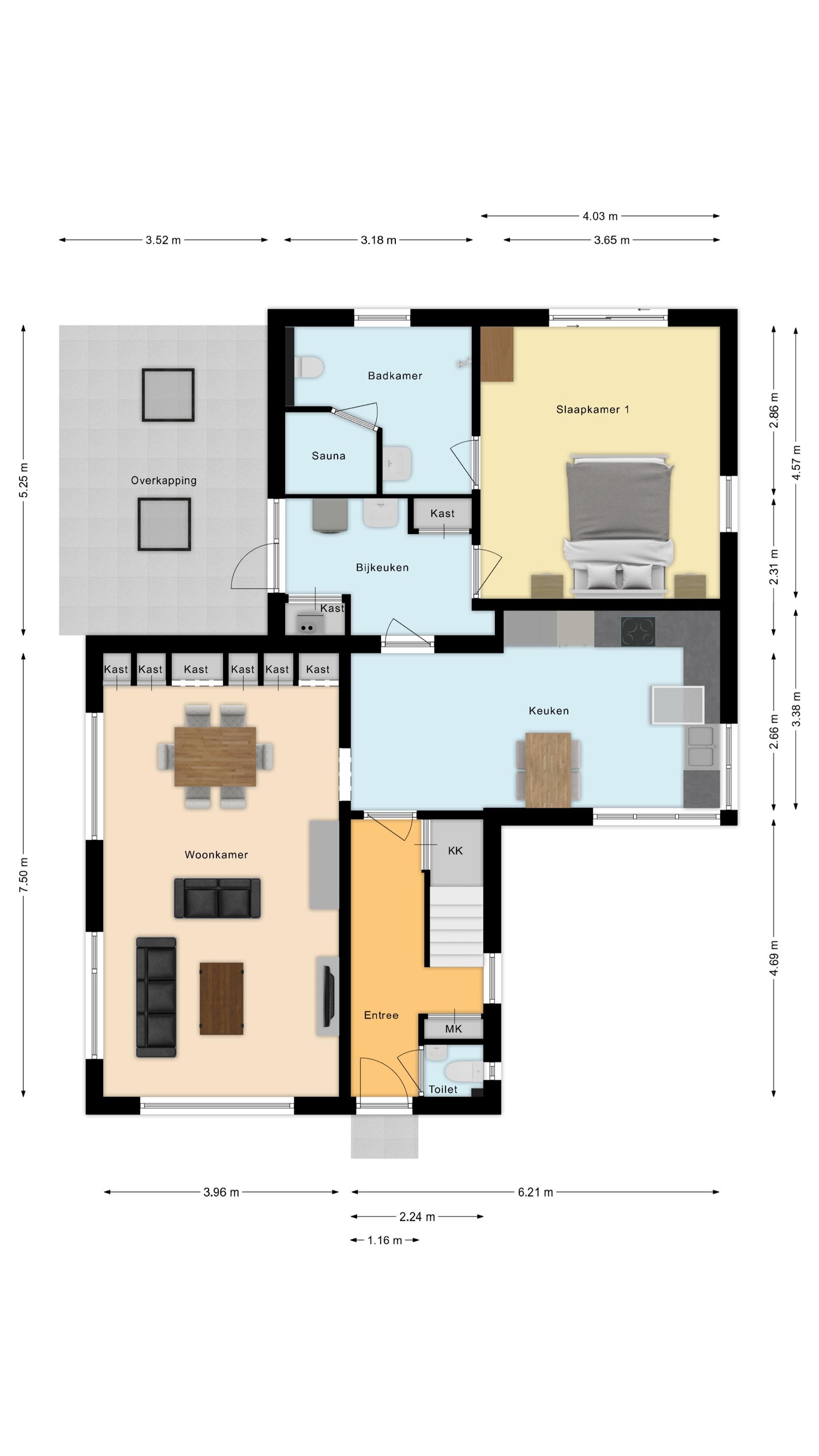 - Badkamer (met sauna) en slaapkamer aanwezig op begane grond; gelijkvloers wonen behoort tot de mogelijkheden;