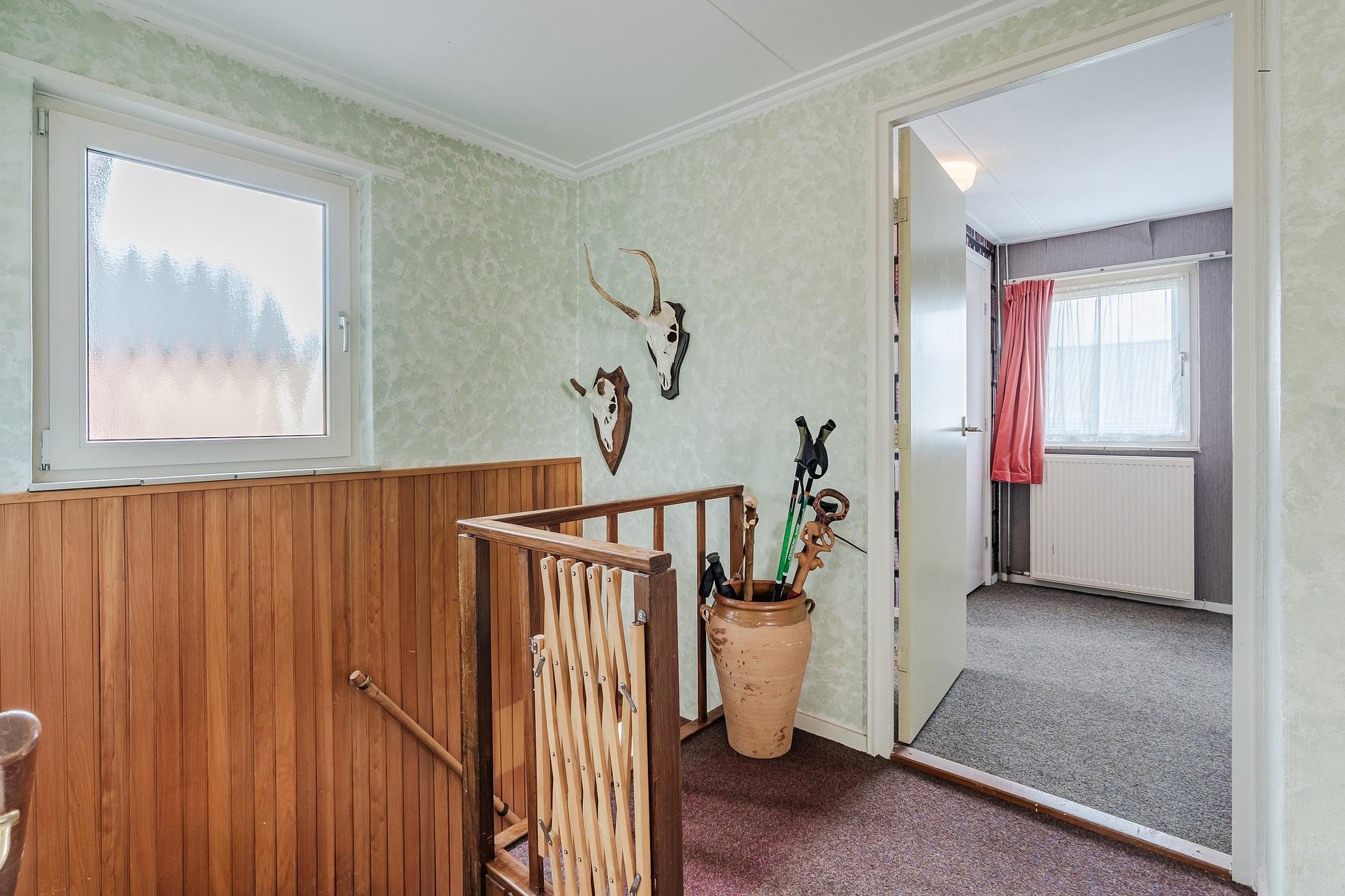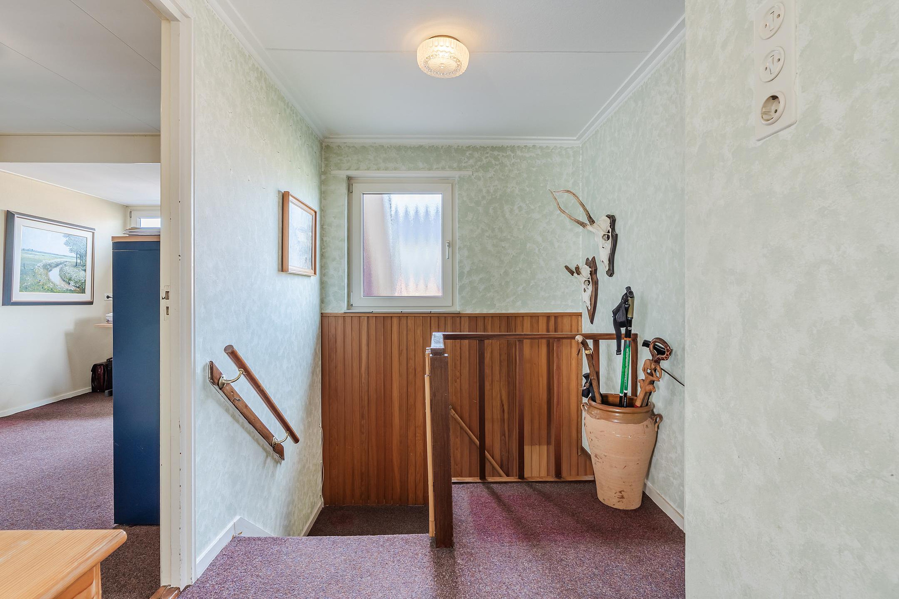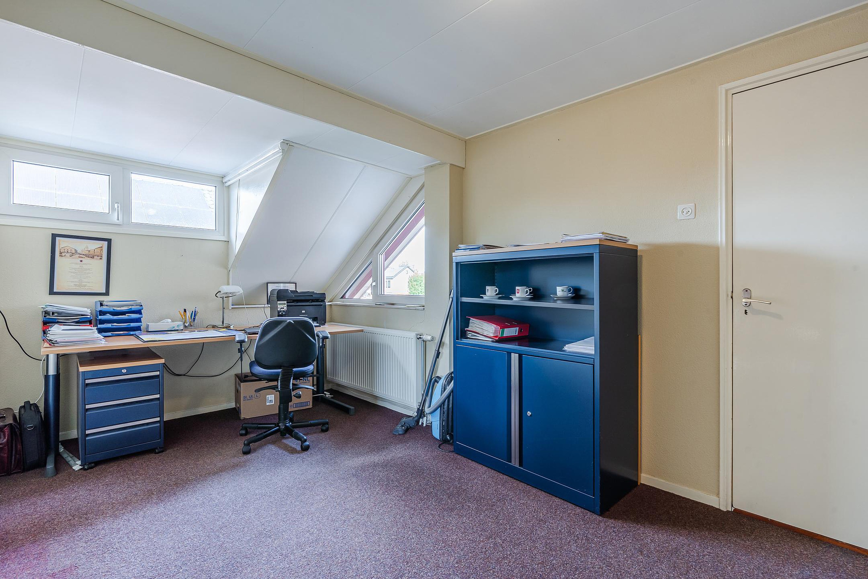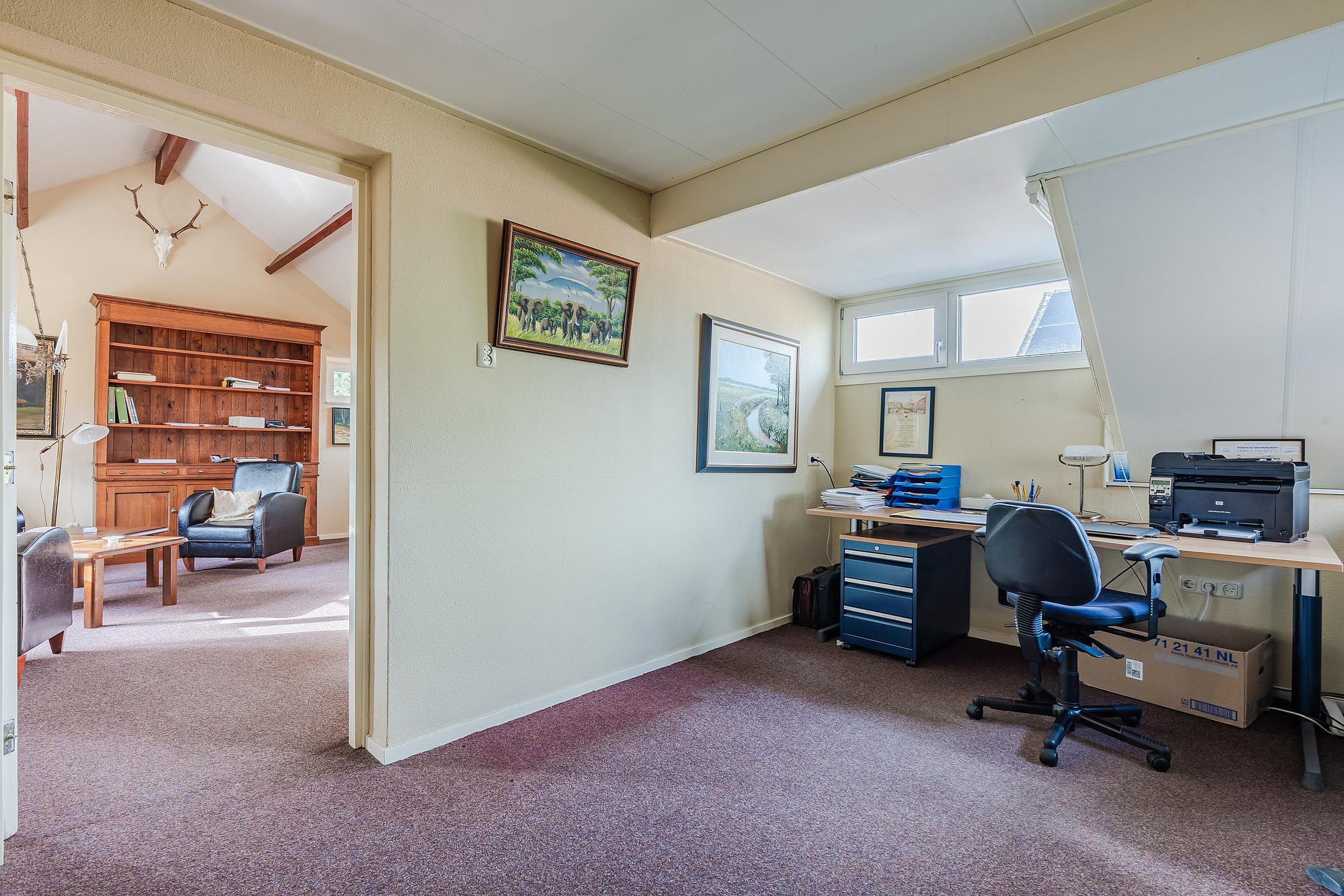 Eerste verdieping Overloop met vlizotrap naar zolderruimte, 1 kamer met vaste kast en 3e wandcloset met fontein, 2 slaapkamers met vaste kasten, 2e badkamer met wastafel, douche-inrichting en design-radiator, kantoor/werkruimte met inbouwkast, royale hobbyruimte/kantoorruimte/master-bedroom met bergruimte achter het knieschot.