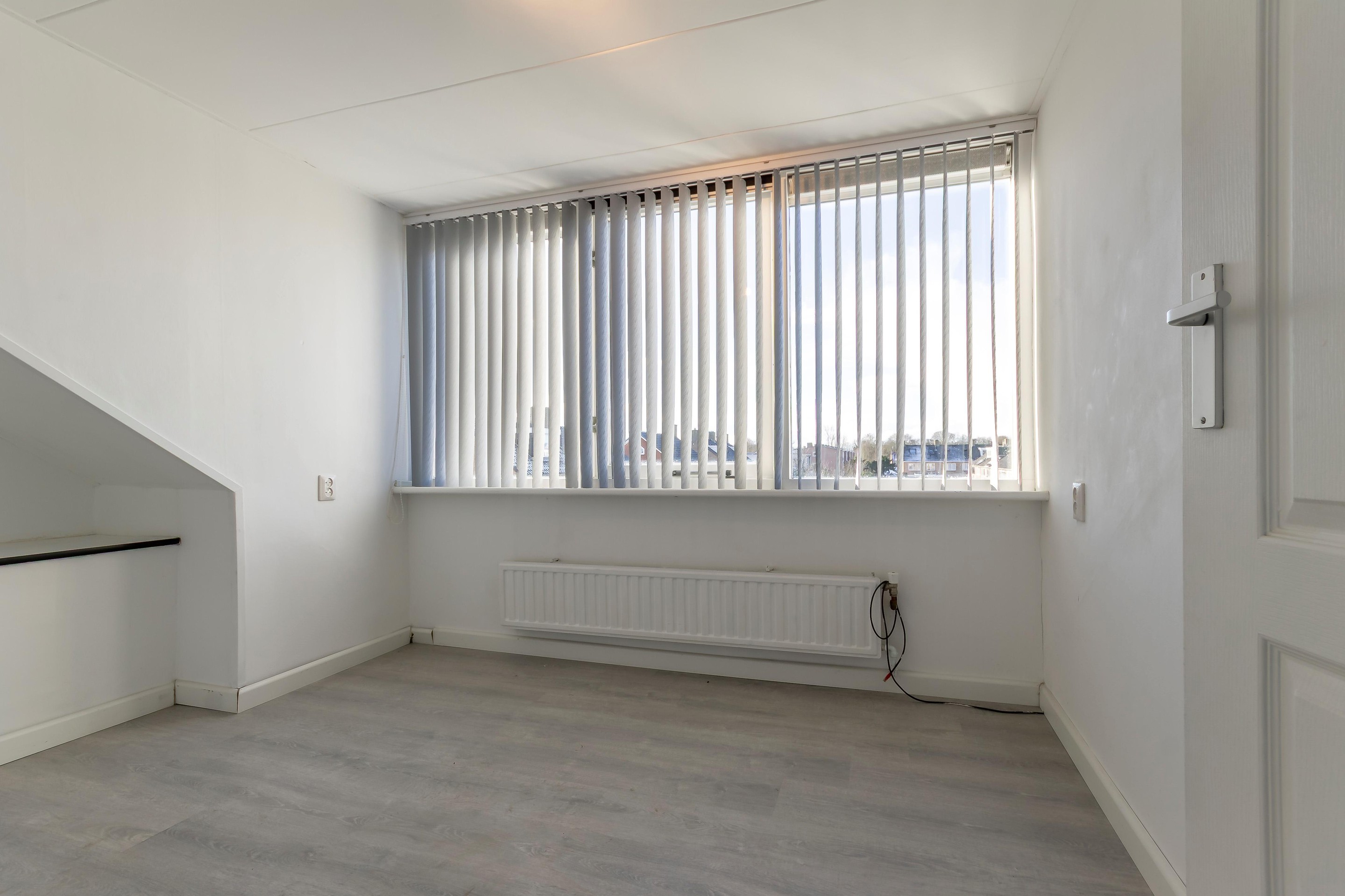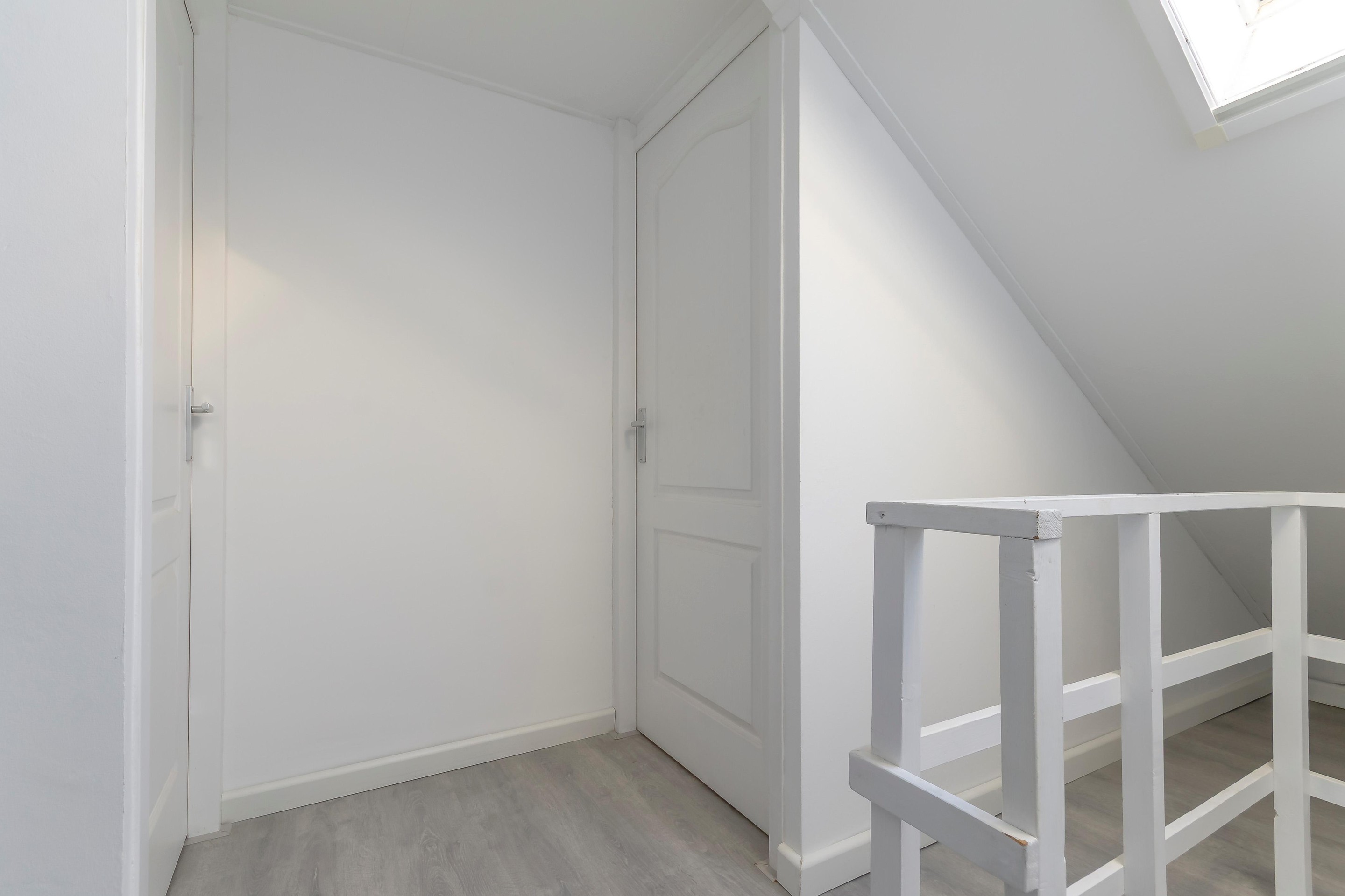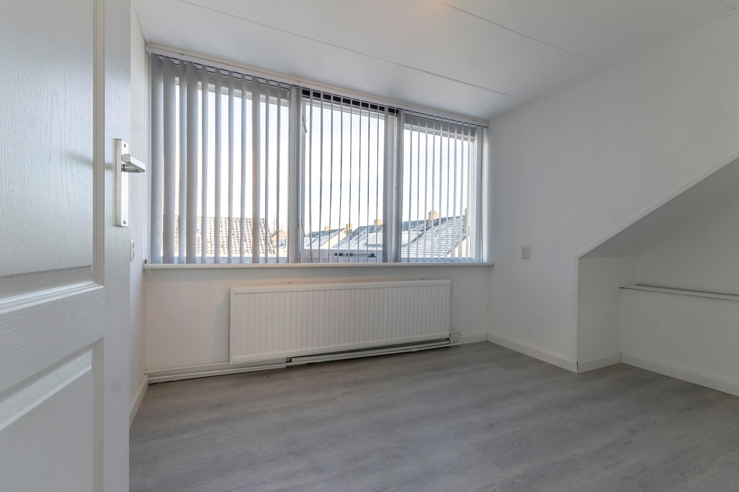 Voortuin, entree, hal met meterkast, straatgerichte woonkamer, vervolgens de aanbouw met keuken aan de tuinzijde. In het midden van de woning een tweede hal met toilet en trapopgang. Op de verdieping drie slaapkamers en een badkamer. De tweede verdieping biedt een kleine overloop en nogmaals twee slaapkamers met beide een dakkapel.