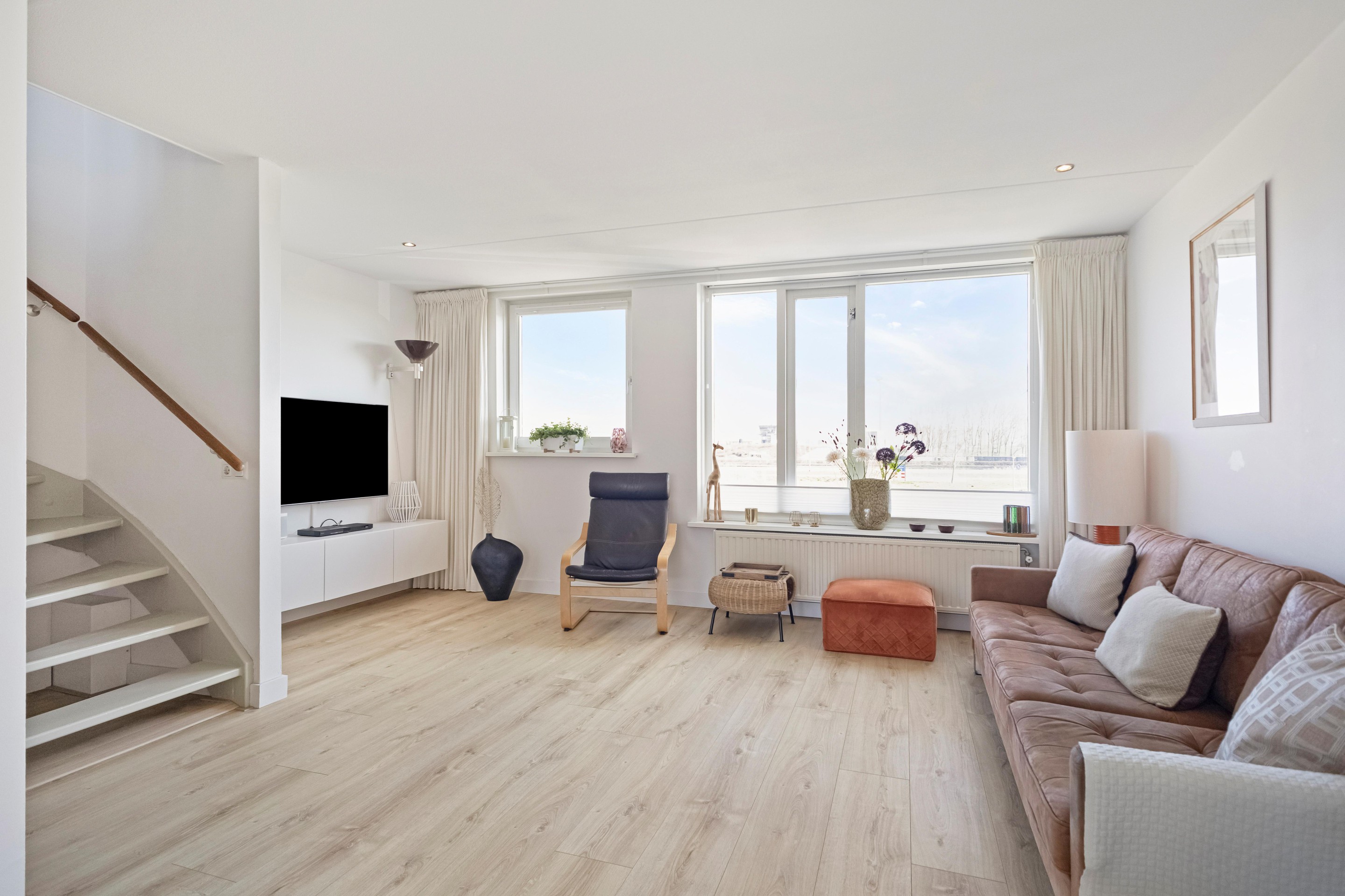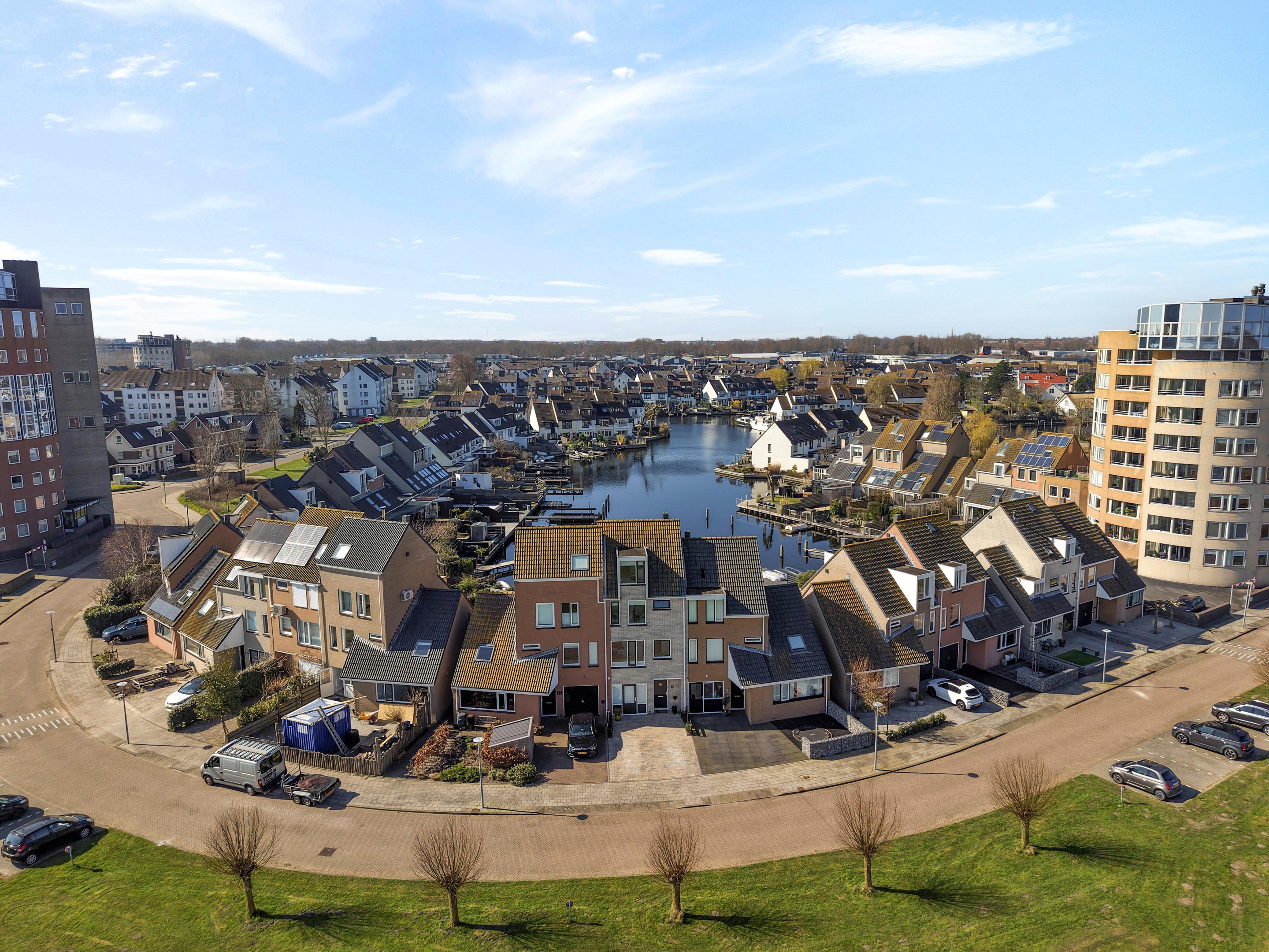 Aan de voorzijde parkeer je op eigen terrein tot wel 2 auto's en kijk je uit over een brede groenstrook. Maar het echte spektakel blijft aan de achterkant: daar leef je met het water, het licht en de ondergaande zon als dagelijks decor. Dit is zo’n woning die je niet volledig vangt in foto’s of plattegronden. Je moet het ervaren: het licht, de indeling, het uitzicht, de rust.