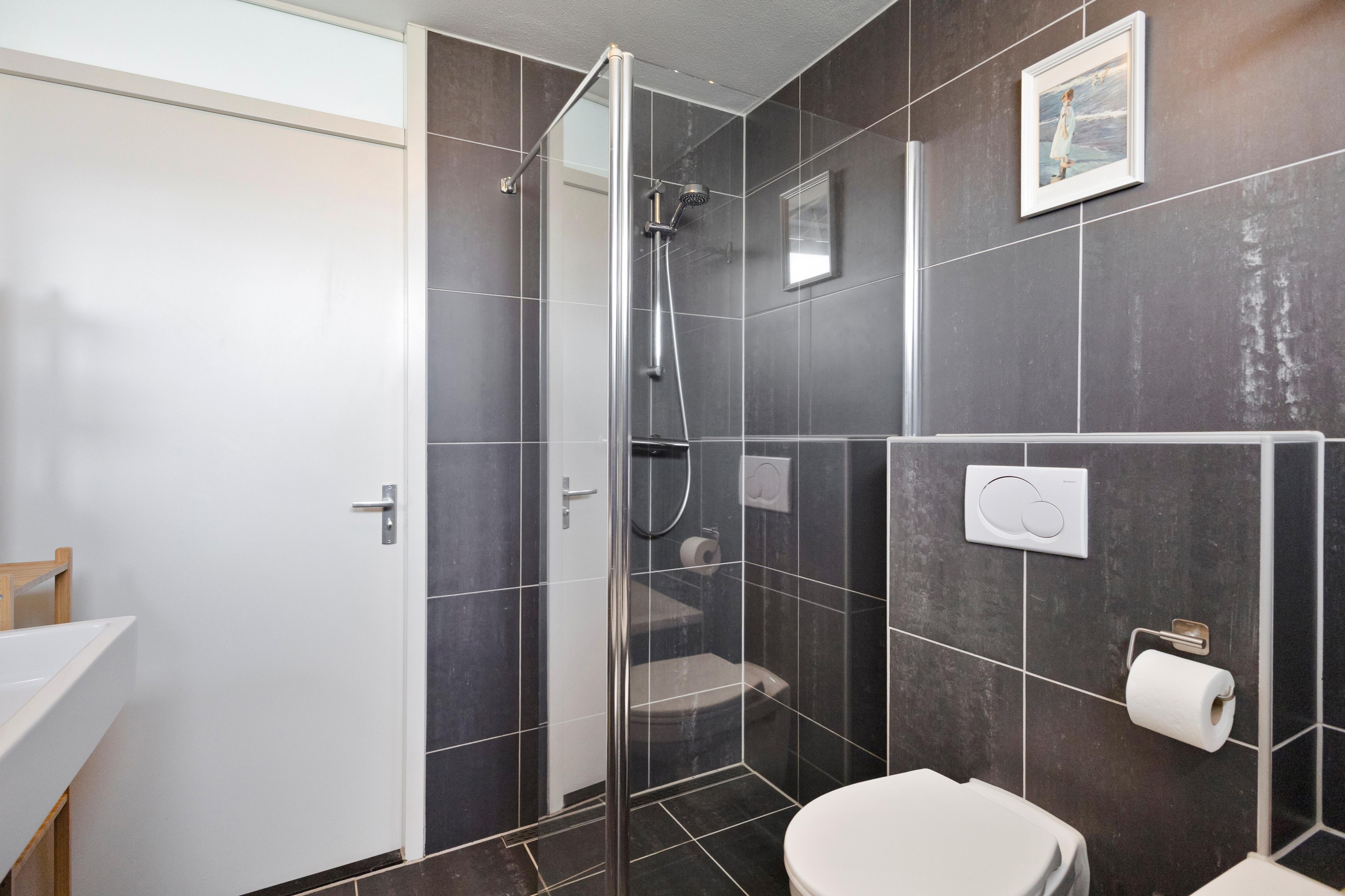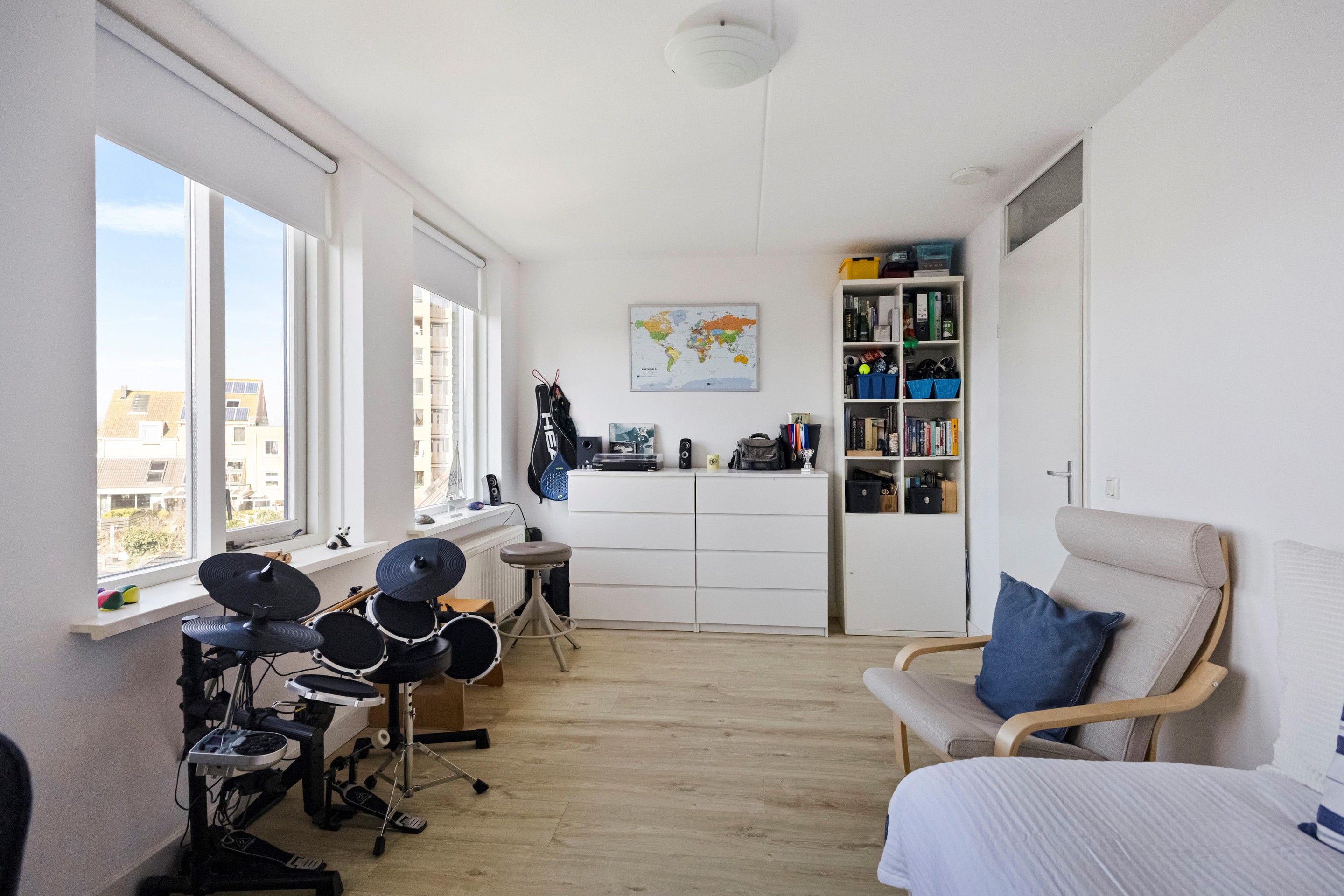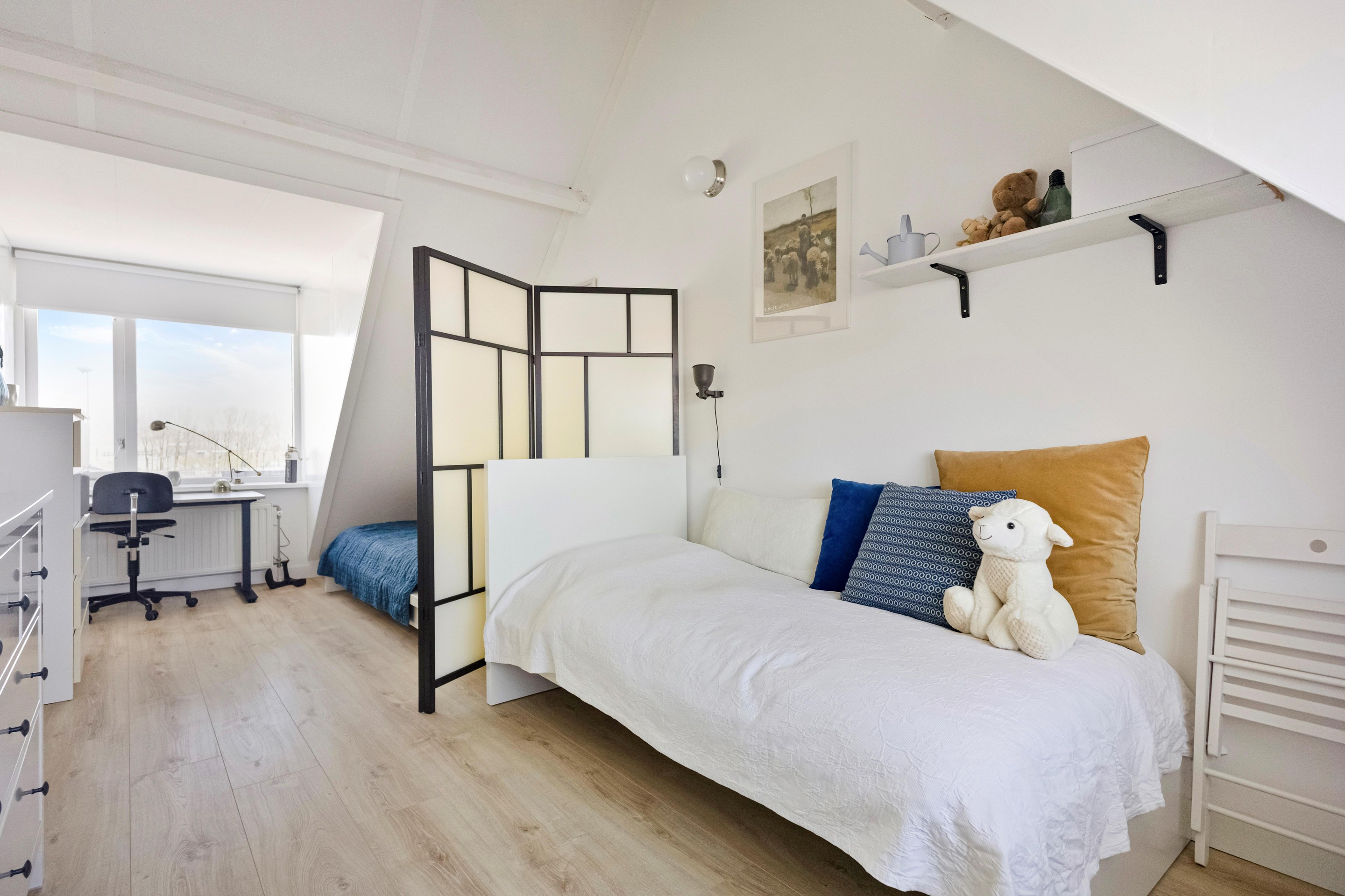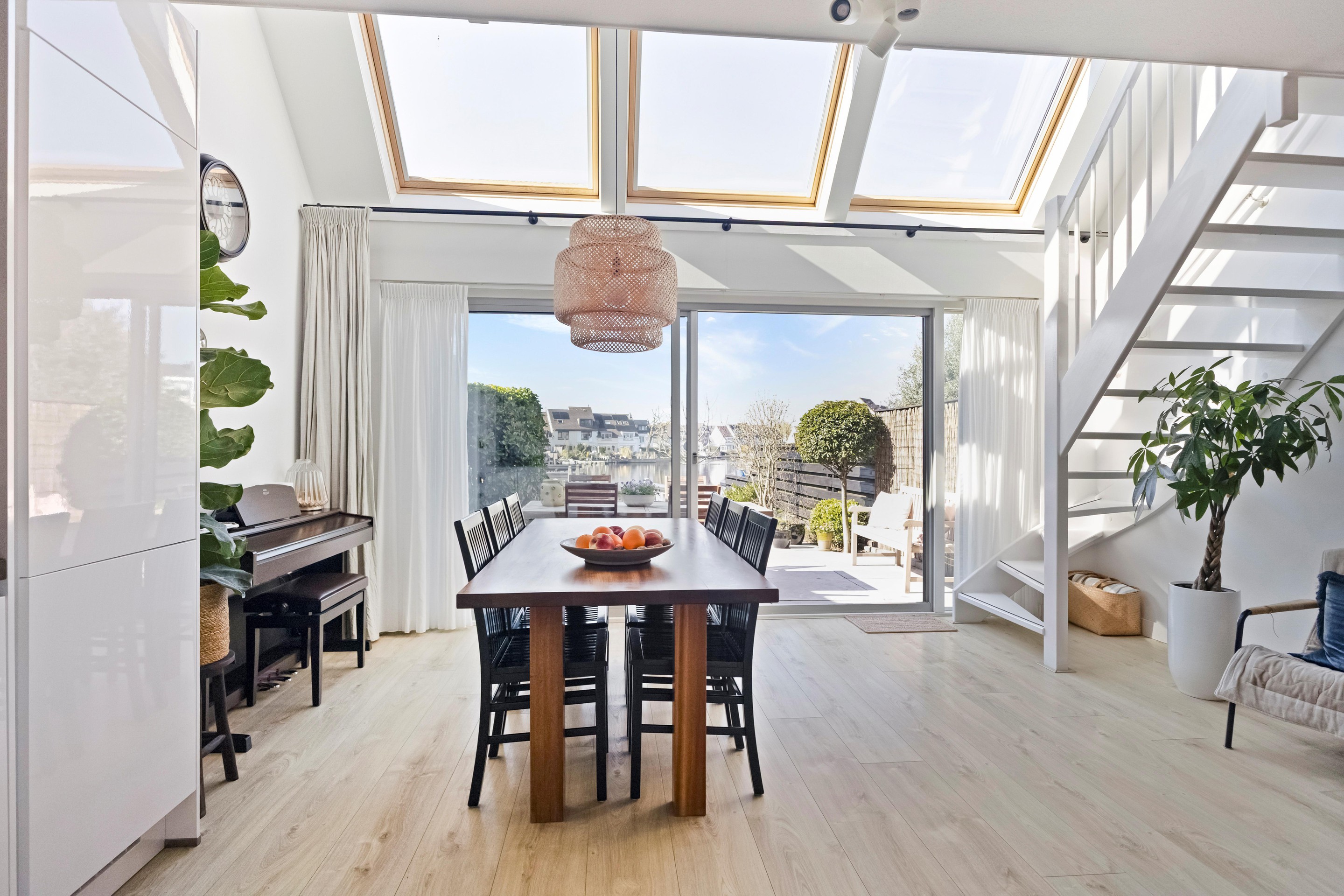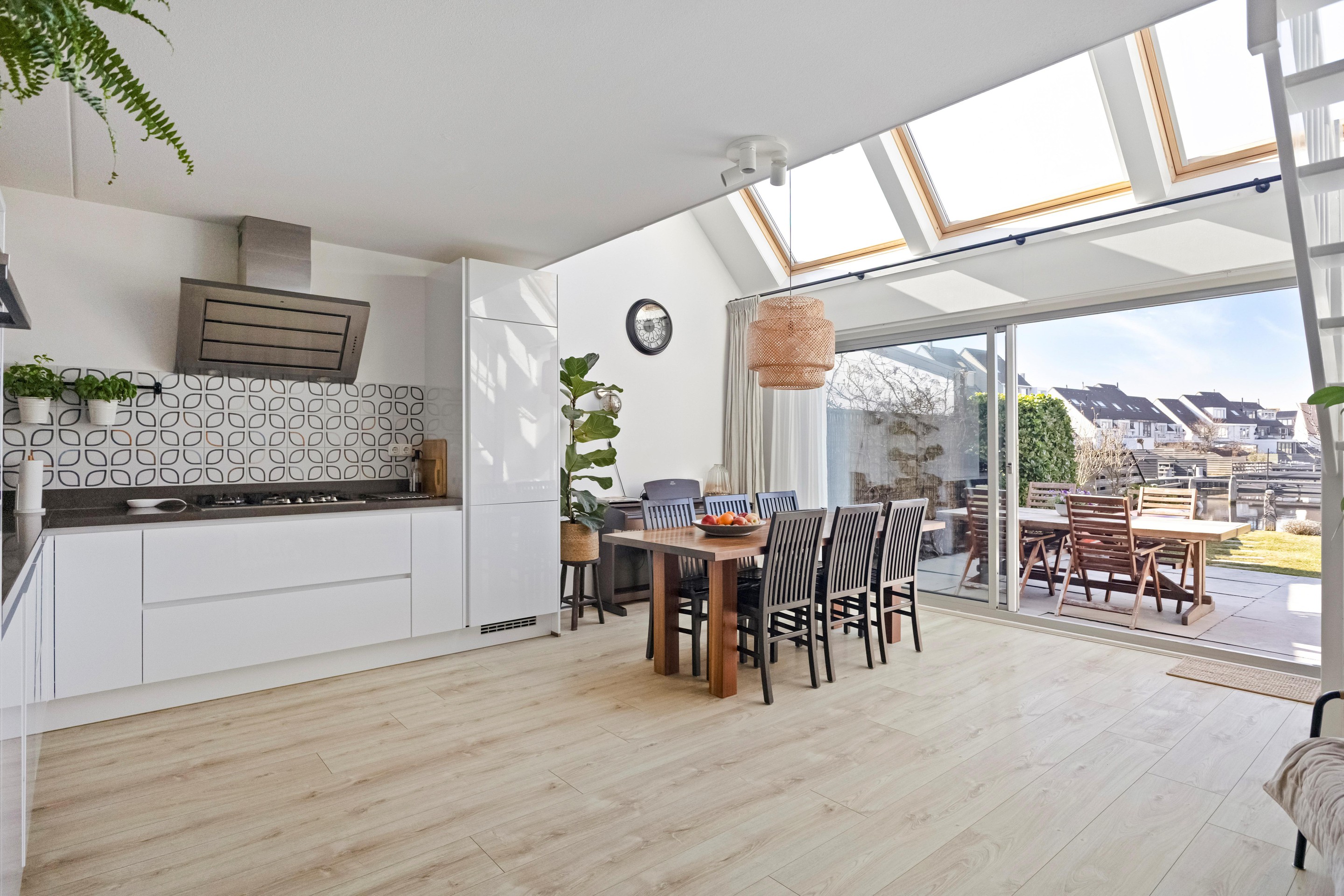 Binnen is de indeling net even anders dan standaard, en juist dat maakt het interessant. Je komt binnen op de begane grond waar zich een royale woonkeuken bevindt van bijna 30 m2. Dit is geen bijruimte, maar echt een leefplek. De moderne inbouwkeuken is recent geplaatst en via de volledig glazen schuifpui loopt binnen hier geruisloos over in buiten. Op mooie dagen staat alles open en wordt de tuin gewoon onderdeel van je huis. En die tuin… die ligt dus direct aan het water. Recent vernieuwd met een strak vlonderterras aan de kade, inclusief water- en elektrapunt. Boot aanleggen, suppen, vissen of gewoon kijken , het kan hier allemaal. Via een open trap met vide kom je in de woonkamer op de eerste verdieping. Een lichte, ruime plek van circa 36 m2, met aan beide zijden uitzicht en een bijzonder prettige lichtinval dankzij maar liefst zes Velux dakramen met op afstand bedienbare zonwering. Hier zit je letterlijk tussen lucht en water in. De tweede verdieping biedt twee ruime slaapkamers (ca. 14 en 15 m2) en een moderne, volledig betegelde badkamer met ligbad, inloopdouche, wastafelmeubel en tweede toilet. Alles strak, comfortabel en logisch ingedeeld. Een riante derde slaapkamer vind je op de derde verdieping, over de volledige lengte van de woning, en zoals eerder geschreven recent vergroot met een dakkapel. Nu één grote ruimte, maar eenvoudig op te delen in twee kamers als dat beter past. Ideaal voor wie extra kamers nodig heeft of gewoon houdt van veel ruimte. Naast de ruime slaapkamer vind je op deze verdieping ook nog een wasruimte met de CV opstelling en een separate bergruimte.
