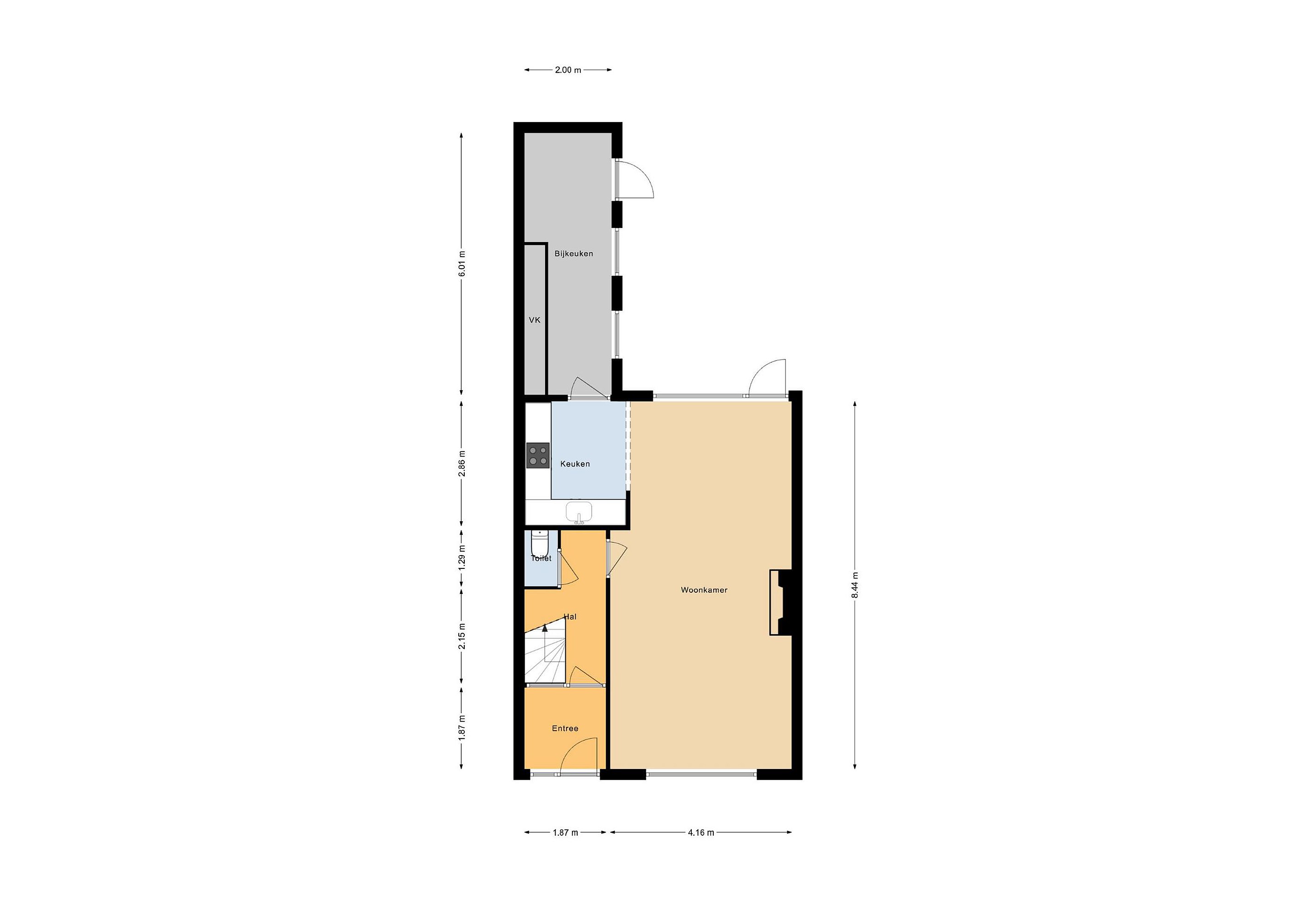 Begane grond: Entree met vingerafdrukscanner, hal met meterkast, toilet en trapopgang, woonkamer met houtkachel, keuken en bijkeuken.