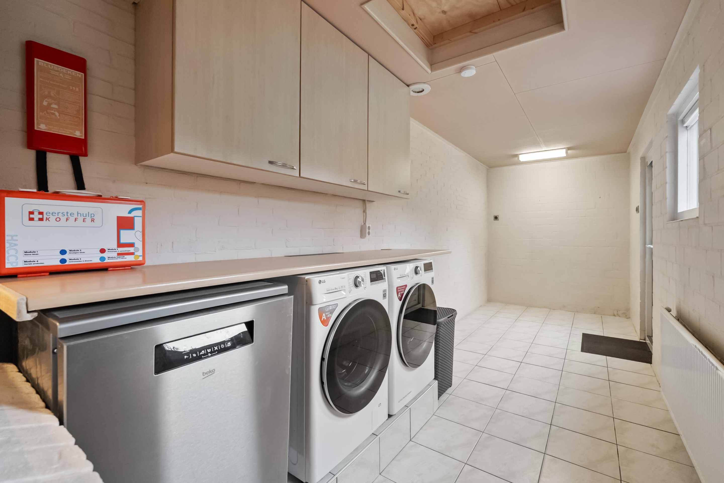 Je betreedt de woning in een ruime hal met tochtportaal, uitgevoerd in glas-in-lood, vervolgens een gerenoveerde trap met verlichting met daaronder een kelderkast. In de hal bevindt zich ook het toilet, dit betreft een vernieuwde Geberit wc-douche. Hierna de leefruimte. De woonkamer is sfeervol afgewerkt met een hoogwaardige pvc-vloer en houtkachel met schouw en houtopslag. De open keuken in hoekopstelling heeft een tijdloze kleurstelling en diverse inbouwapparatuur, waaronder inductiekookplaat, combi-oven, plintboiler en koelkast. Aansluitend ligt een royale bijkeuken met bergruimte en plaats voor witgoed en vaatwasser.