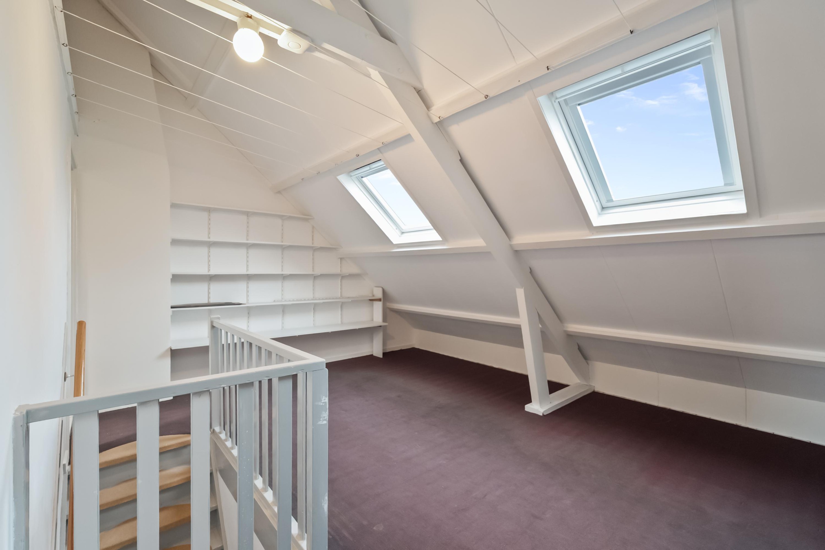 Tweede verdieping: Voorzolder met plaatsing van de hybride warmtepomp, Cv ketel en omvormer. vervolgens twee slaapkamers.