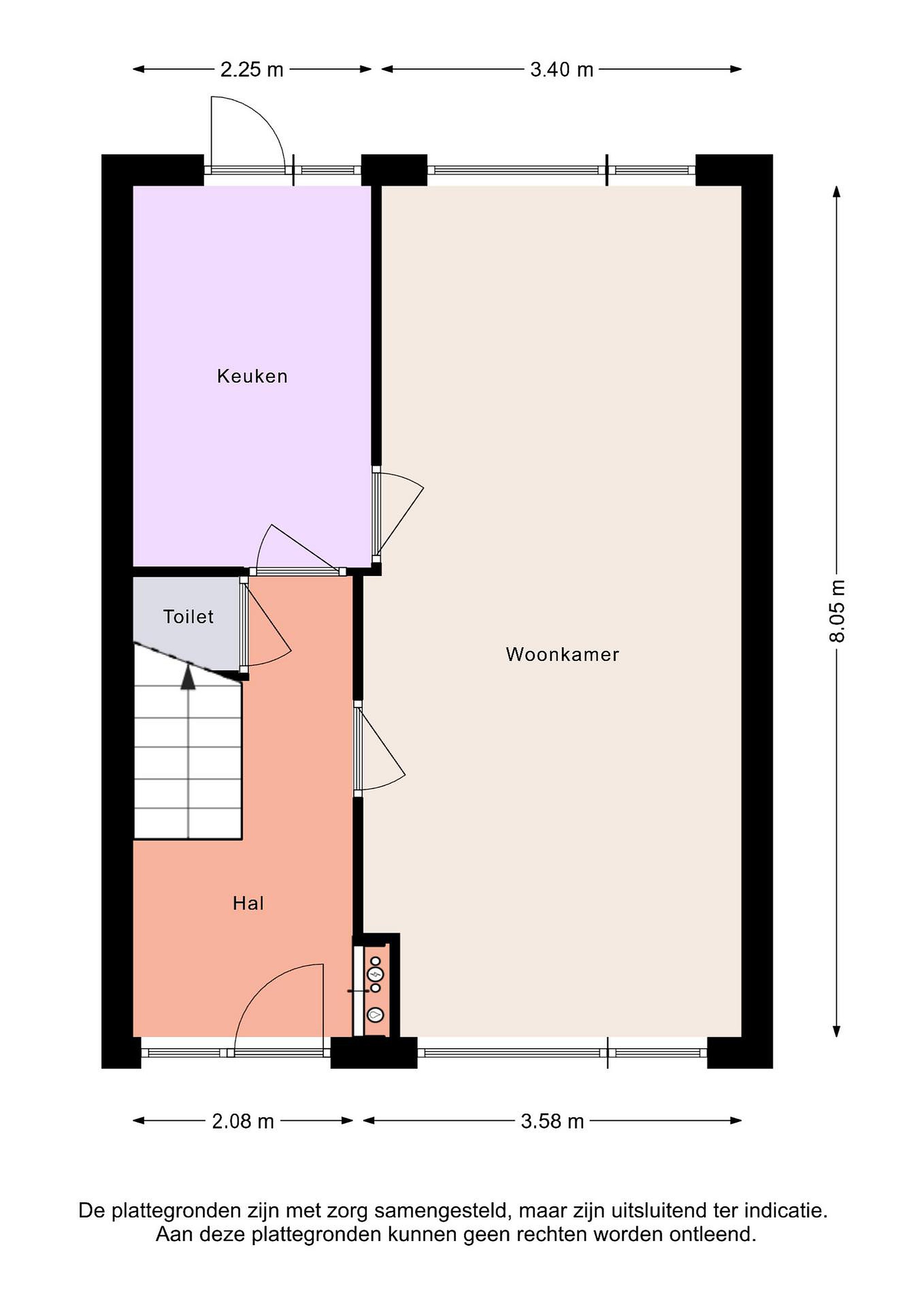 Begane grond: voortuin, entree, hal met meterkast, toilet en trapopgang, woonkamer, keuken en achtertuin met berging en achterom.