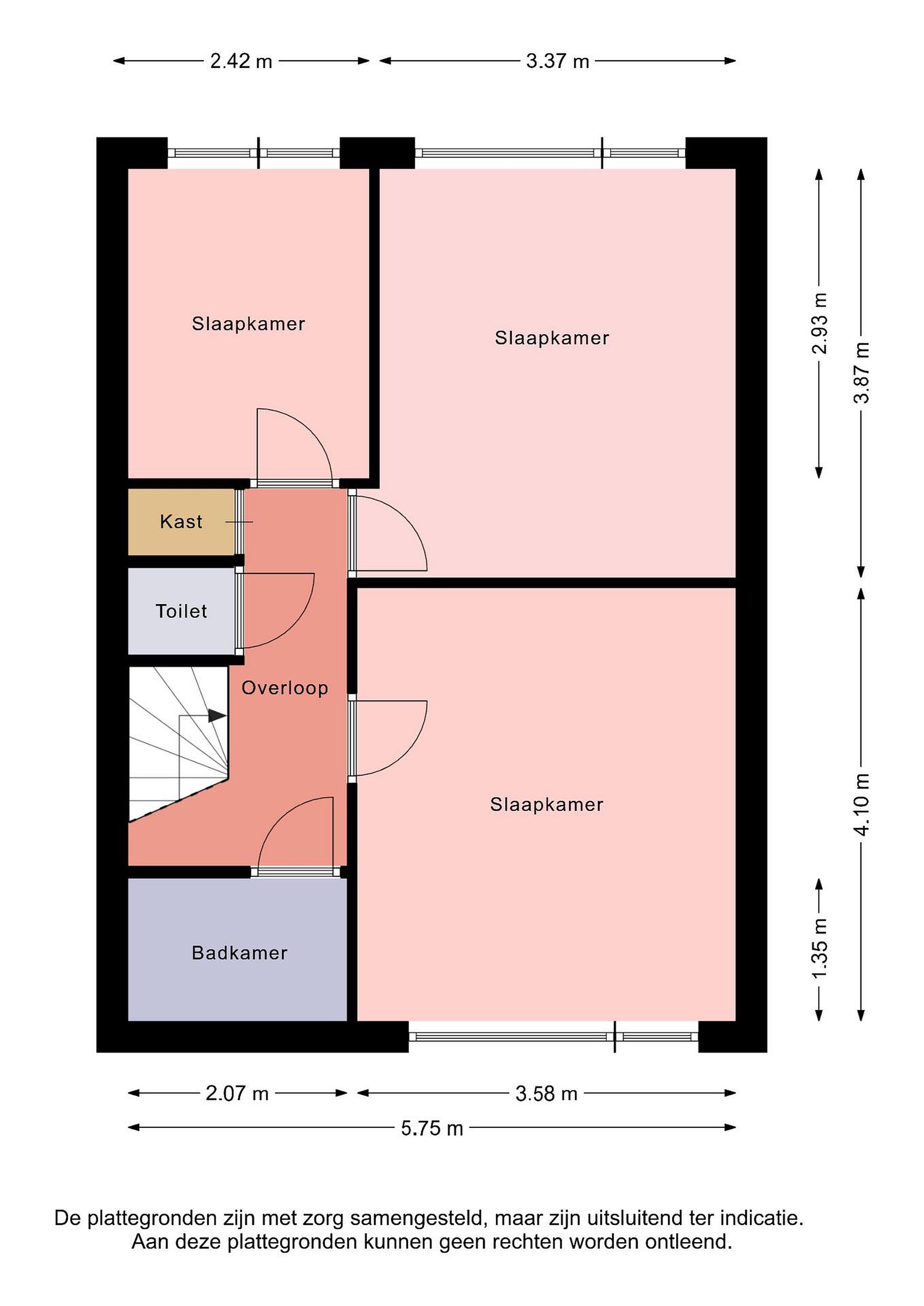 Verdieping: overloop met toilet en vaste kastruimte, drie slaapkamers en badkamer.
