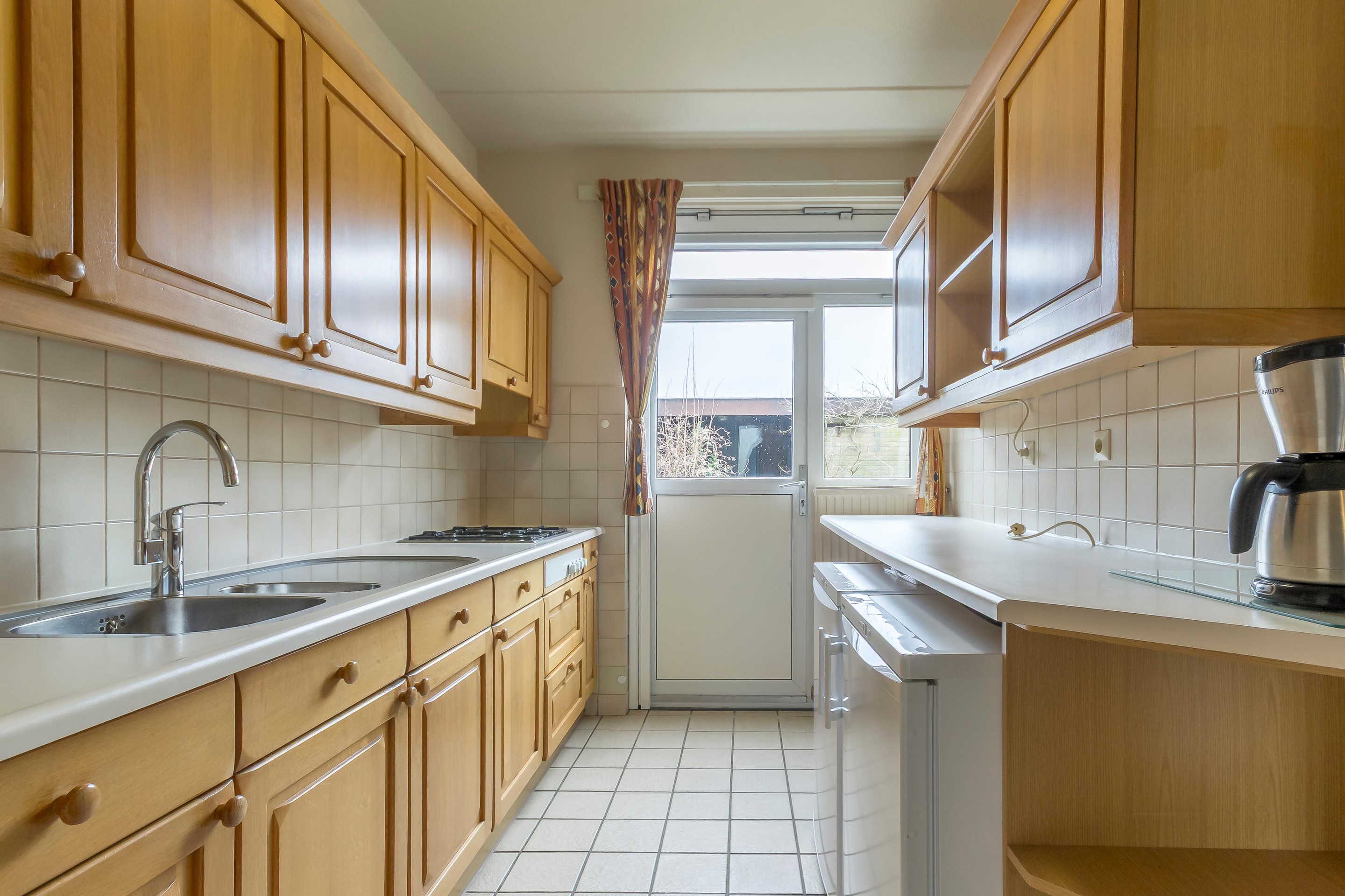 De keuken is zowel vanuit de hal als de woonkamer bereikbaar. Het betreft een degelijke houten keuken van een kwaliteit die tegenwoordig niet meer geleverd wordt. De keuken is voorzien van diverse inbouw- en losse apparatuur.