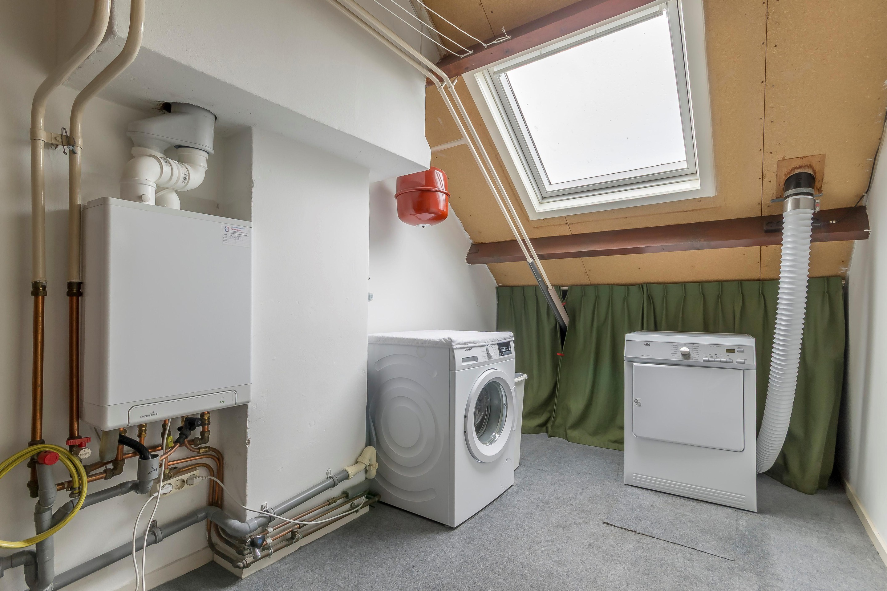 Tweede verdieping: voorzolder met aansluitingen voor wasmachine, droger en CV-ketel.