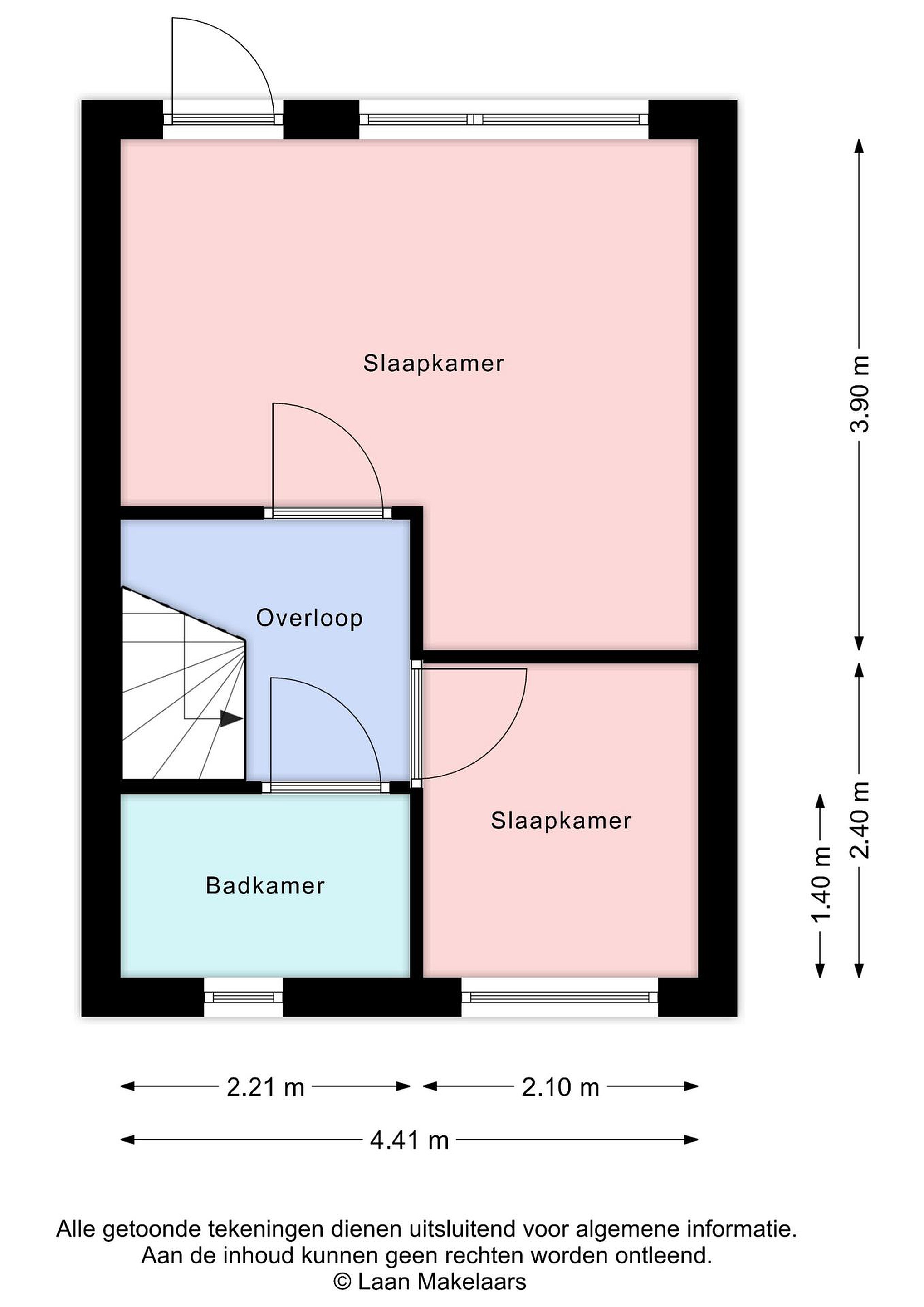 Verdieping: overloop, twee slaapkamers en badkamer.