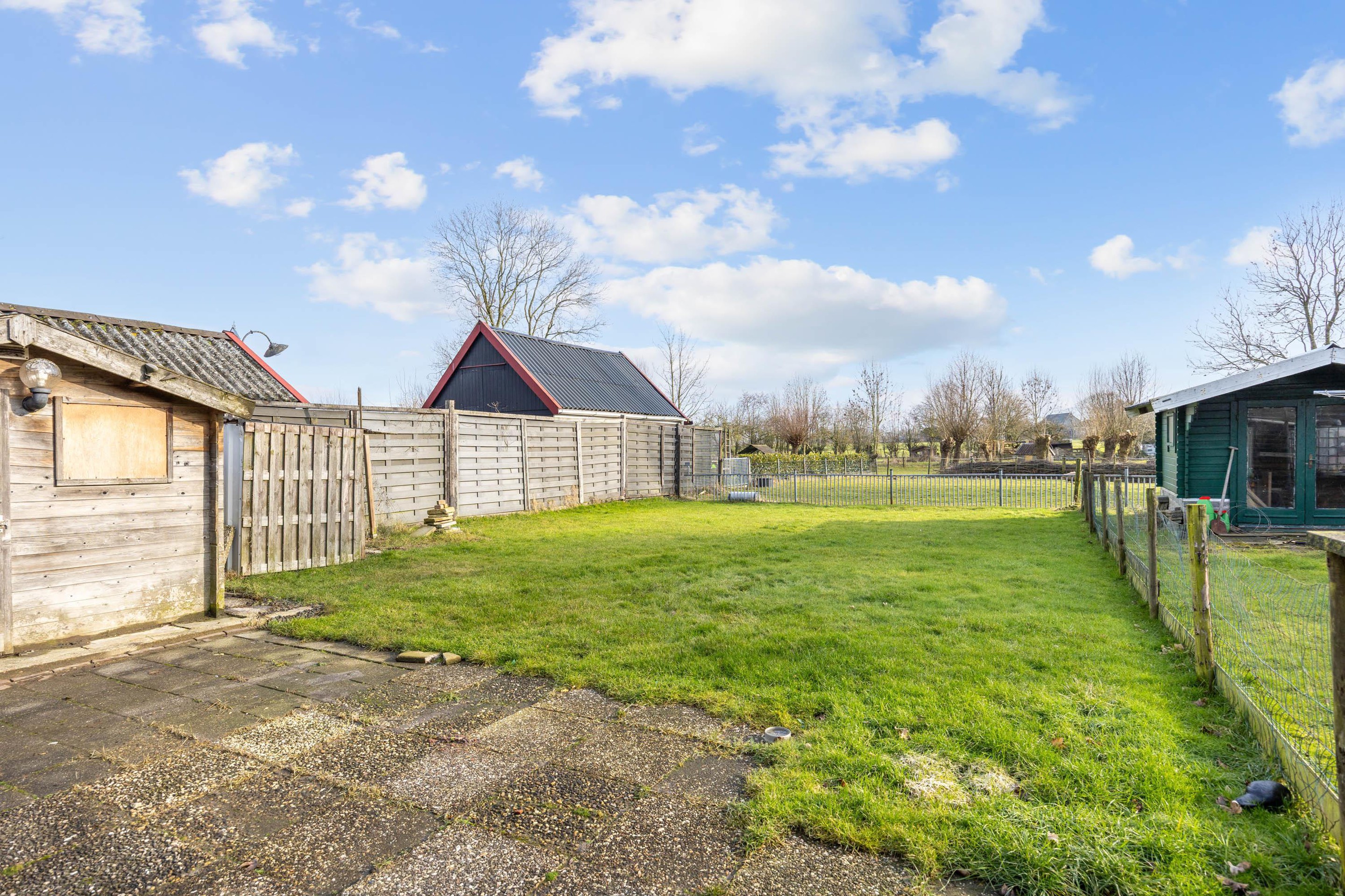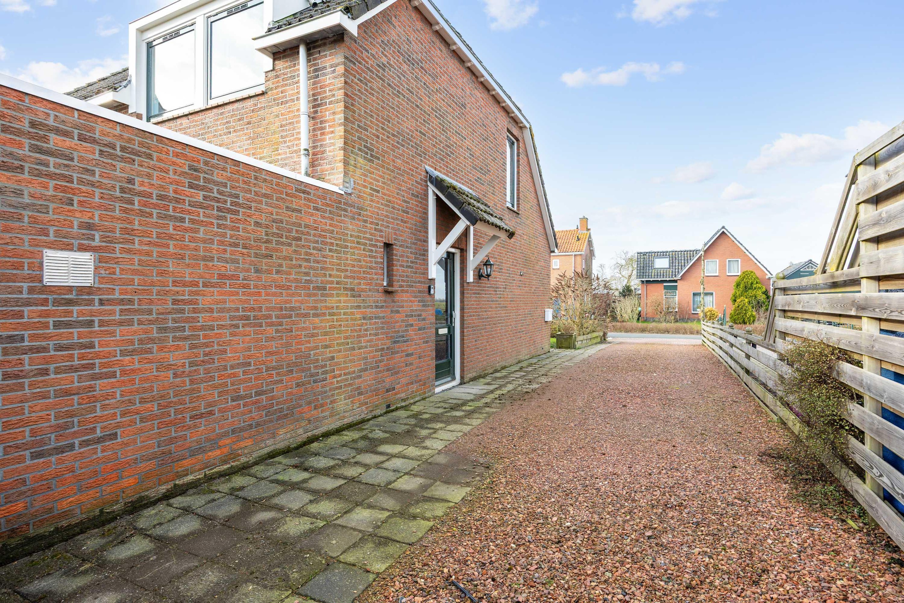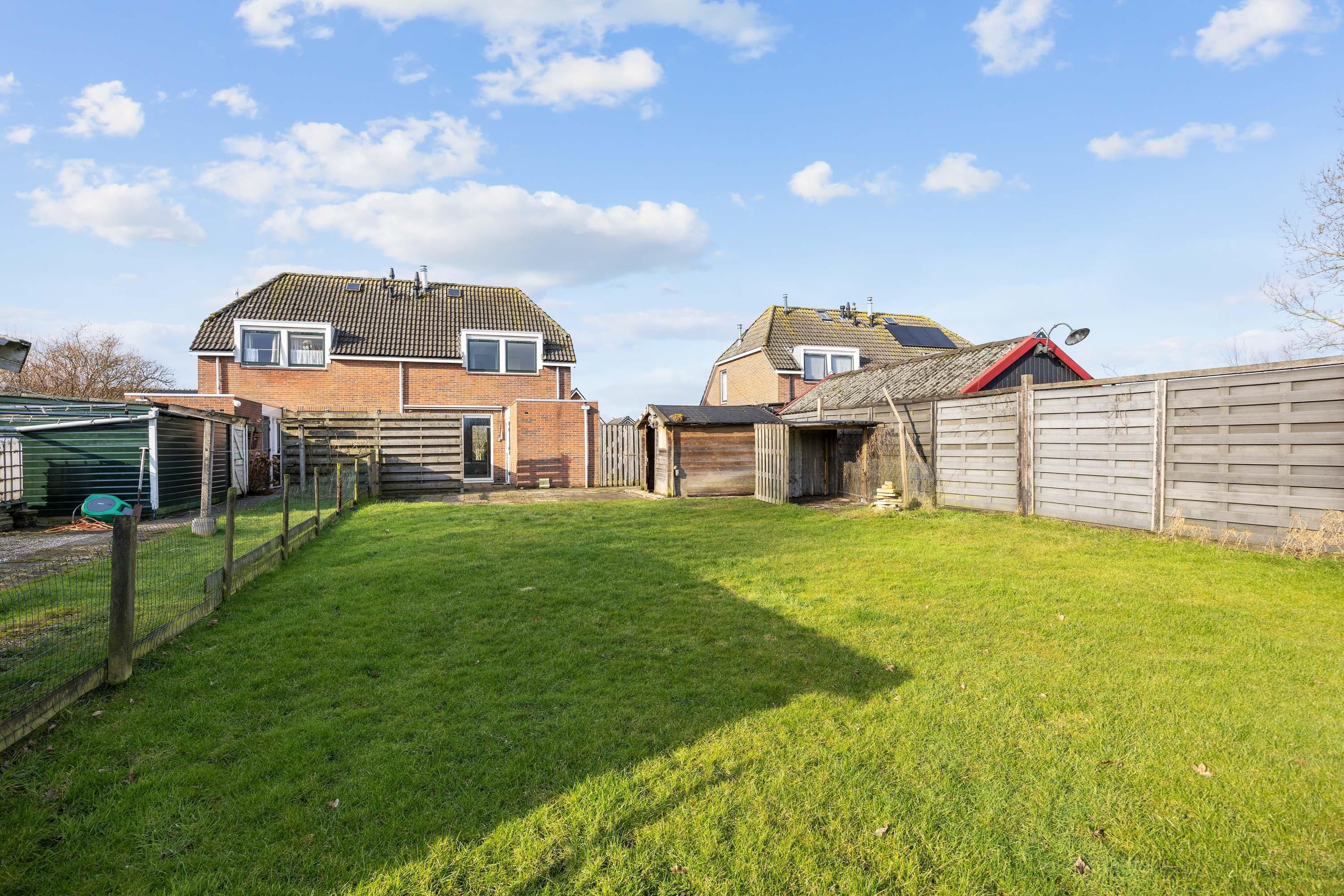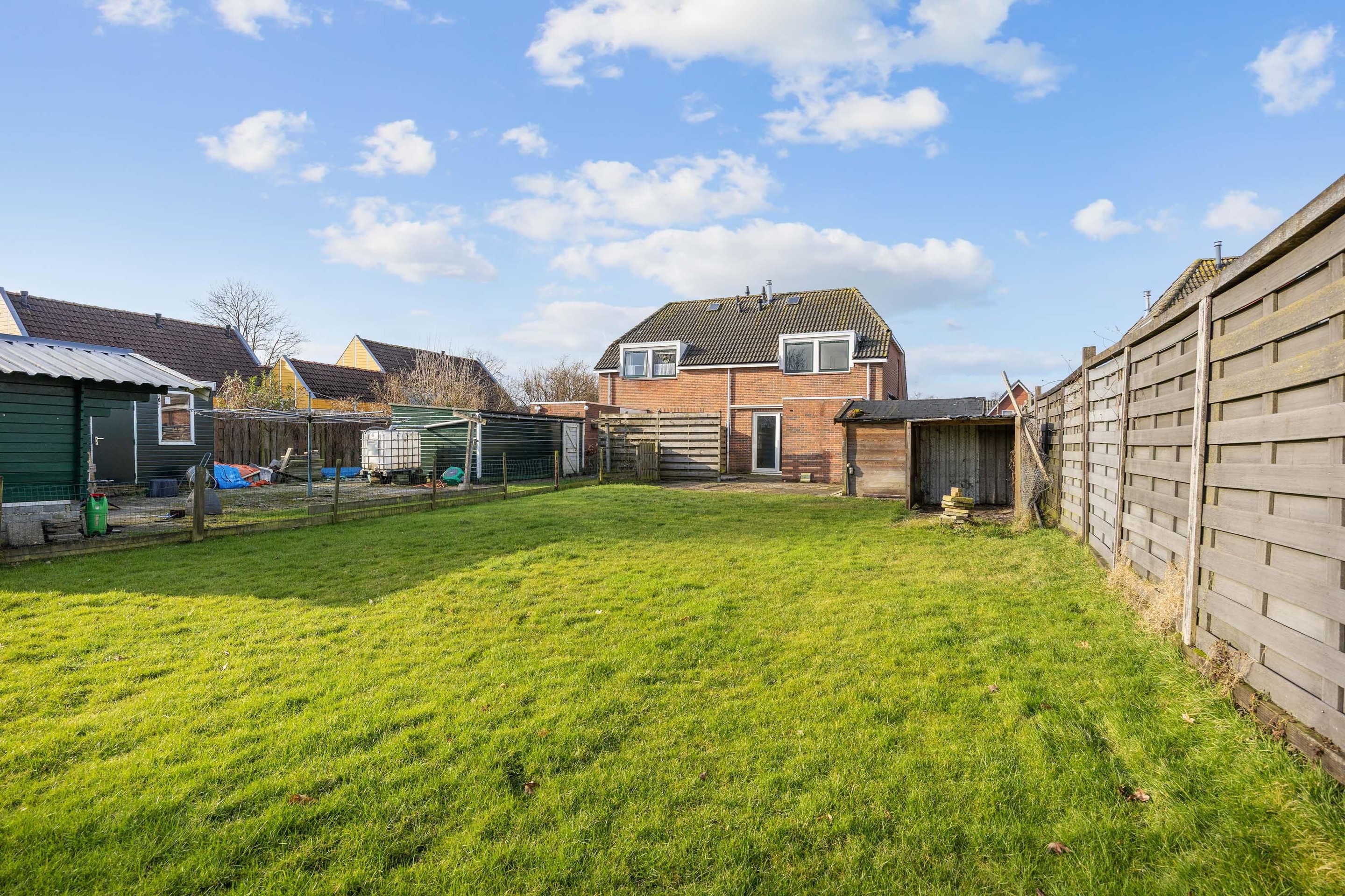 Aan de voorzijde bevindt zich een ruime voortuin en een grote oprit met parkeergelegenheid op eigen terrein. Er is een diepe achtertuin, ingericht met bestrating en gazon en een houten berging. Vanuit de tuin is een vrij en groen uitzicht, wat bijdraagt aan een prettige en rustige sfeer.