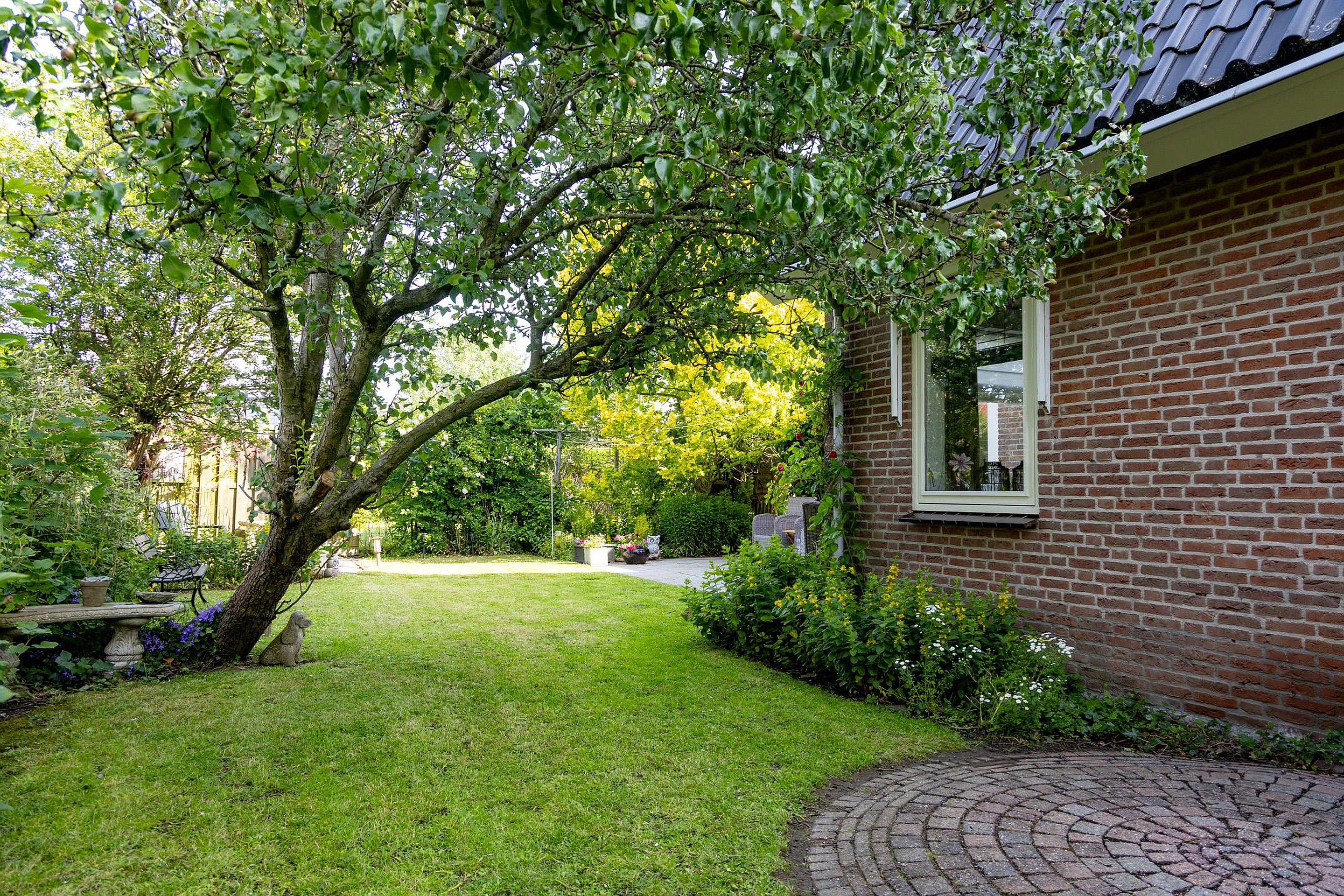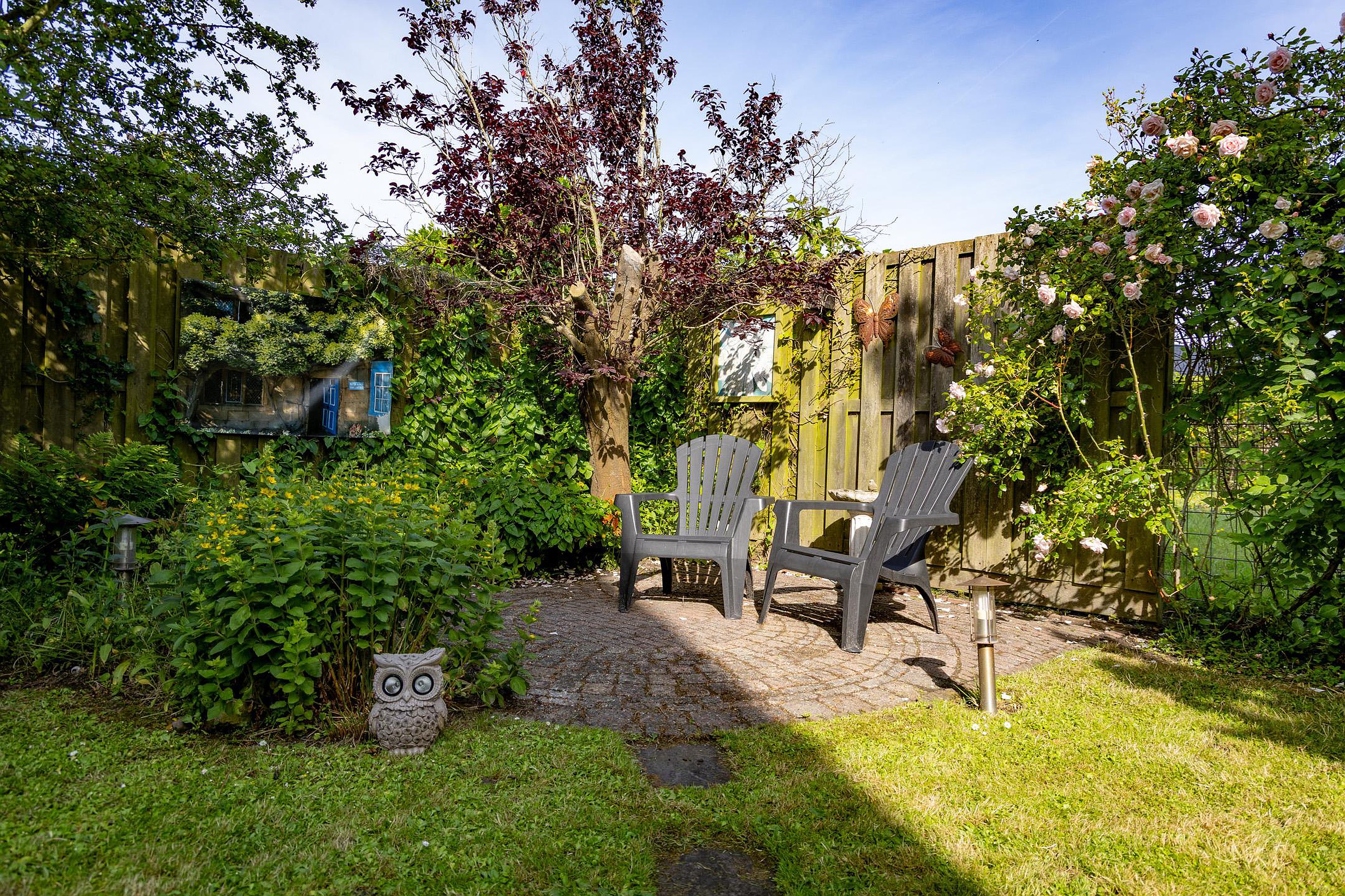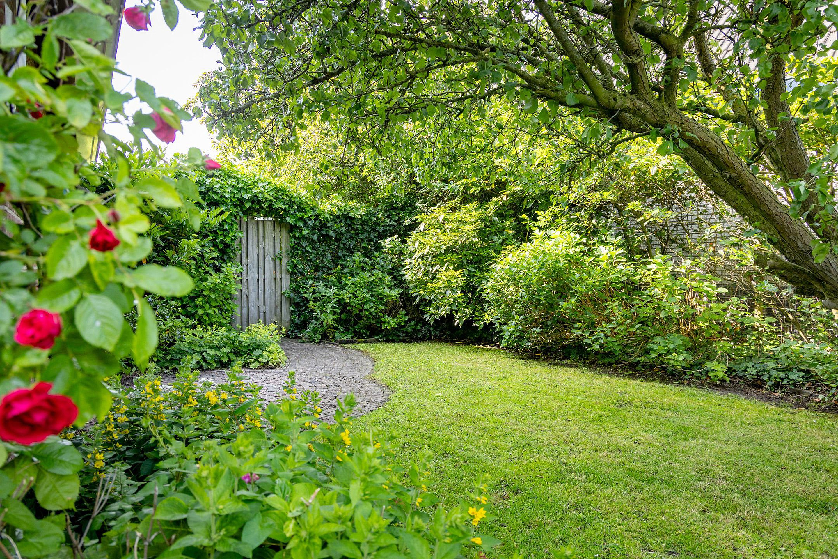 De fraai aangelegde en verassend zonnige tuin is gelegen op het westen en biedt naast veel zonuren ook veel privacy.