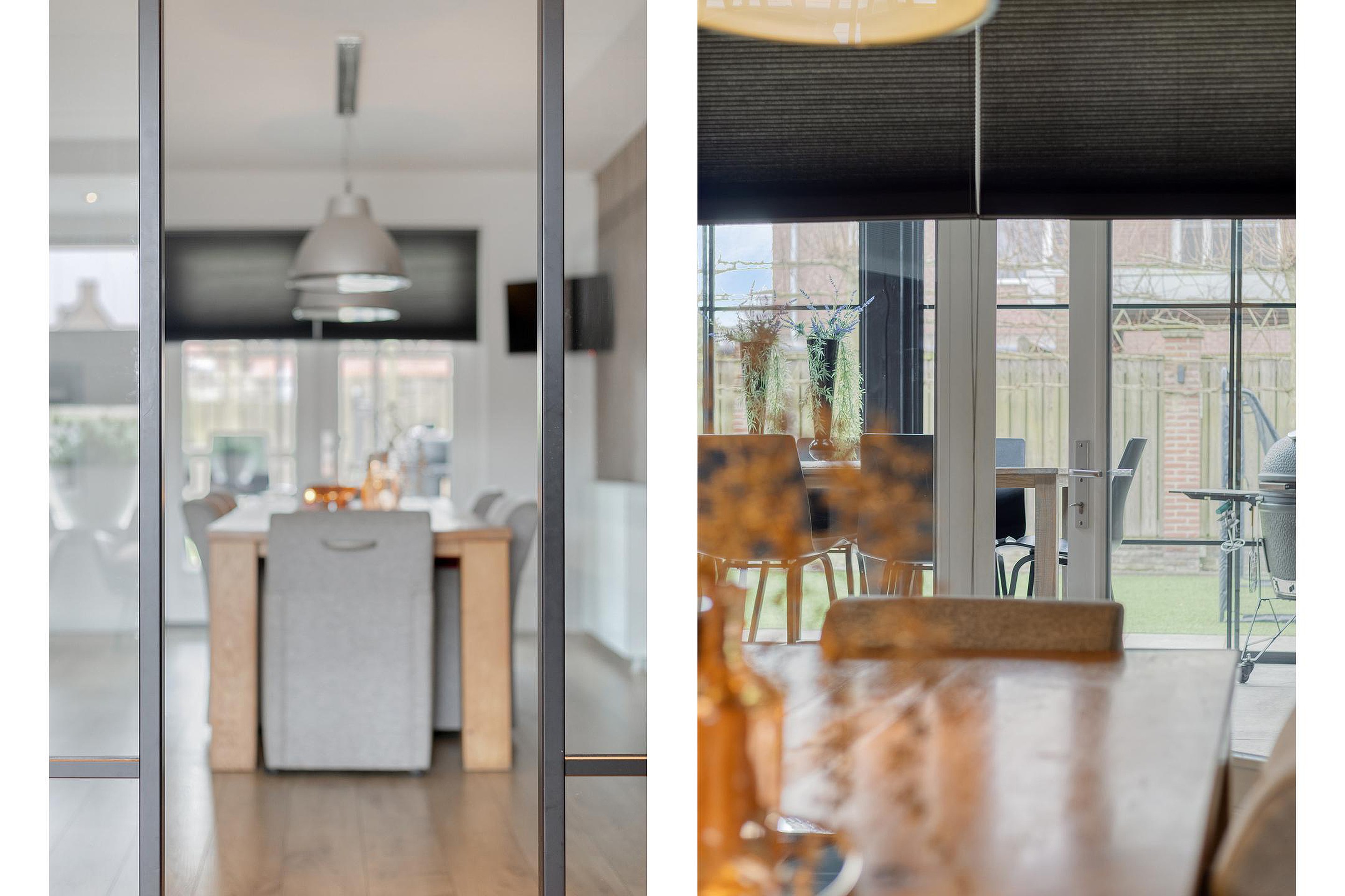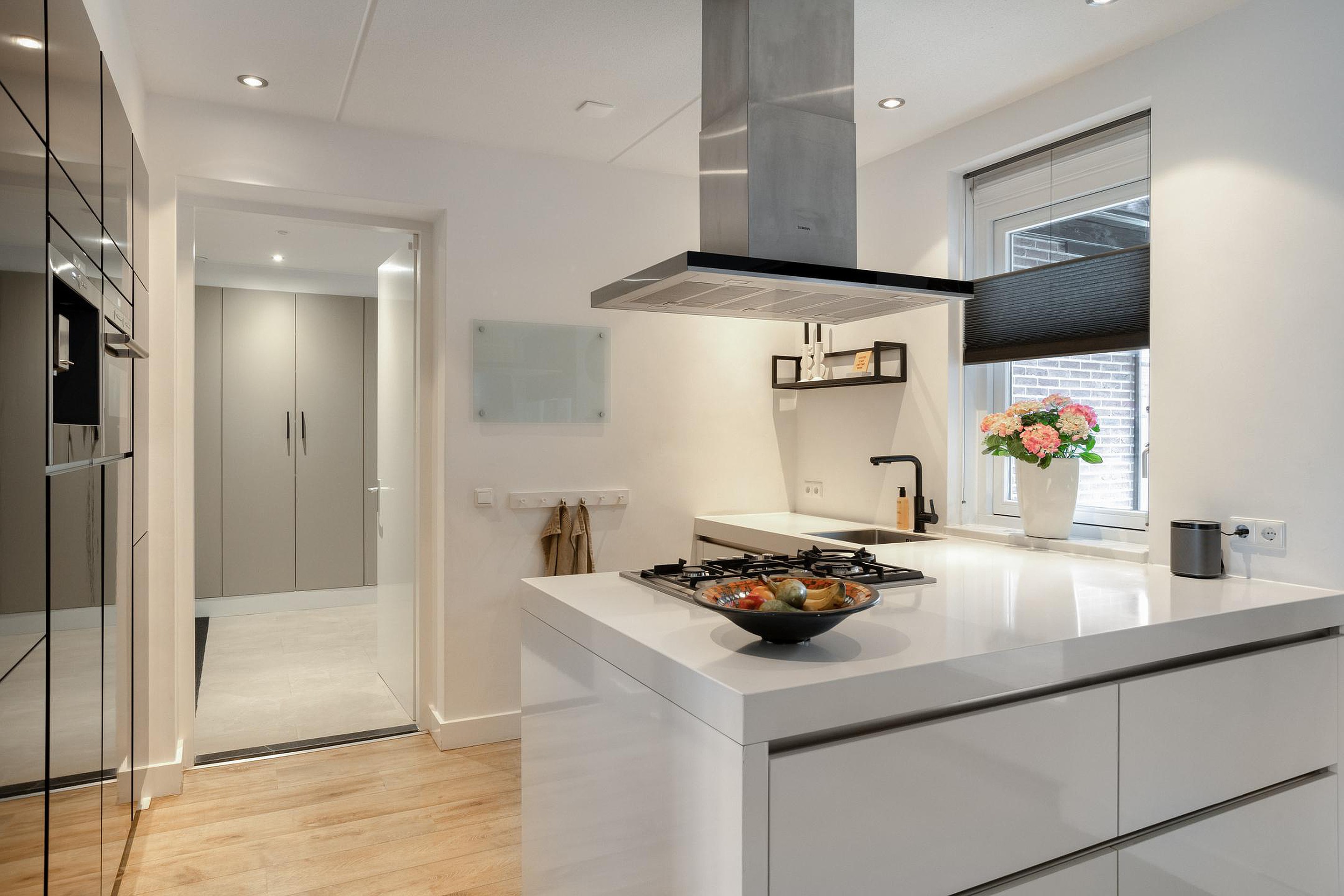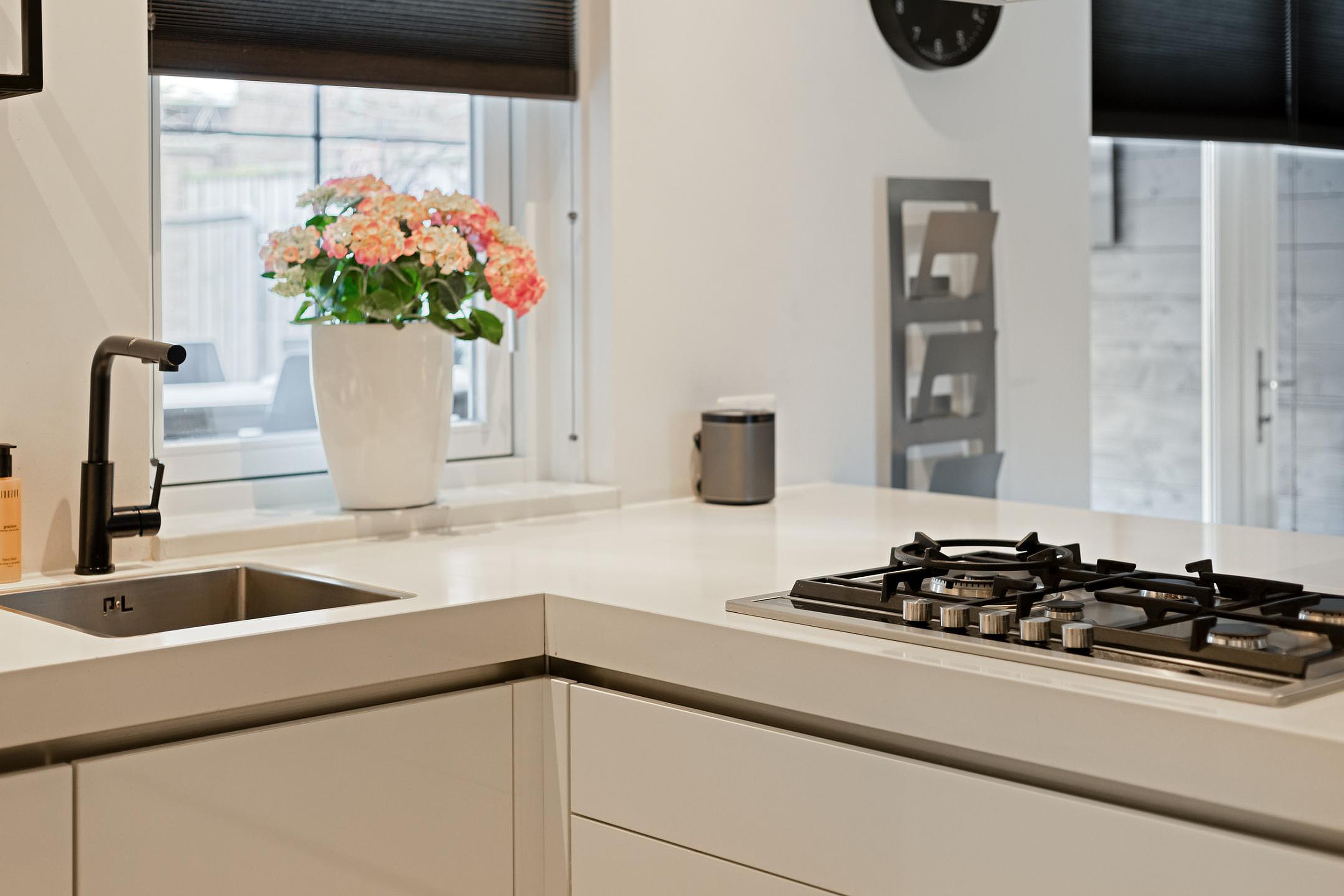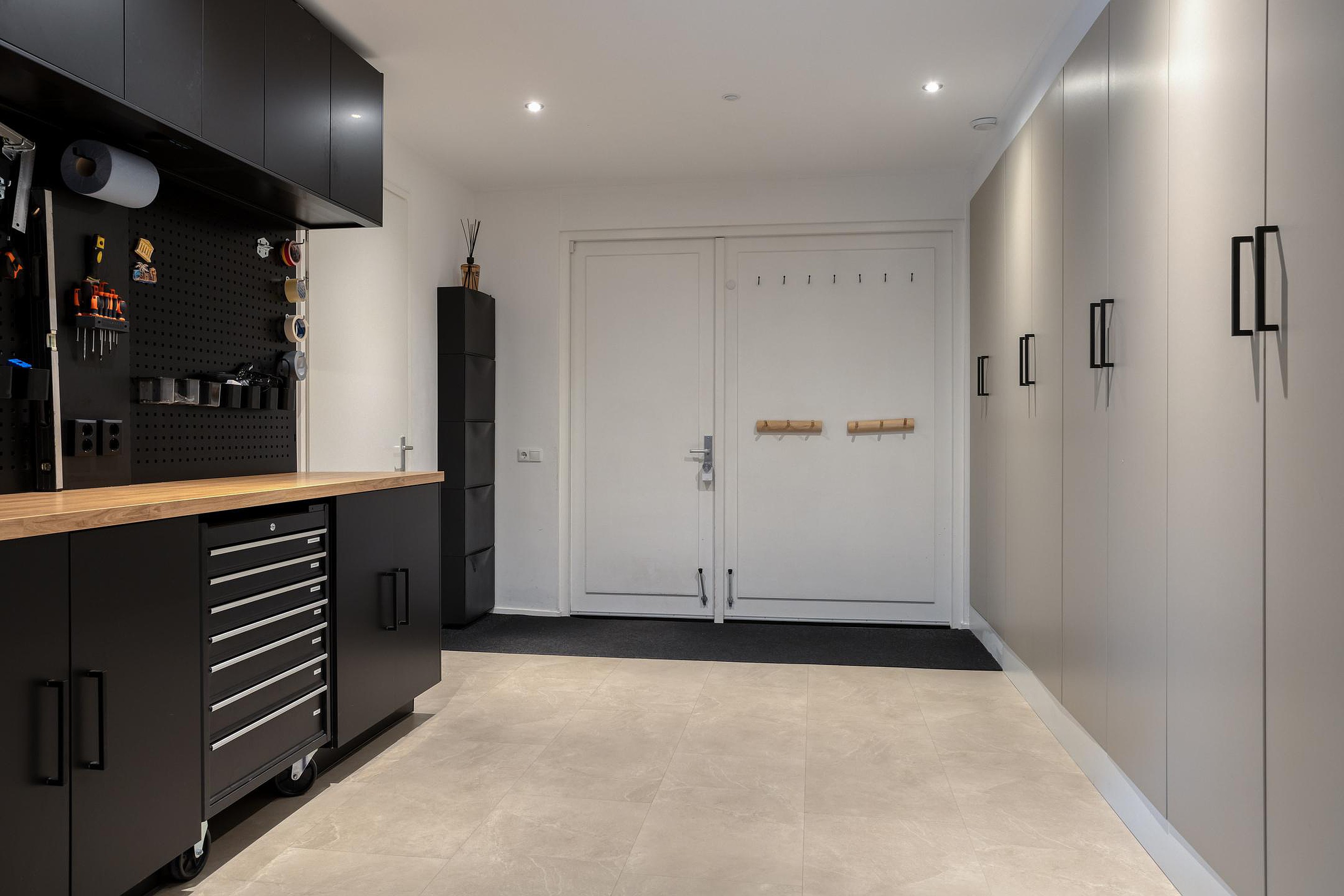 Begane grond Entree/hal met trapopgang naar de verdieping, toilet met fonteintje en de meterkast. De woonkamer is aan de voorzijde gelegen en beschikt over grote raampartijen, fraaie vaste kasten én een sfeervolle ingebouwde elektrische sfeerhaard. Op de gehele vloer vind je een gave en goed onderhouden vloer. De woonkamer en woonkeuken zijn door middel van stijlvolle steellook deuren afgescheiden. De leefkeuken beschikt over voldoende ruimte voor een grote eettafel en voorziet in o.a. een koelkast, vriezer, inbouw koffiezetapparaat, 5 pits gaskookplaat, afzuigkap en een vaatwasser. De luxe afgewerkte garage beschikt evenals de rest van de woning over een zeer hoog afwerkingsniveau met o.a. prachtige vaste kasten en een ingebouwde wijnkoelkast!