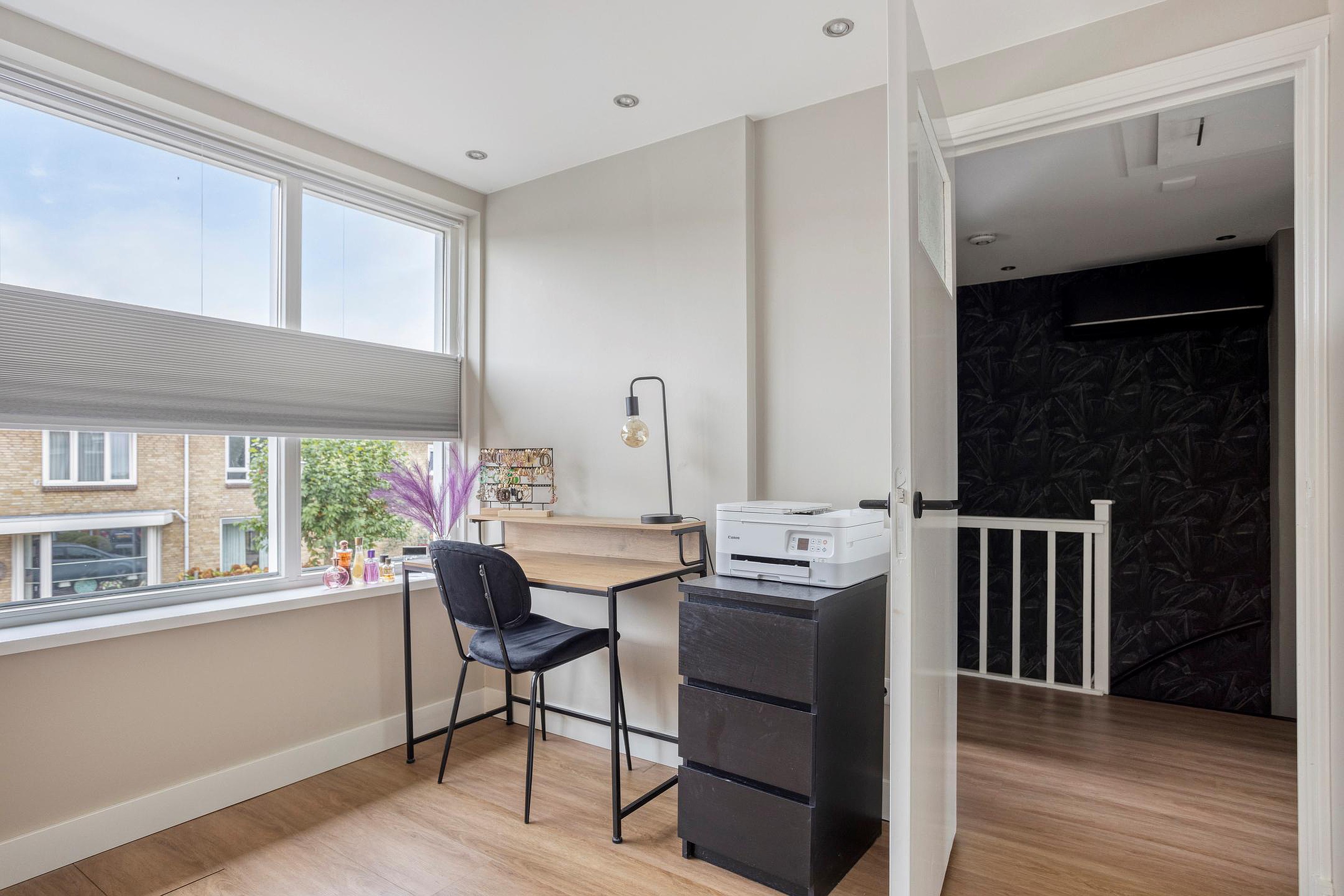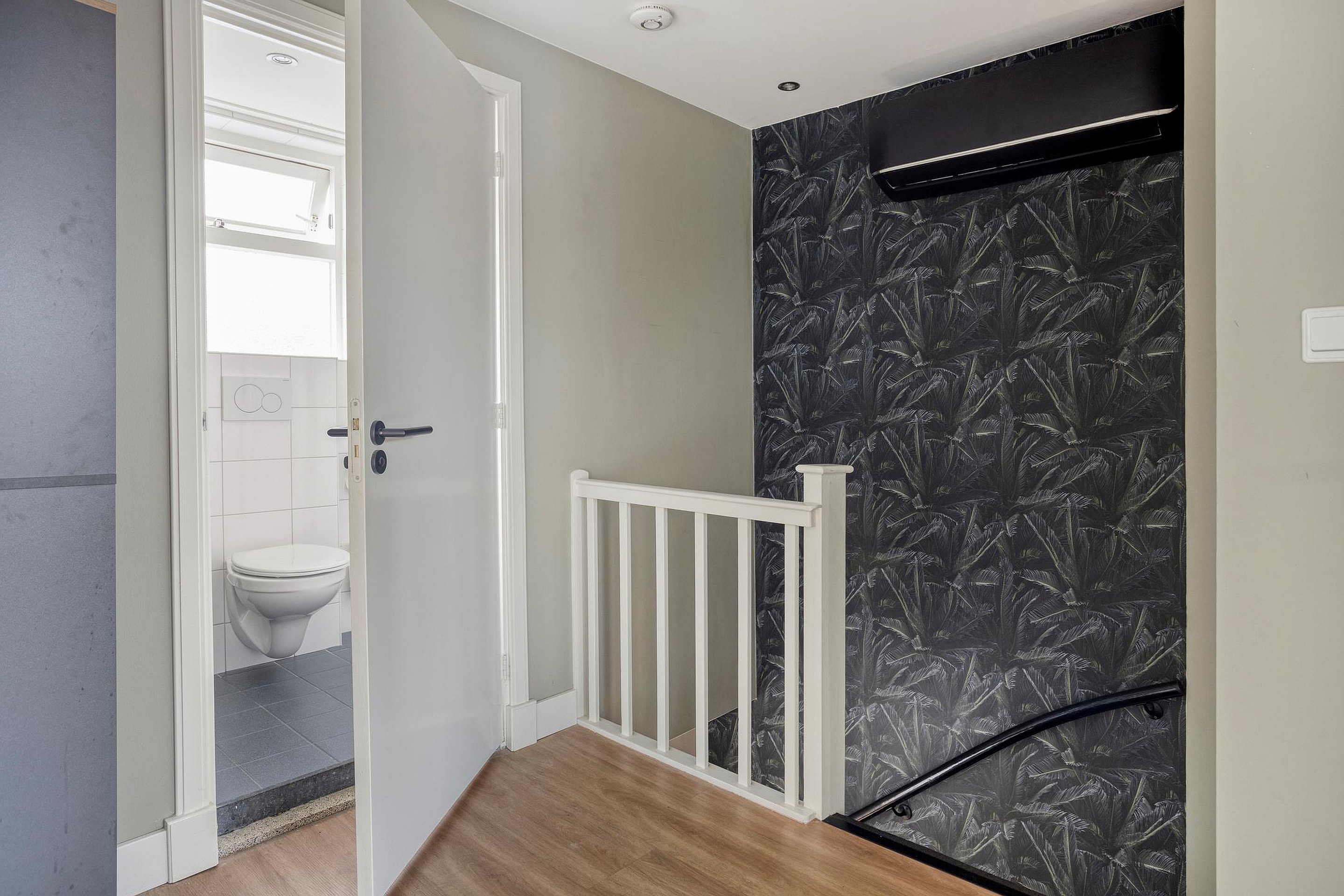 Eerste verdieping Overloop; waar boven de trap een airconditioning is geplaatst, ideaal voor comfort op warme dagen. Vanaf de overloop heb je toegang tot drie ruime slaapkamers en een praktische badkamer. De kamers zijn licht en prettig van formaat, met voldoende ruimte voor kasten en een bureau. Eén van de slaapkamers beschikt bovendien over een eigen balkon.