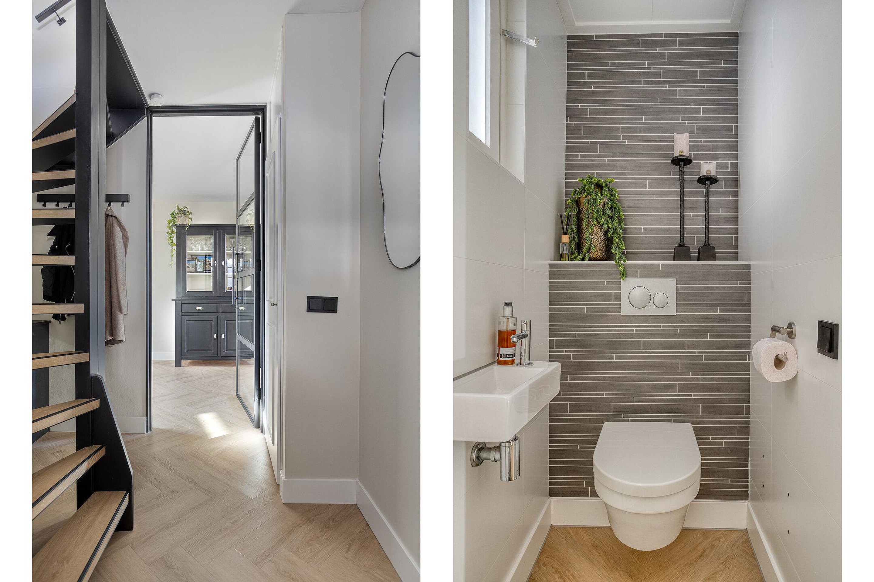 Entree; gave en goed onderhouden PVC visgraat vloer; net vrijdragend toilet met fonteintje; meterkast; toegang tot de woonkamer welke aan de voorzijde is gesitueerd en beschikt over een gaskachel. De eetkamer aan de achterzijde staat direct in verbinding met de moderne leefkeuken welke van alle gemakken én ruimte is voorzien. De keuken beschikt over o.a. een oven, vaatwasser, koelkast, kookplaat én afzuigkap incl. afstandsbediening. Vanuit de keuken is er middels het halletje, waar de Remeha CV ketel (2010, eigendom) en de witgoedaansluitingen bevinden, toegang tot de garage. De garage is ruim van formaat en biedt voldoende opbergruimte.