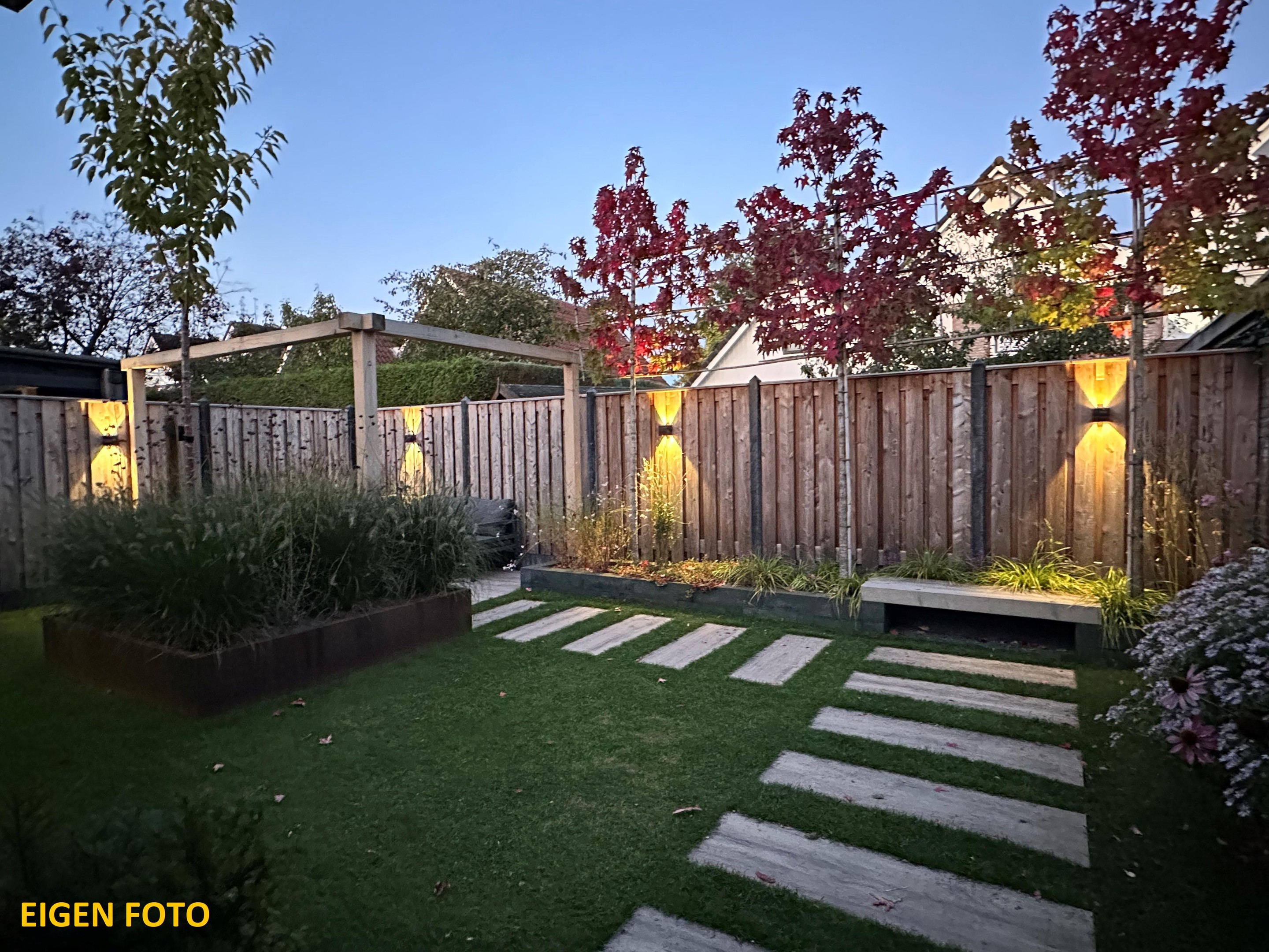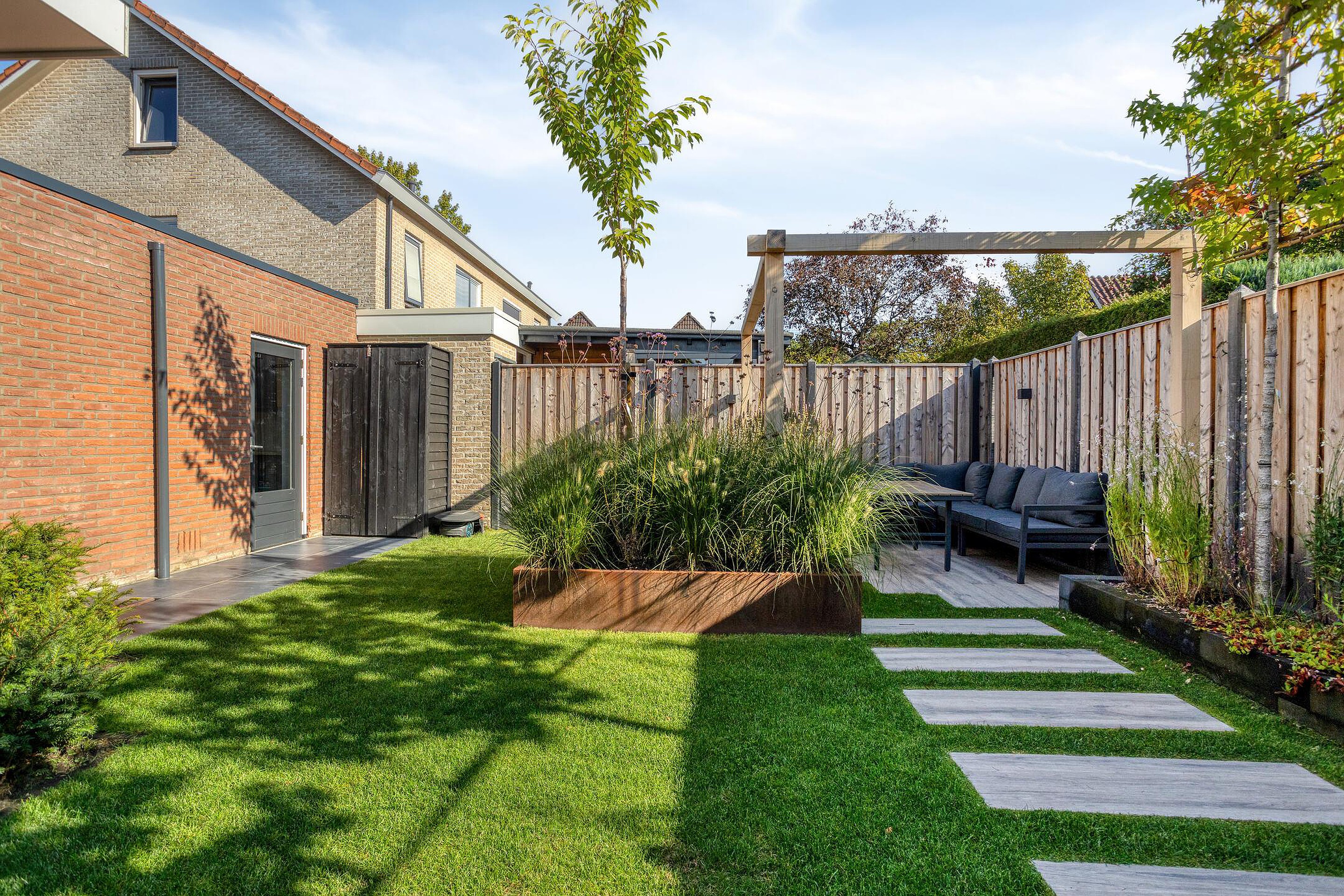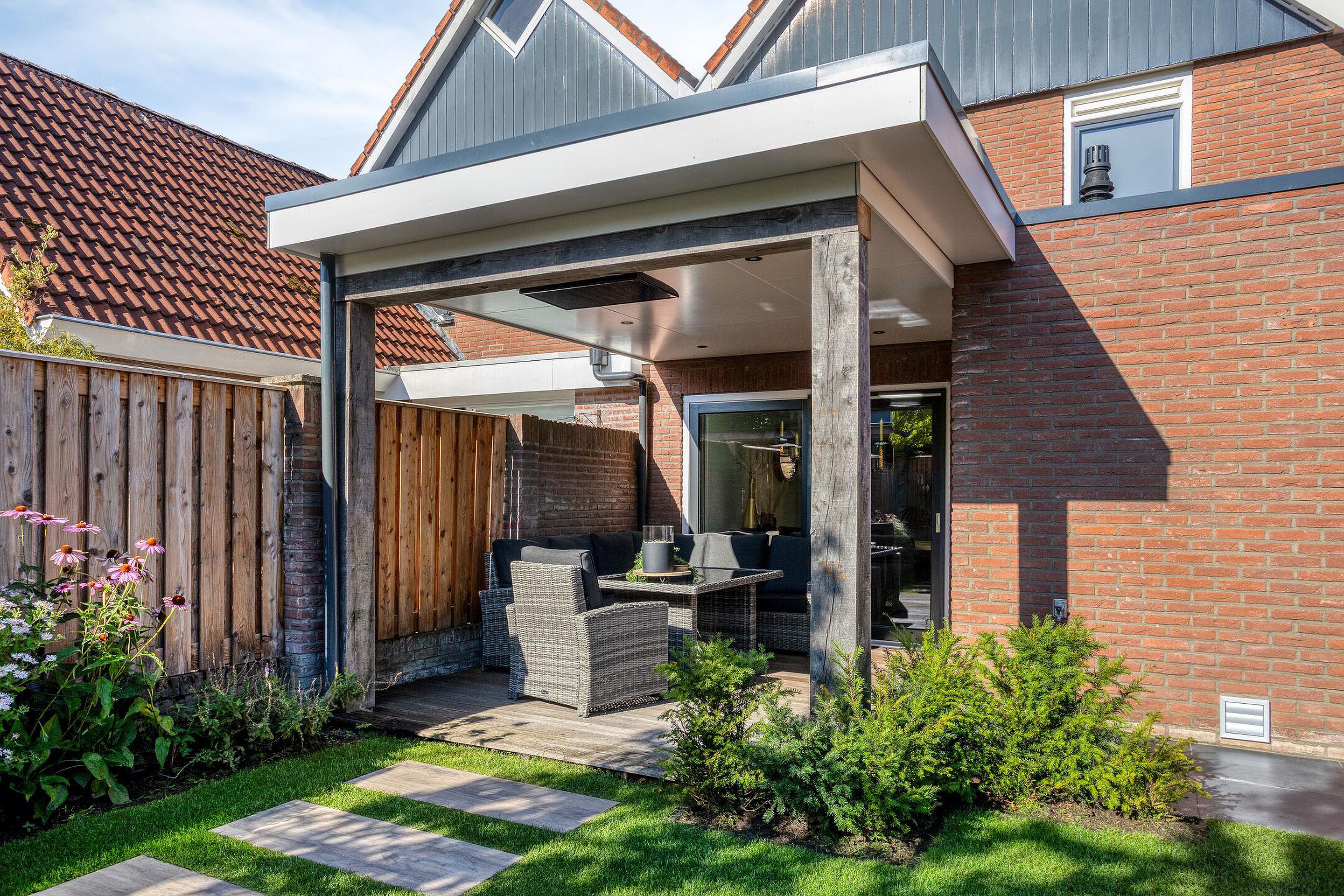 De fraaie achtertuin is in 2024 volledig aangepakt en beschikt over een sfeervolle overkapping welke toegankelijk is via de glazen schuifpui in de eetkamer. Ook is er een verhard terras achterin de tuin waar je heerlijk kunt genieten van het buitenzijn. Daarnaast is er een handige houten berging en is er rechtstreeks toegang tot de garage, van waaruit de oprit + carport weer te bereiken is.