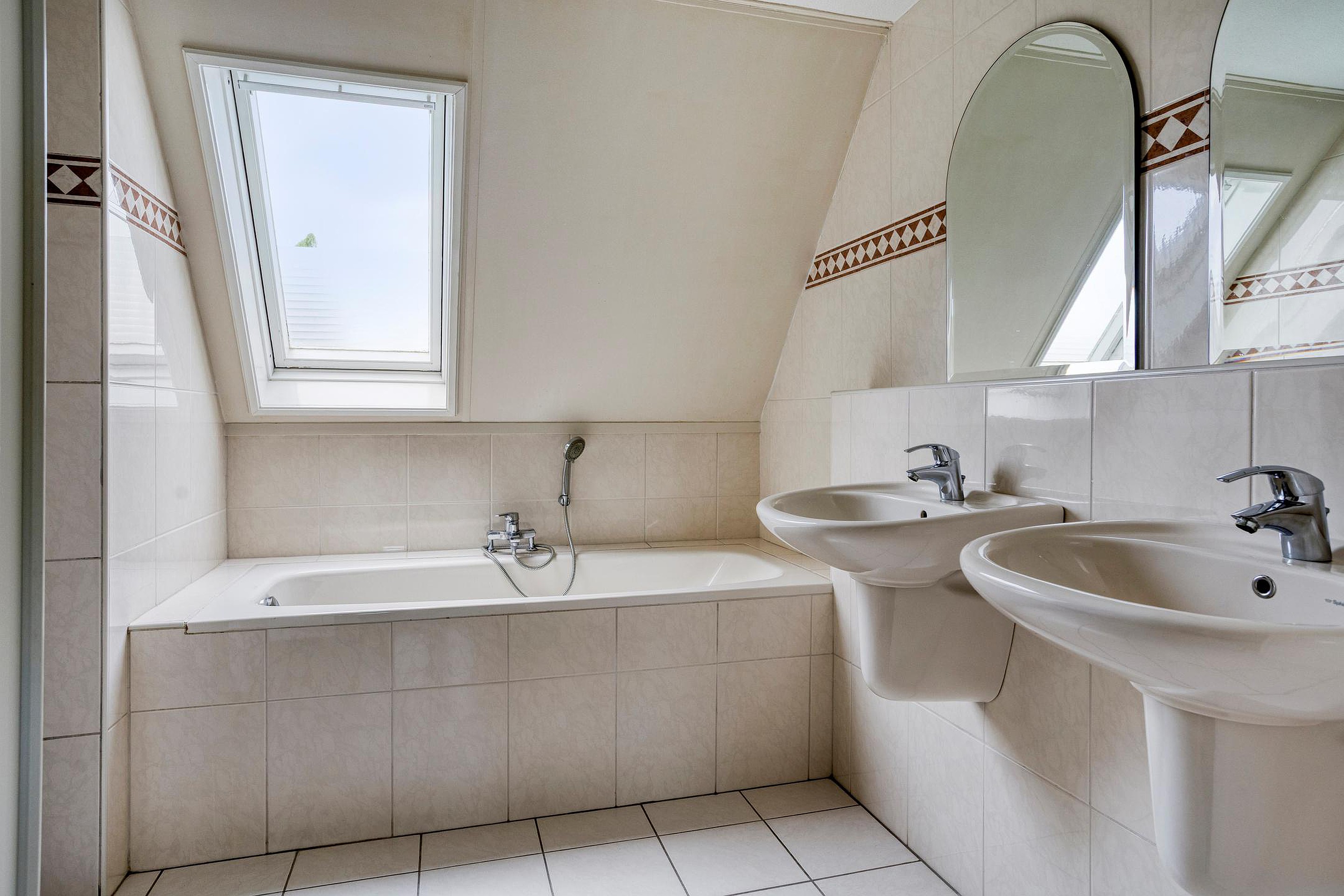 De overloop met vide biedt toegang tot drie slaapkamers. De master bedroom is voorzien van airconditioning én een royaal inpandig balkon met vrij uitzicht over de achtertuin. Daarnaast bevindt zich op de verdieping een ruime badkamer met dubbele wastafel, inloopdouche en een ligbad. Het toilet mét fonteintje is separaat op de verdieping.