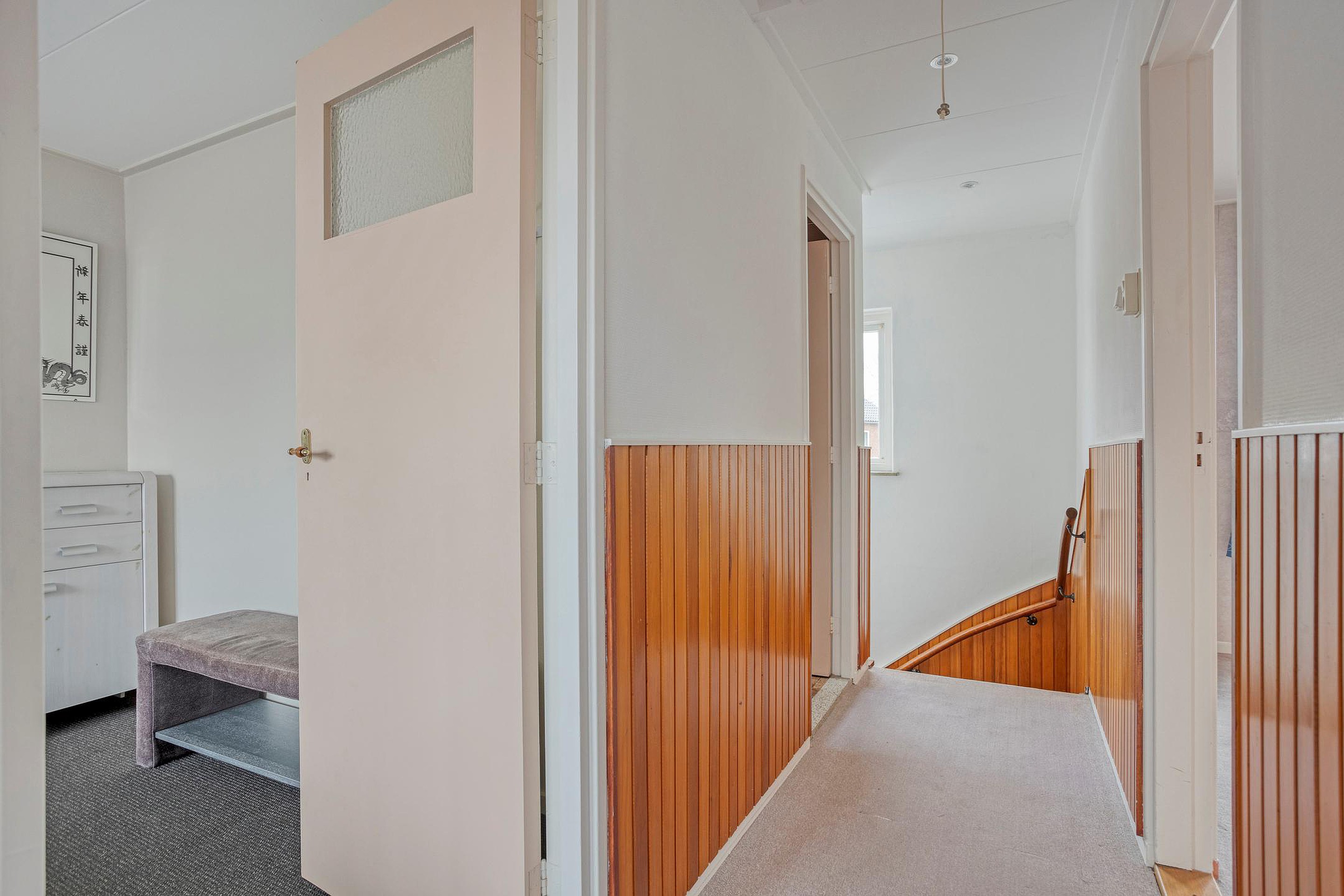 Overloop; drie slaapkamers waarvan twee met vaste kasten. De badkamer is o.a. uitgerust met een toilet, douche, wastafel en ligbad.