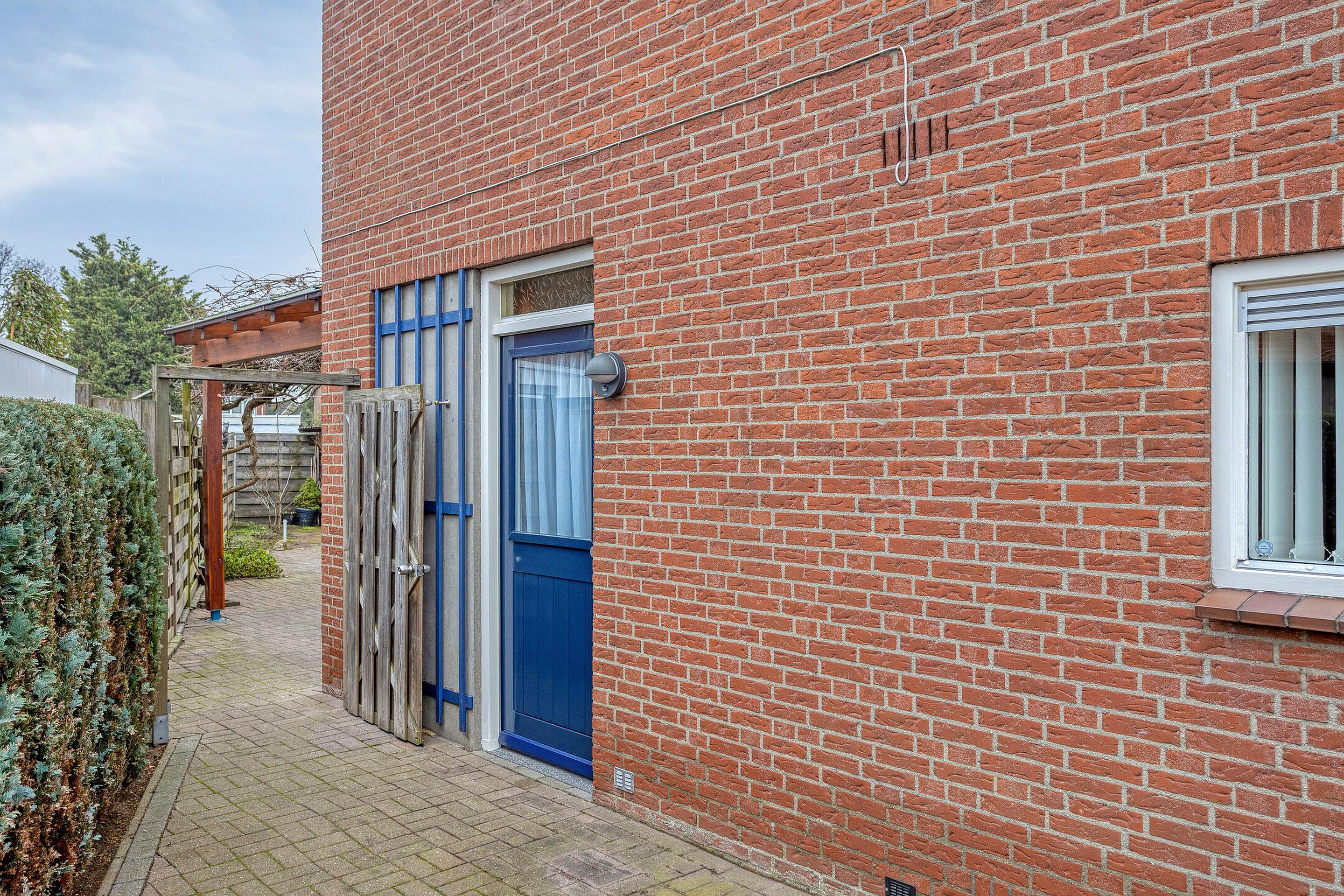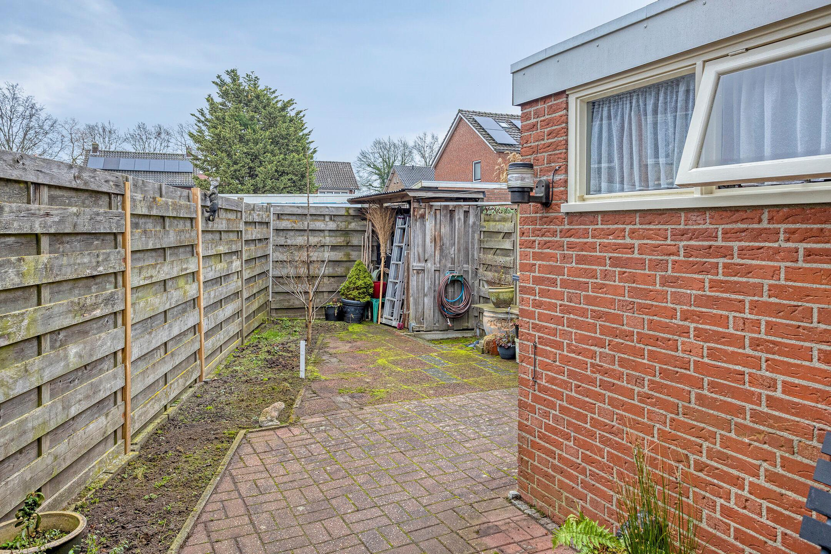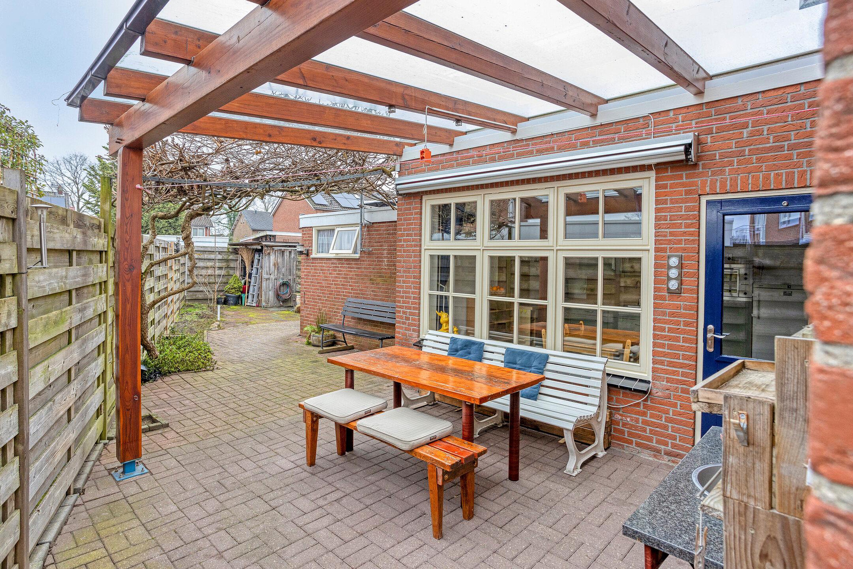 Vanuit de keuken als ook per achterom via de oprit is de tuin te bereiken. De tuin is gelegen op het oosten en biedt volop privacy mede door de hoekligging. De overkapping grenst aan de keuken en is een heerlijke plek om te genieten van het buiten zijn! De aangebouwde stenen berging is ideaal voor het stallen van de fietsen en het opbergen van diversen.