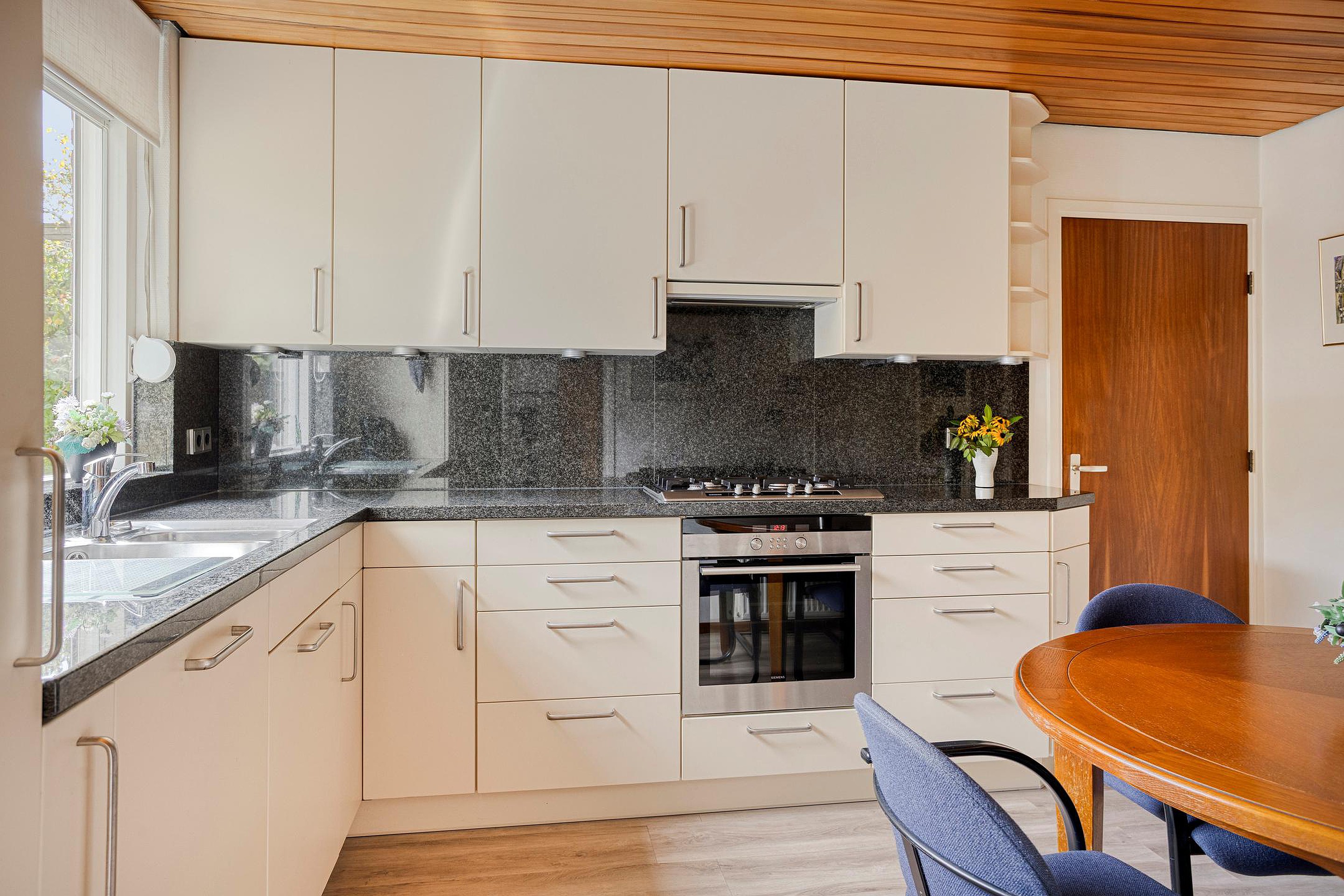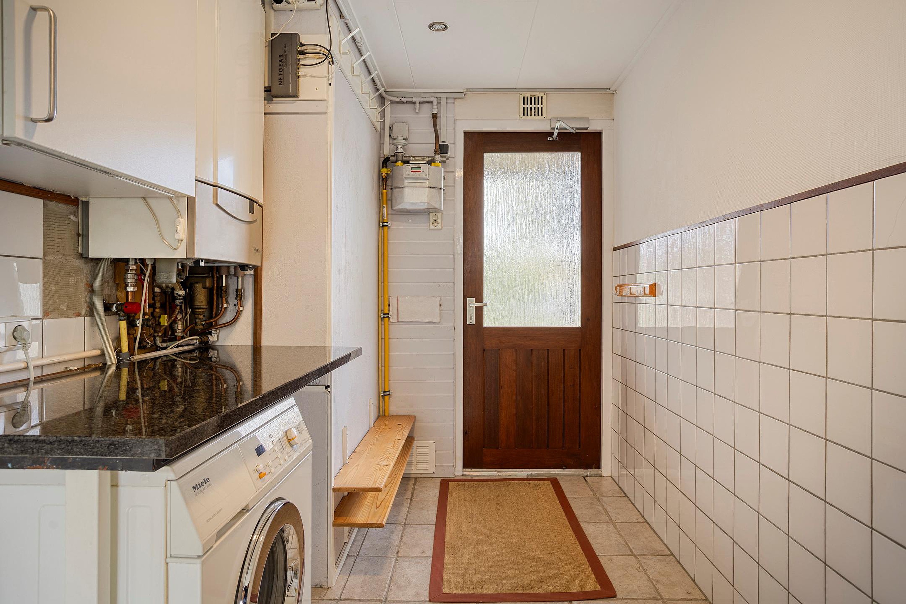 Entree; toilet met fonteintje; meterkast; trapopgang naar de verdieping, toegang tot de woonkamer én keuken. De aan de voorzijde gelegen woonkamer is licht en sfeervol, mede door de openhaard en grote raampartijen aan de voor- en achterzijde. Door het royale formaat is er ruimte voor zowel de zit- als eethoek en via de glazen schuifpui heb je direct toegang tot de achtertuin. De keuken is praktisch ingericht en beschikt over o.a. een koelkast, vaatwasser, gas kookplaat met afzuigkap en een elektrische oven. Grenzend aan de keuken bevindt zich de bijkeuken welke is v.v. van een natuurstenen werkblad, de Remeha CV ketel (2005, eigendom) en toegang biedt tot de ruime kelder welke ideaal is als opbergruimte of zelfs als werkplek.