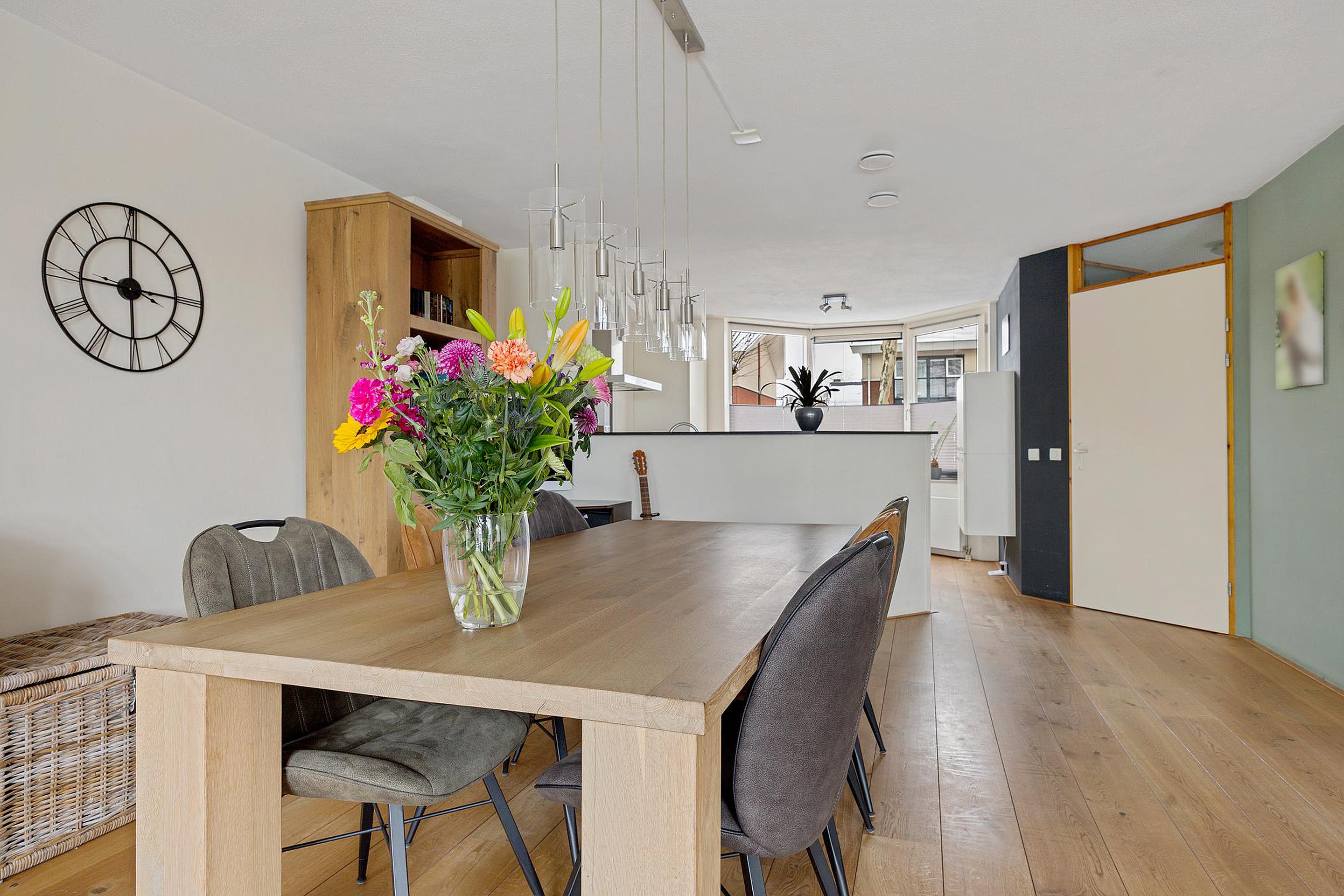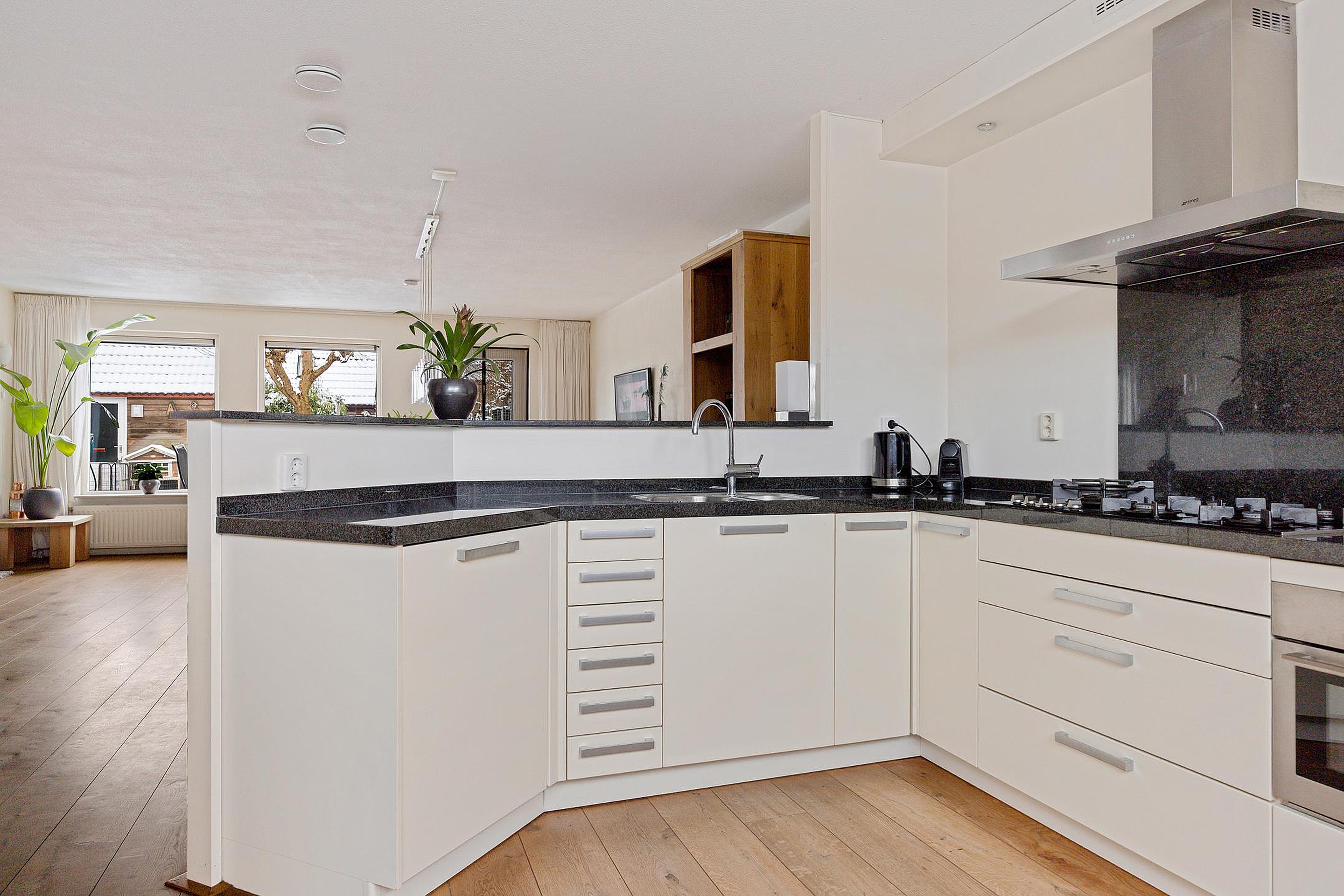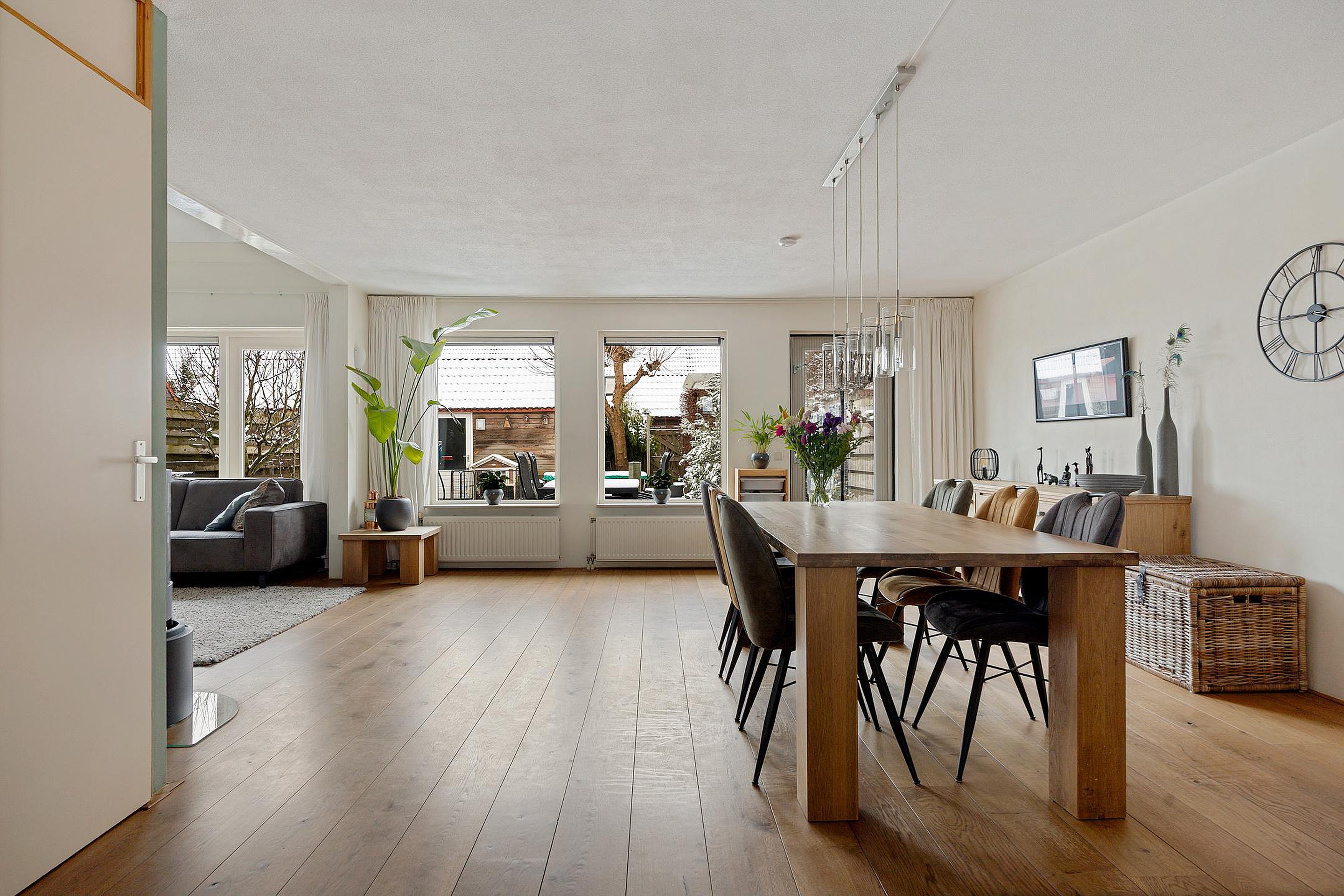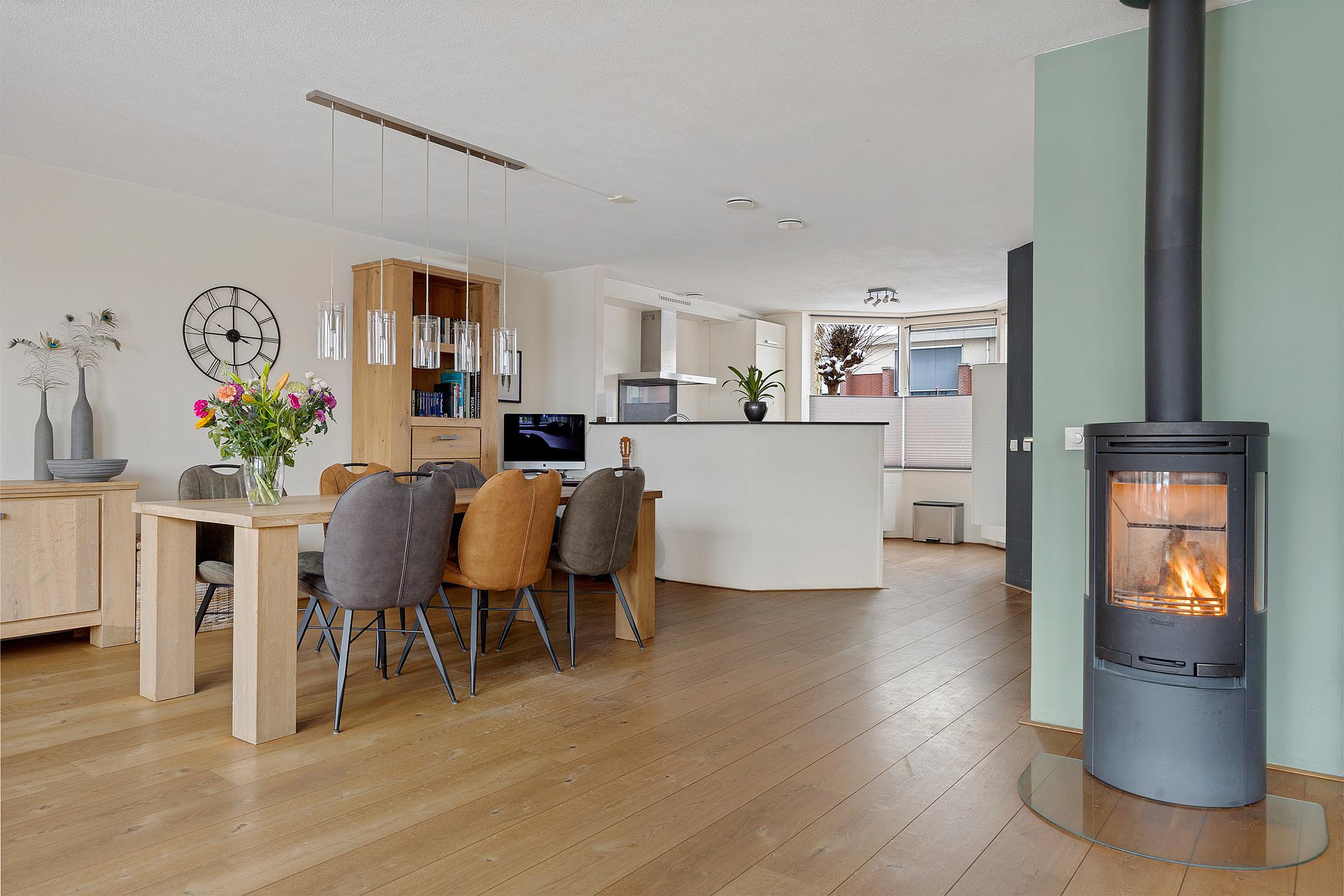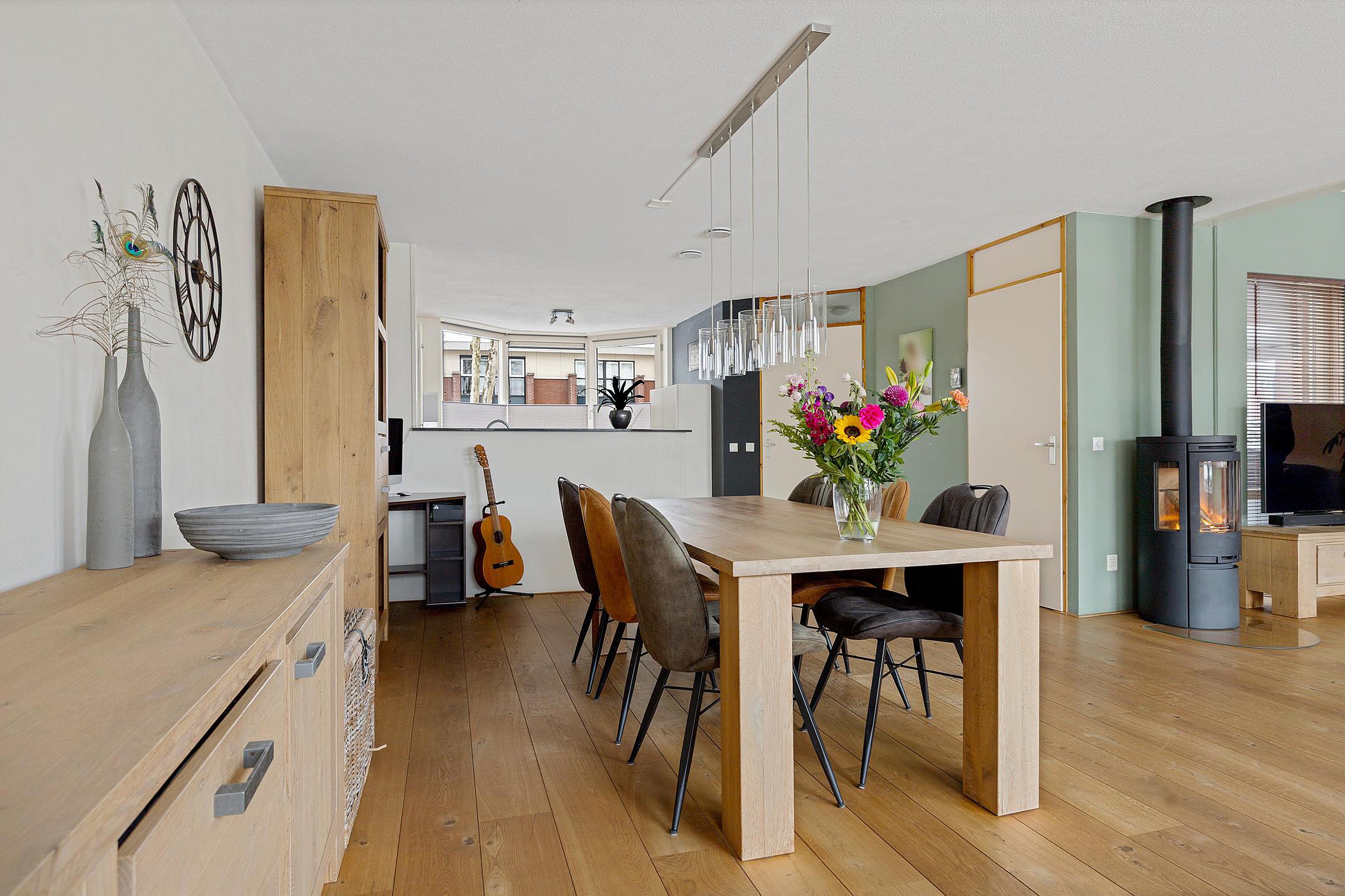 Via de hal met toilet en trapopgang betreedt u de woning. Vanuit hier bereikt u de lichte open keuken, voorzien van diverse inbouwapparatuur zoals een koel-vriescombinatie, oven en vaatwasser. De keuken loopt naadloos over in de royale eetkamer en woonkamer. Dankzij de grote raampartijen en het hoge plafond in de woonkamer voelt deze leefruimte extra ruimtelijk en licht aan. Over de gehele begane grond ligt een fraaie eikenhouten vloer.