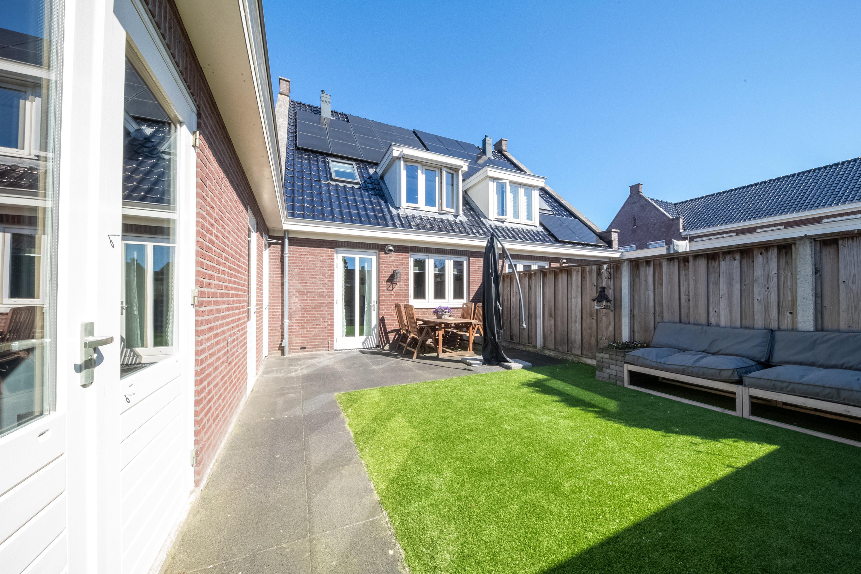 Tuin Aan de achterzijde van de woning ligt een zonnige tuin op het zuiden. De tuin is via een achterom toegankelijk en onderhoudsarm aangelegd met bestrating en kunstgras, waardoor deze weinig onderhoud vraagt.