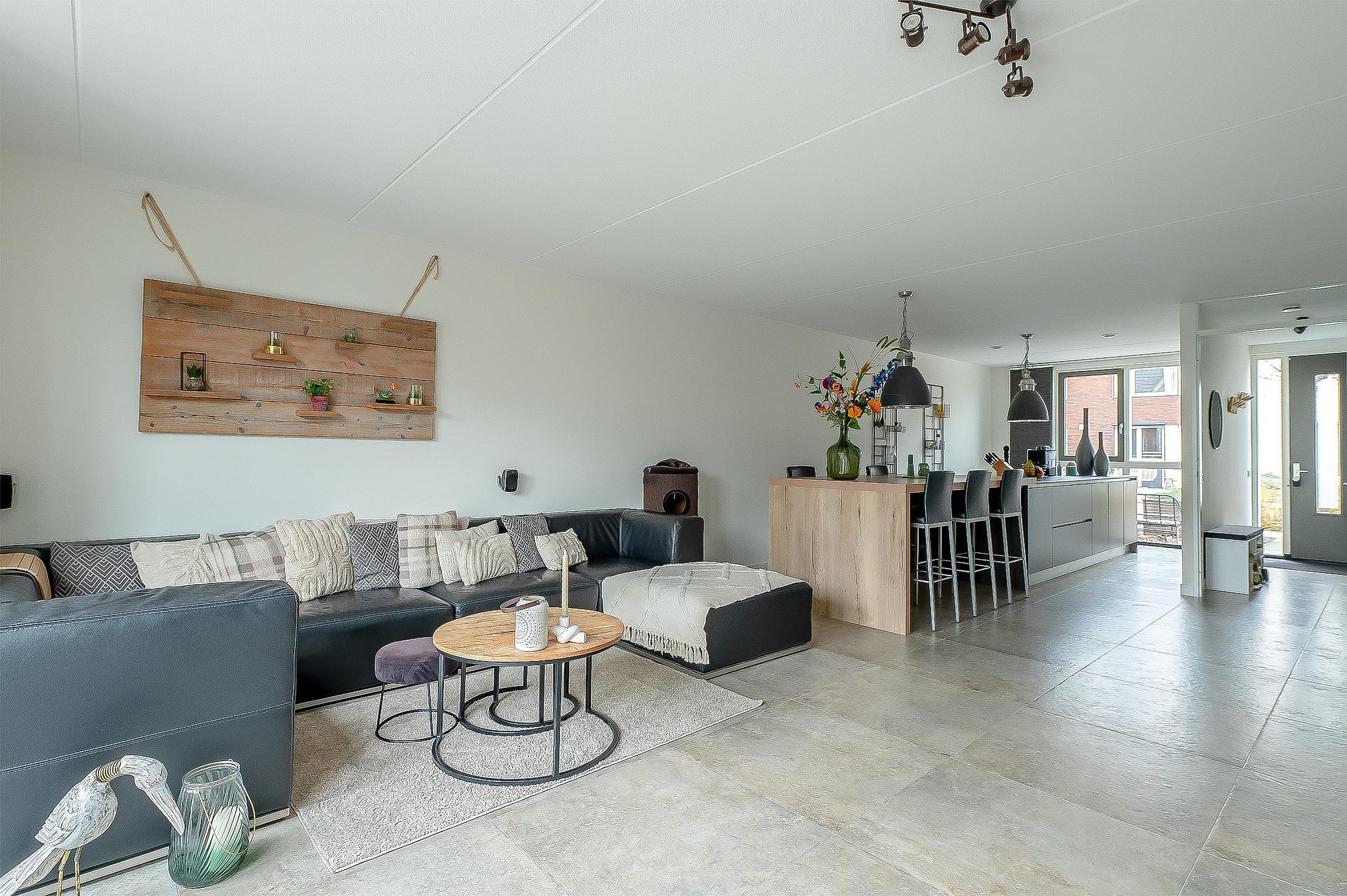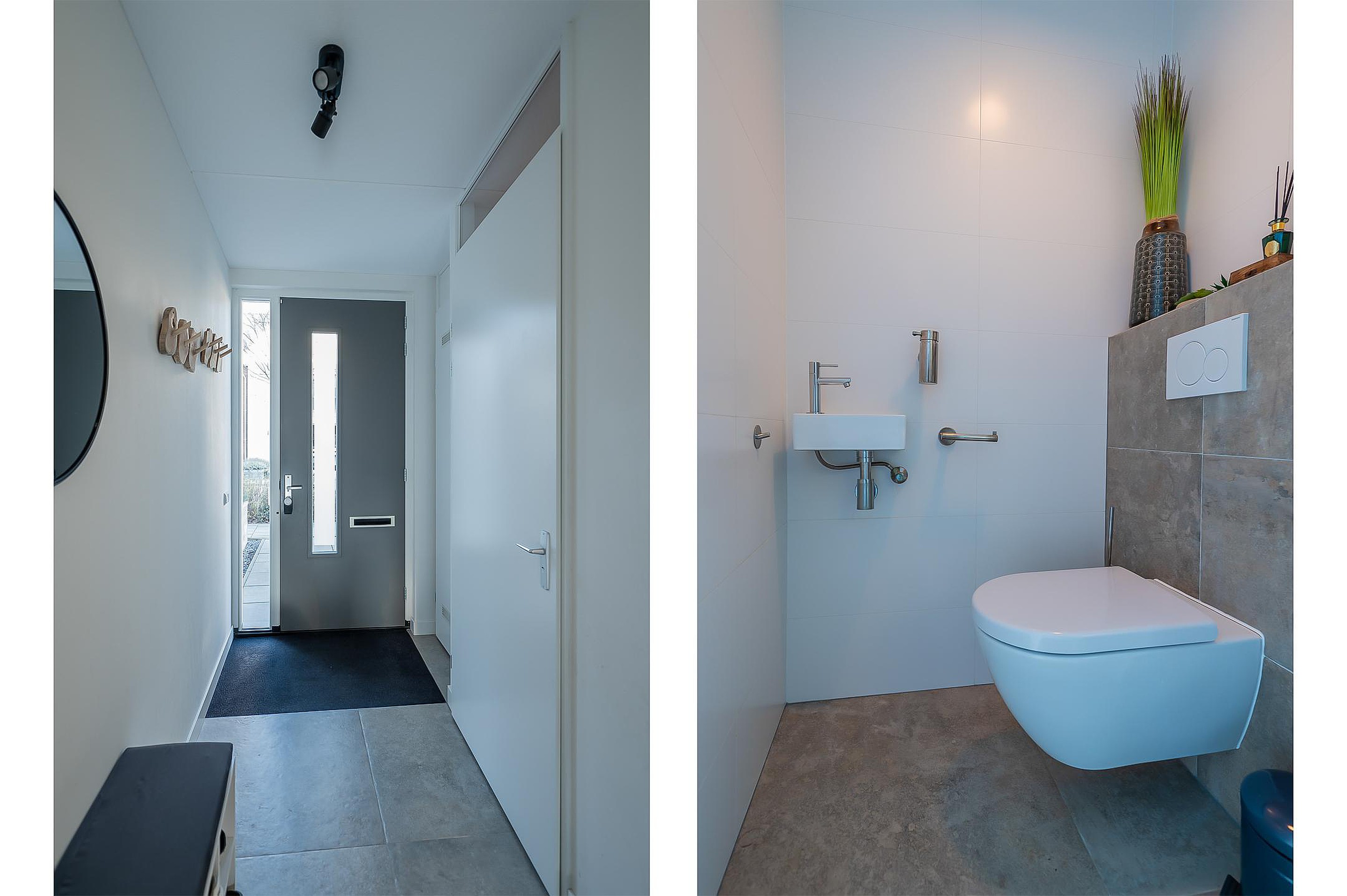 De entree aan de voorzijde leidt naar de hal met meterkast en een fraai afgewerkt toilet. Vanuit de hal betreedt u direct de woonkamer. Vrijwel de gehele begane grond is voorzien van comfortabele vloerverwarming. De stijlvolle plavuizen vloer in combinatie met warme kleuraccenten zorgt voor een sfeervolle uitstraling waarin u zich direct thuis voelt. Hier is alle ruimte om een gezellige zithoek te creëren waar u heerlijk kunt ontspannen en tot rust kunt komen.