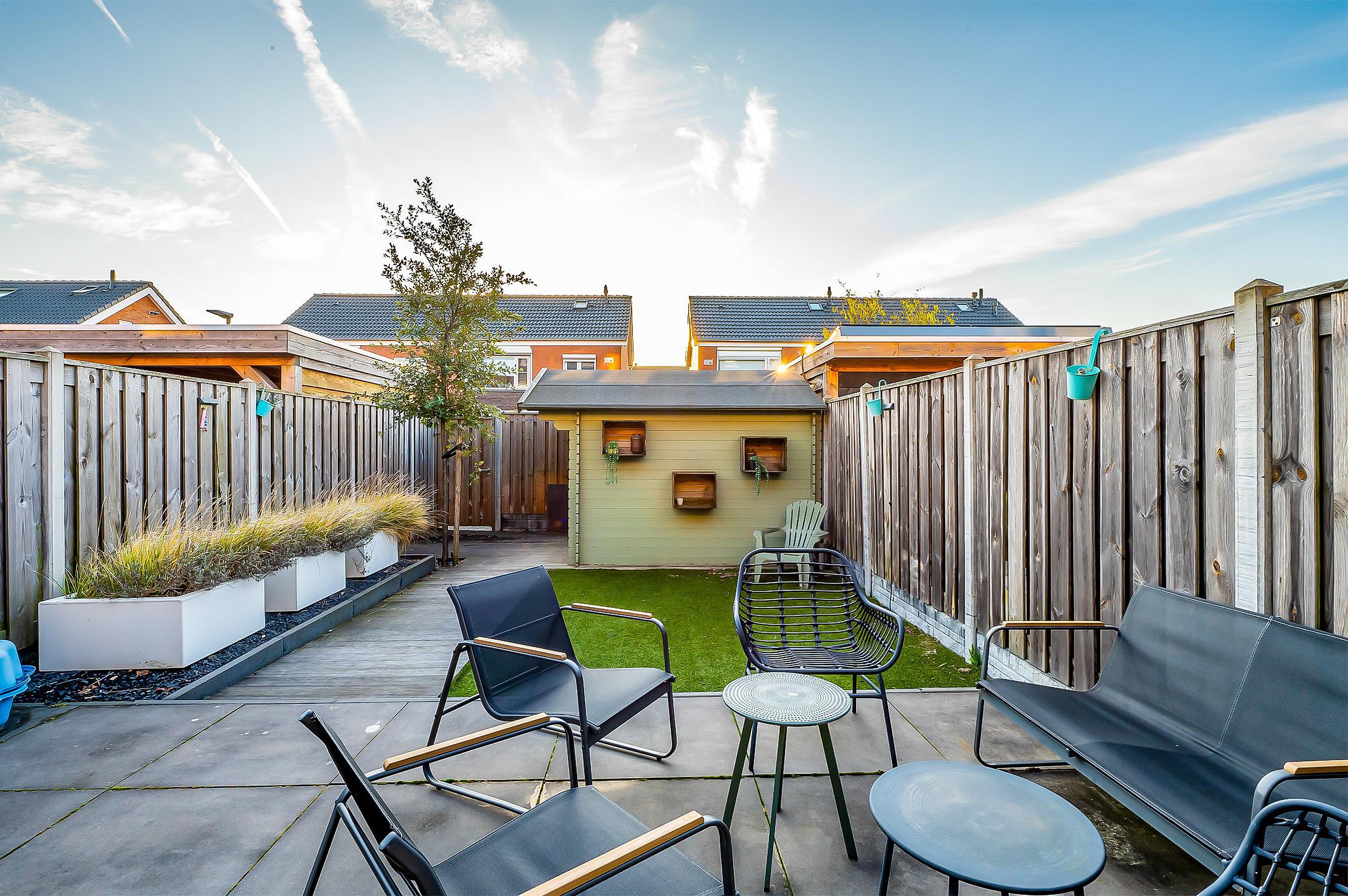 Via de openslaande tuindeuren kom je terecht in de achtertuin met berging. Een ideale plek dus voor zowel het opslaan van spullen als het stallen van de fietsen.