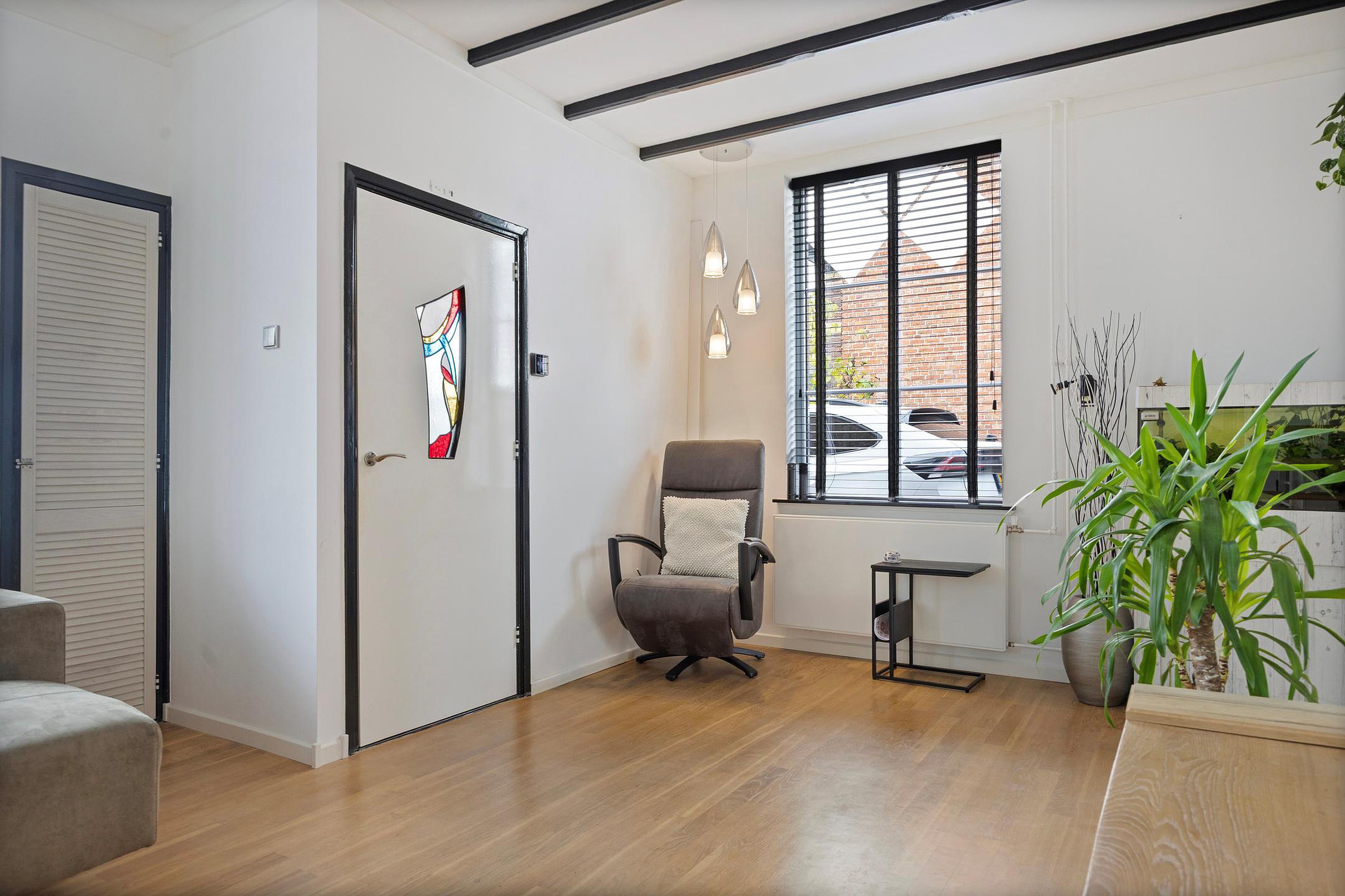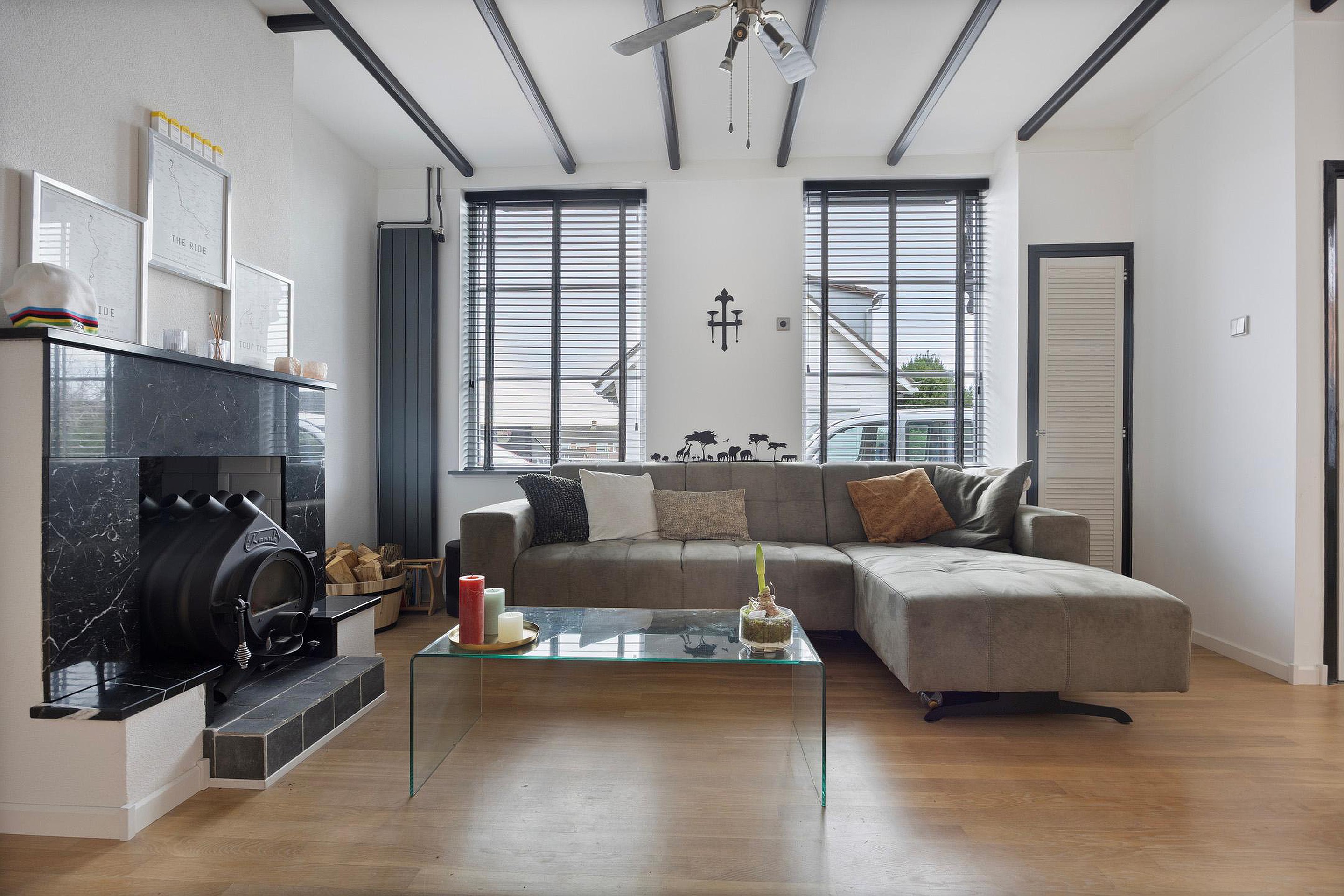 We stappen het huis binnen via de voordeur in een hal met ruimte voor de garderobe. Vanuit de hal, komen we in de woonkamer, waar de eikenhouten vloer meteen voor warmte en sfeer zorgt.