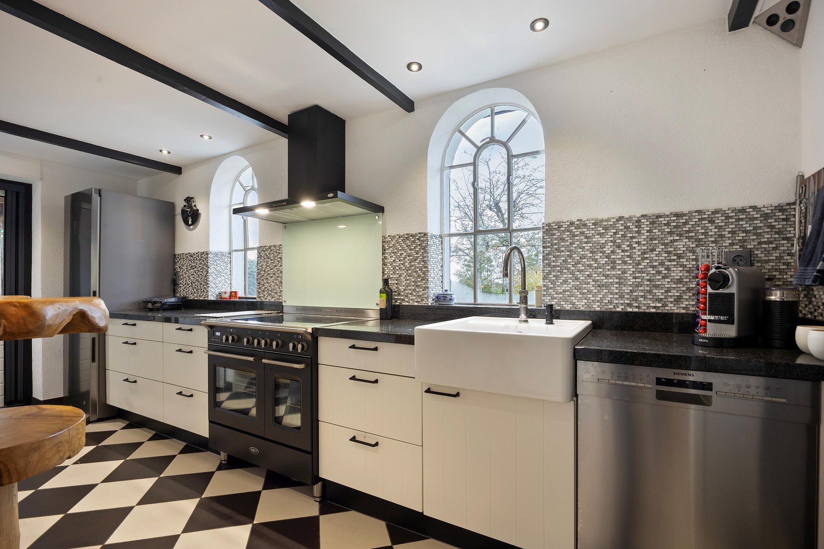 Vier treden lager is de keuken. De rechte keukenopstelling onder het raam biedt een mooi, weids uitzicht over de achtergelegen landerijen. De ruimte is uitgerust met een Boretti fornuis met grote en kleine oven, inductiekookplaat, bijpassende afzuigkap en een Quooker-kraan.