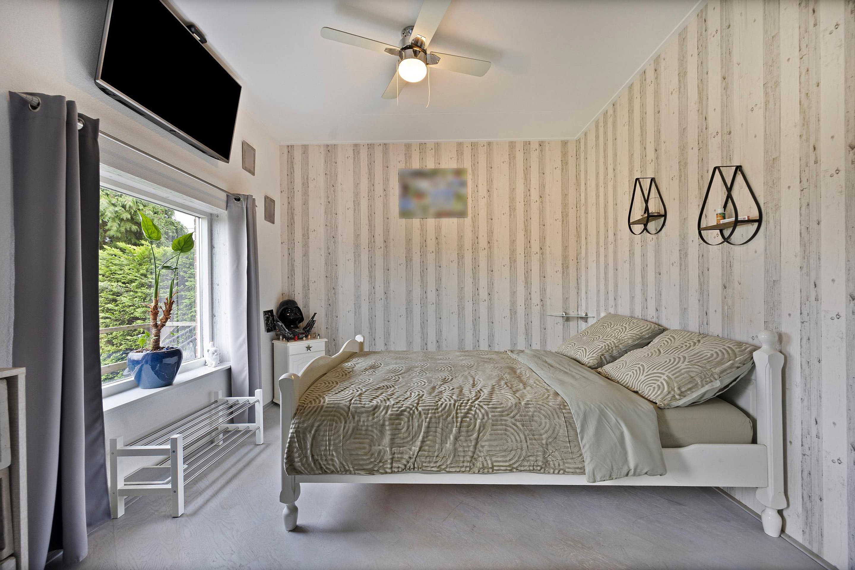 De slaapkamer biedt mooi uitzicht op de tuin — een heerlijke plek om wakker te worden en de dag te beginnen. Aan de kamer grenst een balkonnetje, dus als je wilt, kan je je dag lekker opstarten in de frisse buitenlucht.