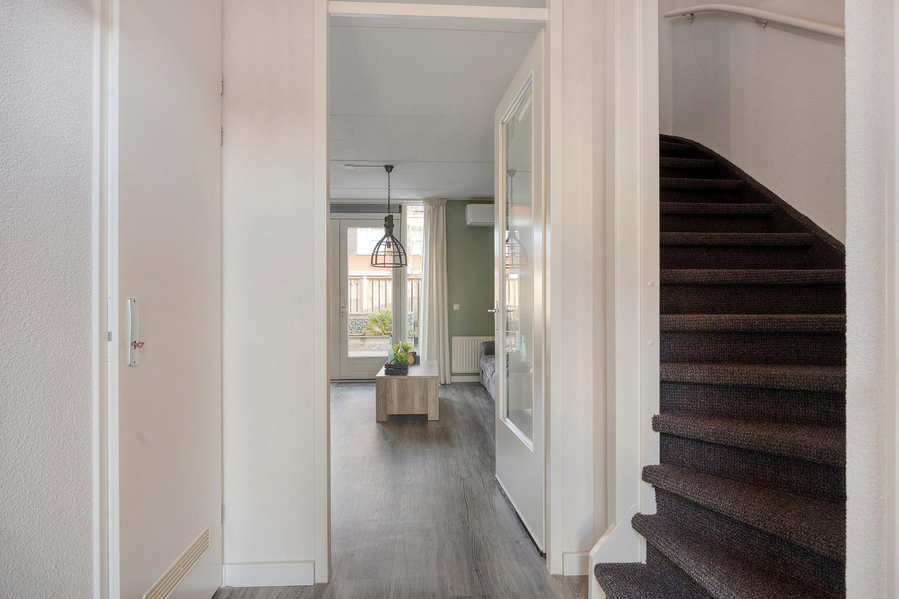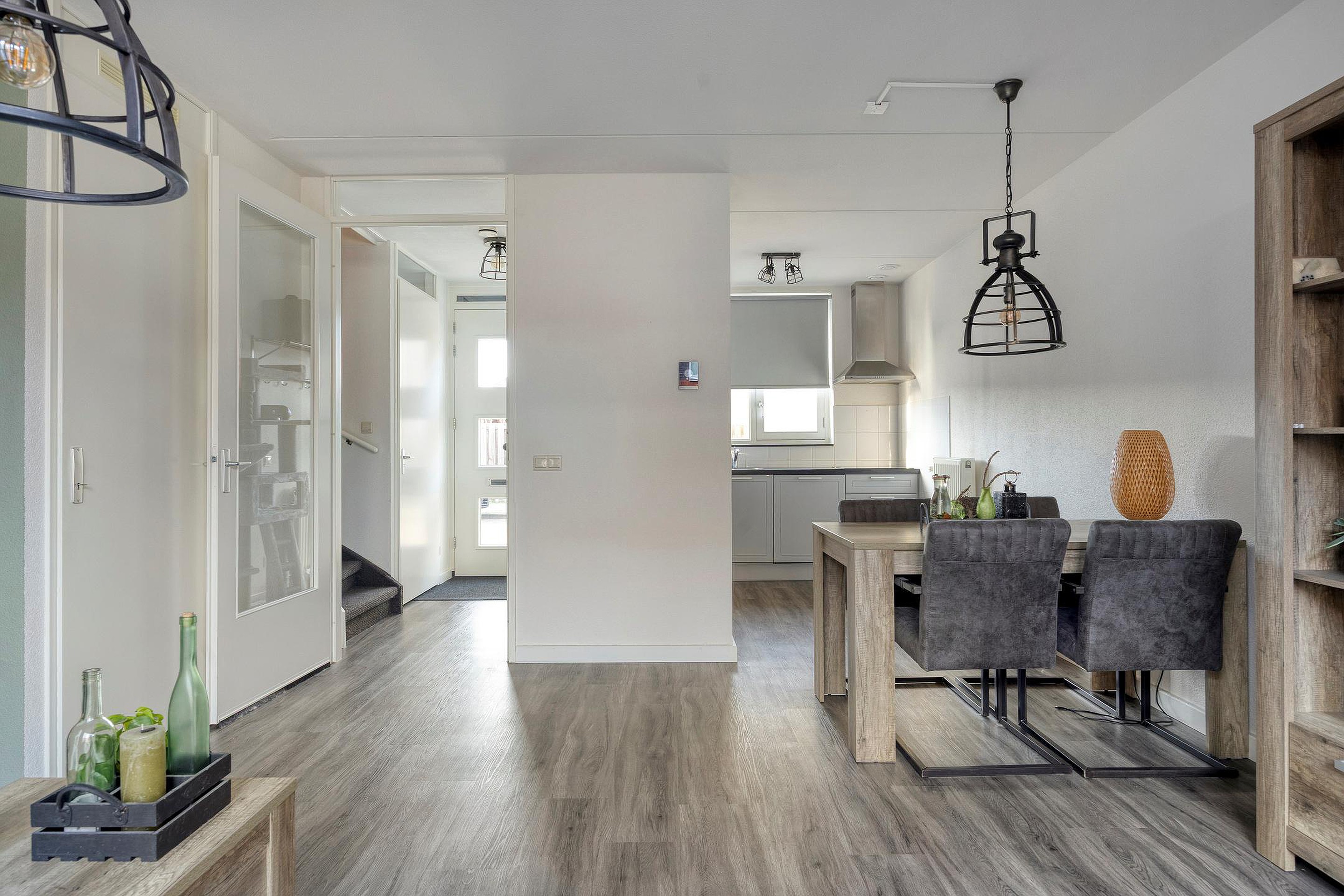 De woonkamer is aan de achterzijde van het huis en staat in direct contact met de tuin. Een fijne, lichte plek waar je na een lange dag lekker kunt neerploffen op de bank of vrienden ontvangt voor een gezellige avond. De grote praktische trapkast in de kamer geeft lekker veel bergruimte voor bijvoorbeeld jouw voorraad of een stofzuiger of strijkplank. Meestal geen sierraden voor de woonkamer, dus lekker uit het zicht ;-)