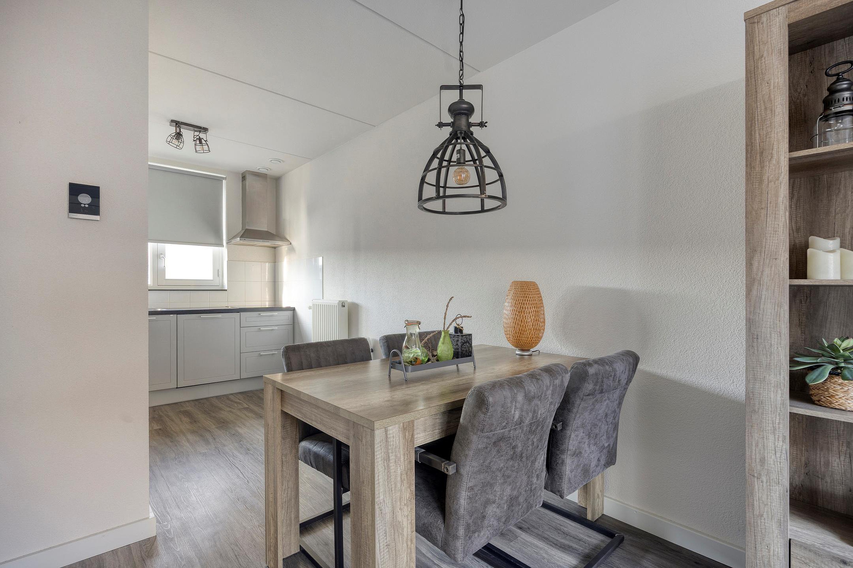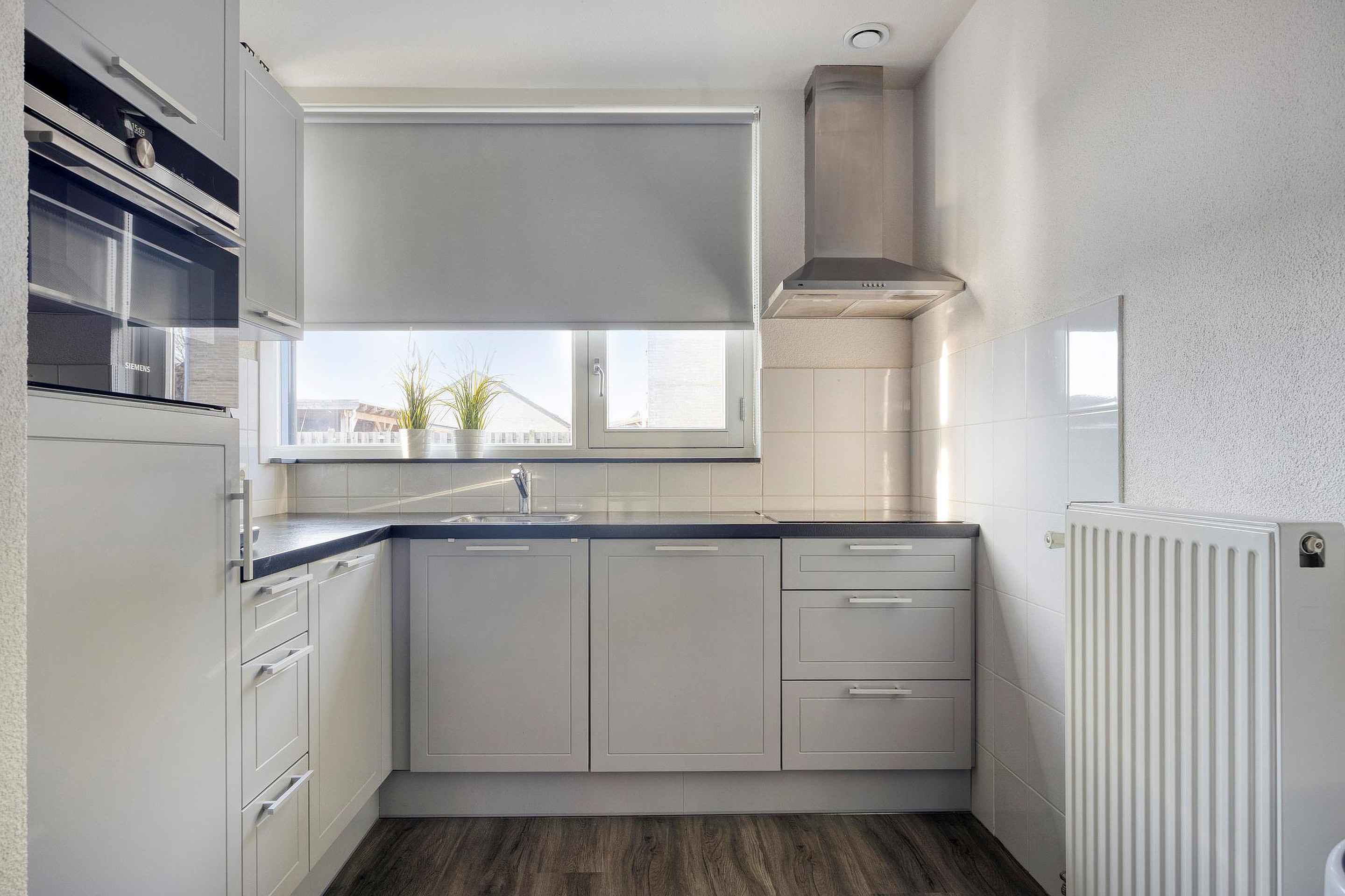 Aan de voorkant - de straatkant - is de keuken. Deze is in 2020 vernieuwd en uitgevoerd in een praktische hoekopstelling. De keuken is compleet uitgerust met een vaatwasser, inductiekookplaat, afzuigkap en koelkast: alles wat je nodig hebt om direct aan de slag te kunnen.